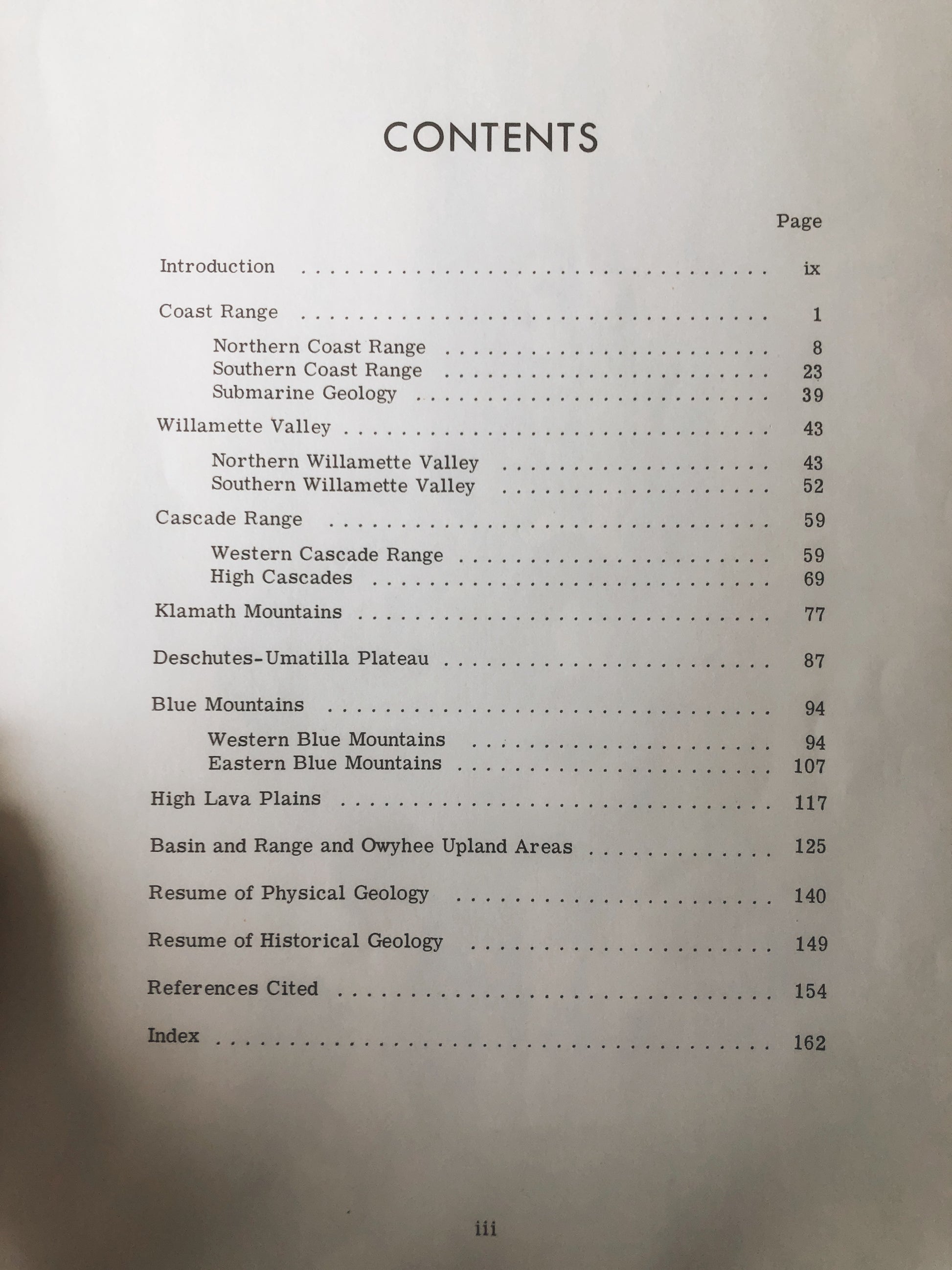 A 1964 edition of the Geology of Oregon. Full of hand drawn illustrations, photos, graphs and charts. Stretching from the time of the dinosaurs all the way up until the present writing of the book. Divided by geographical region