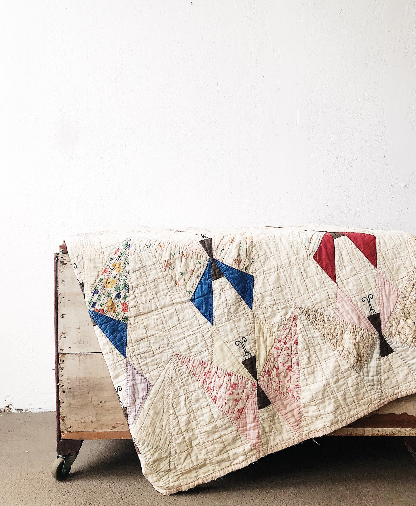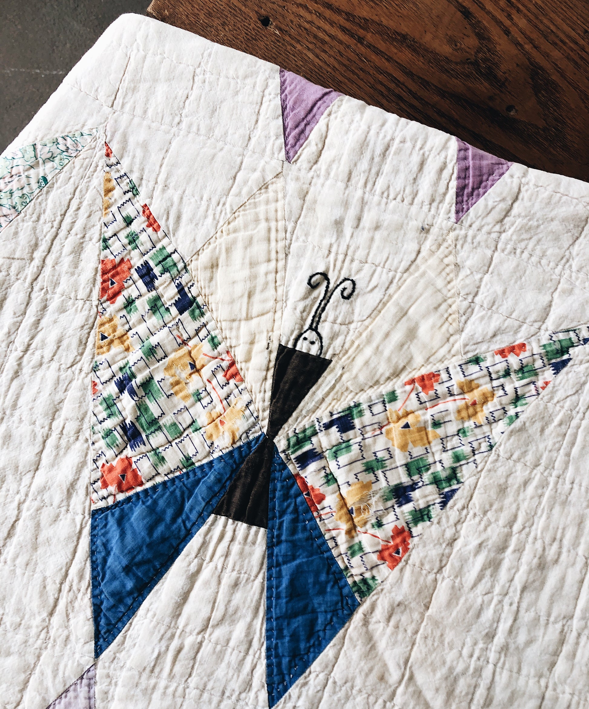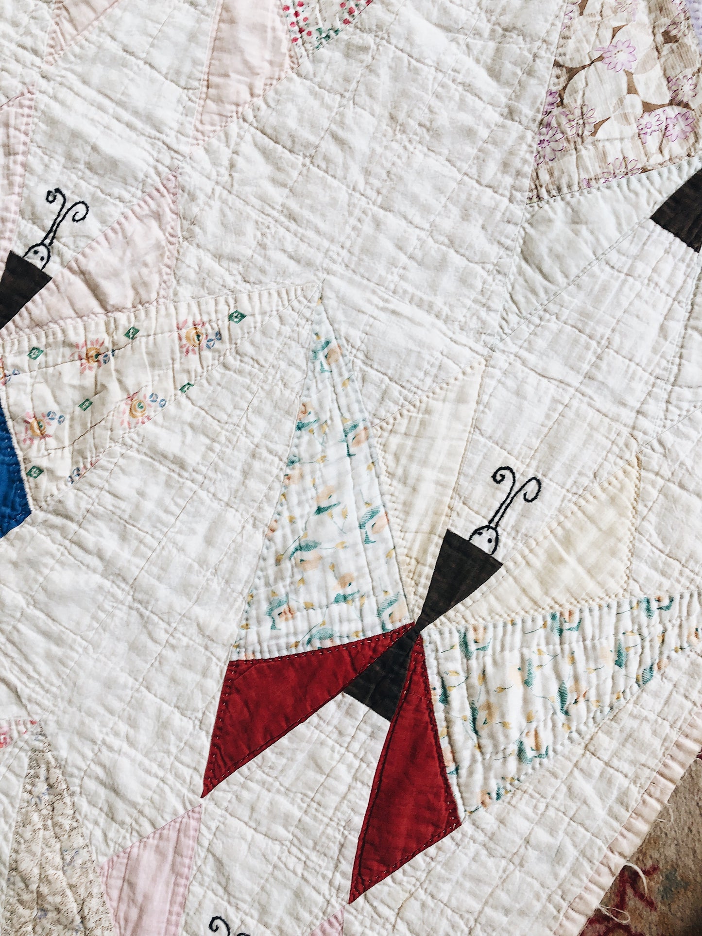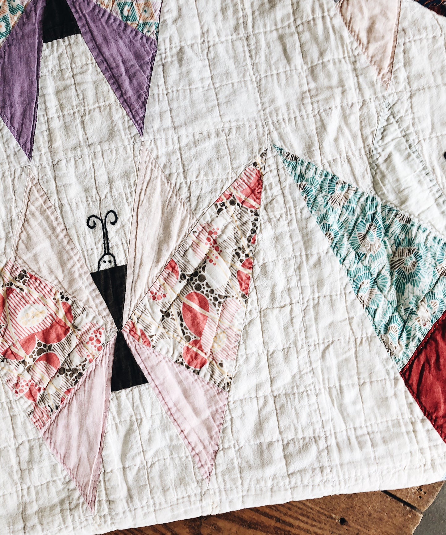 What a lovely job someone did on this vintage butterfly quilt. The shapes remind us of origami. It’s so fun to look through all the fabrics that were used.
