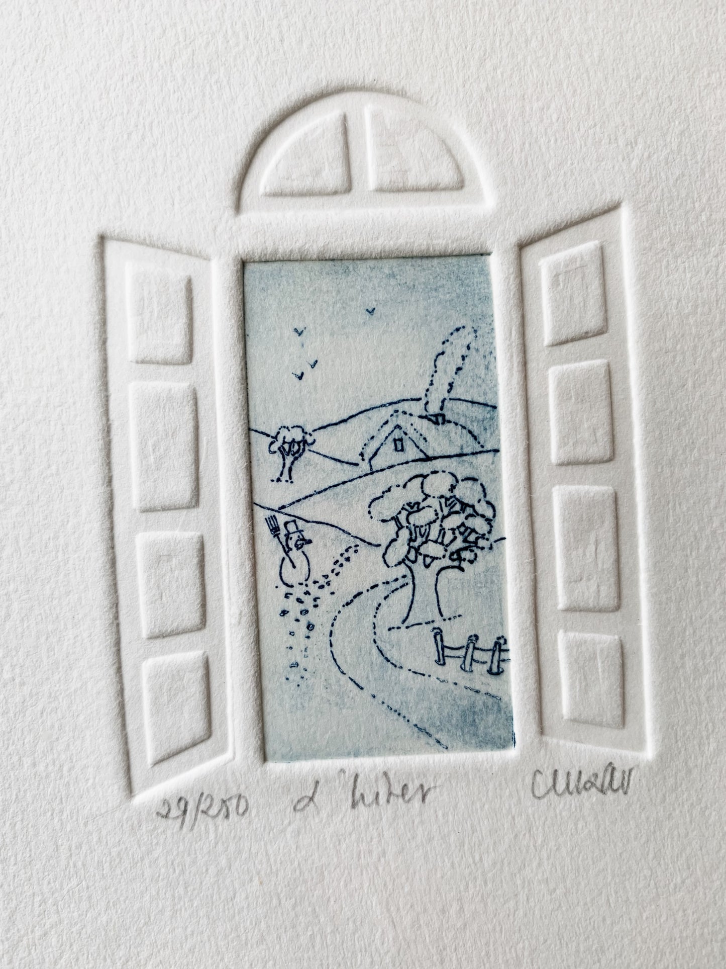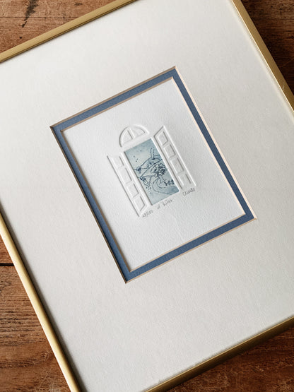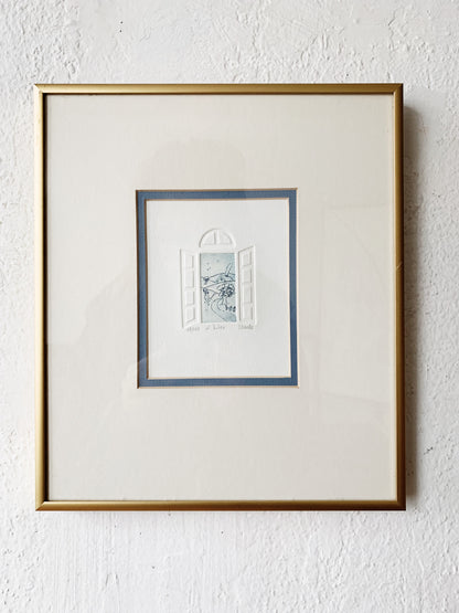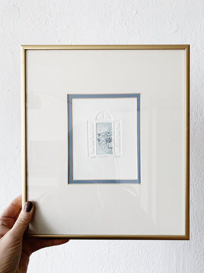 Sweet vintage original art print on Handmade embossed paper. Professionally matted and framed.