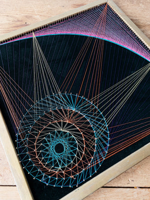 Wonderful vintage original framed string art. On velvet backing, brass nails. Great colors and design. Wood frame.