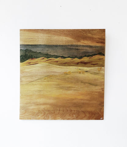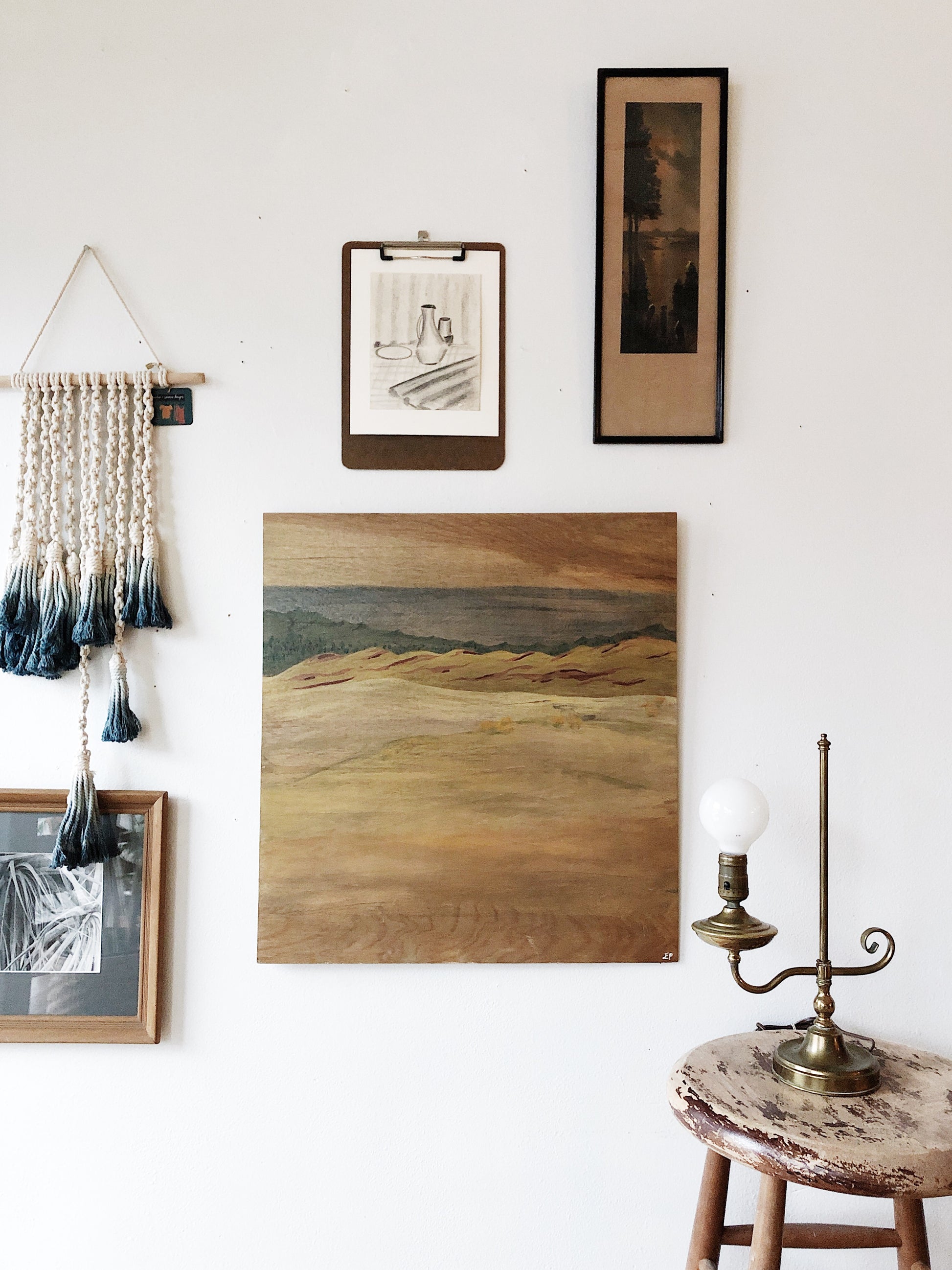 A painted landscape on wood panel. Colors are lovely and neutral and it’s a good size! Signed with hanger in back