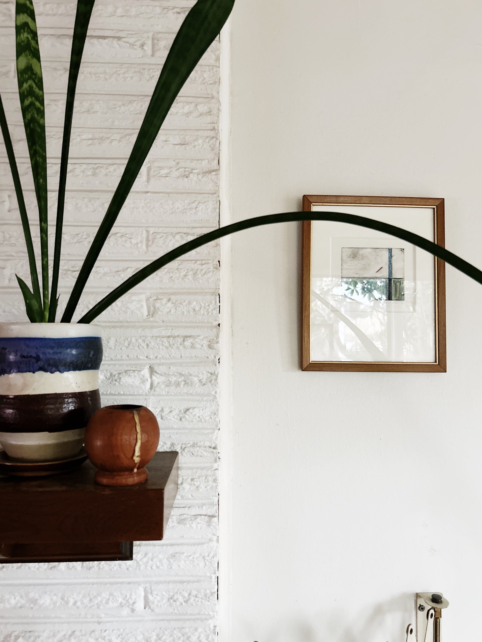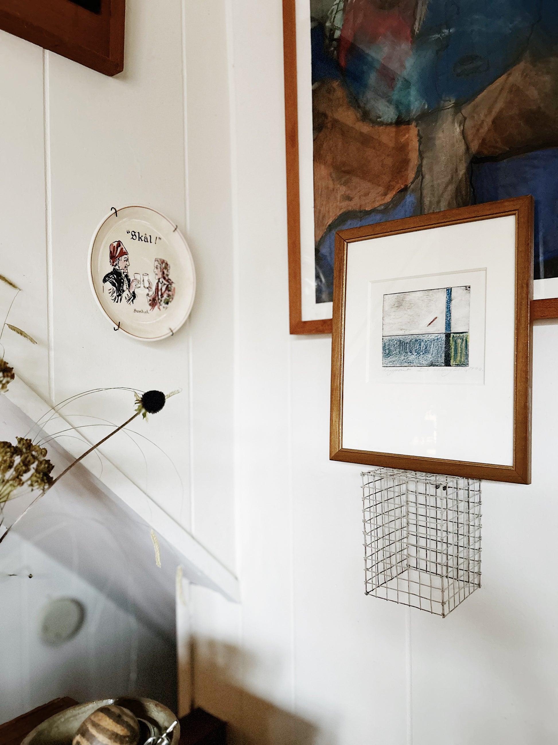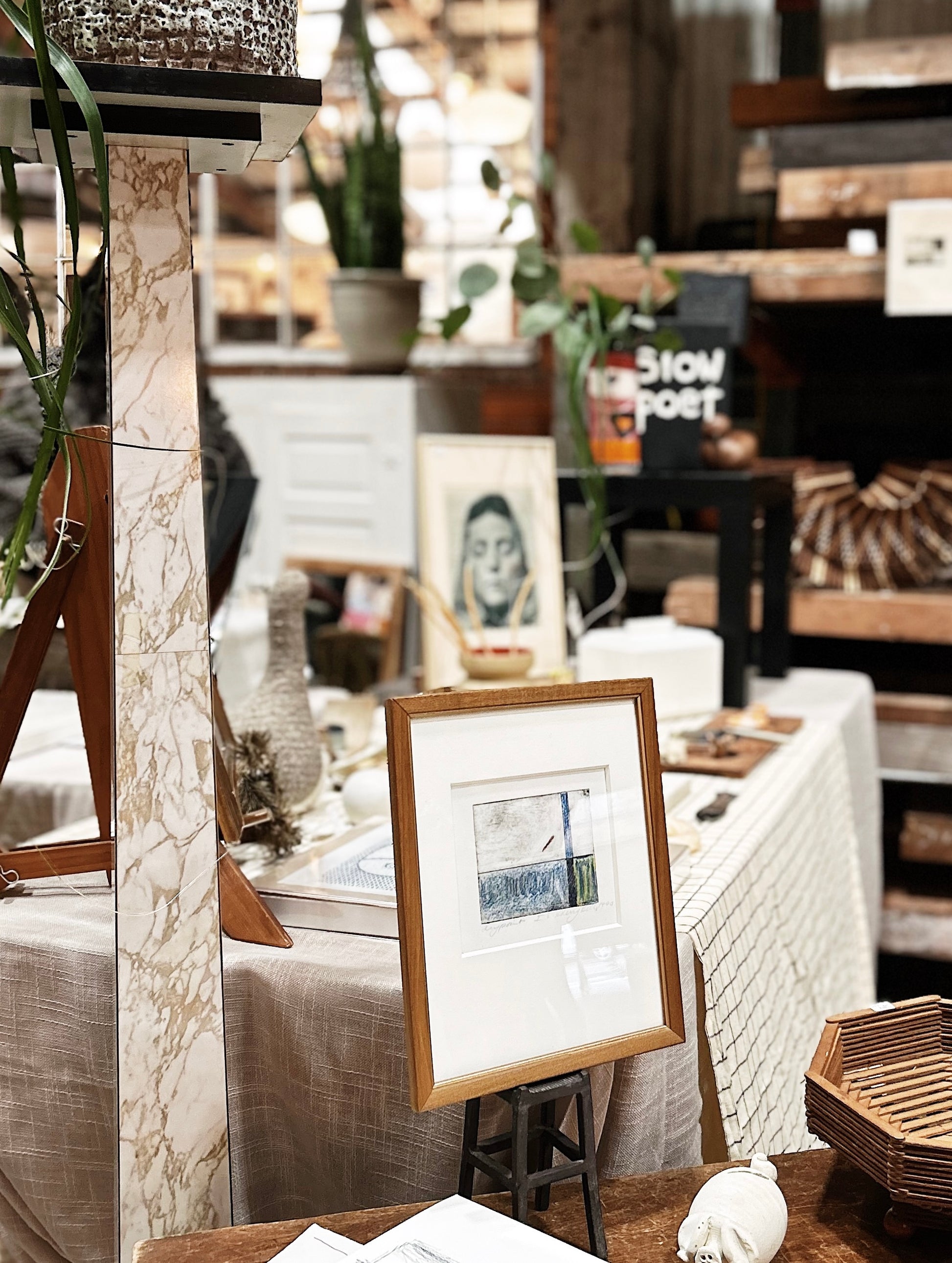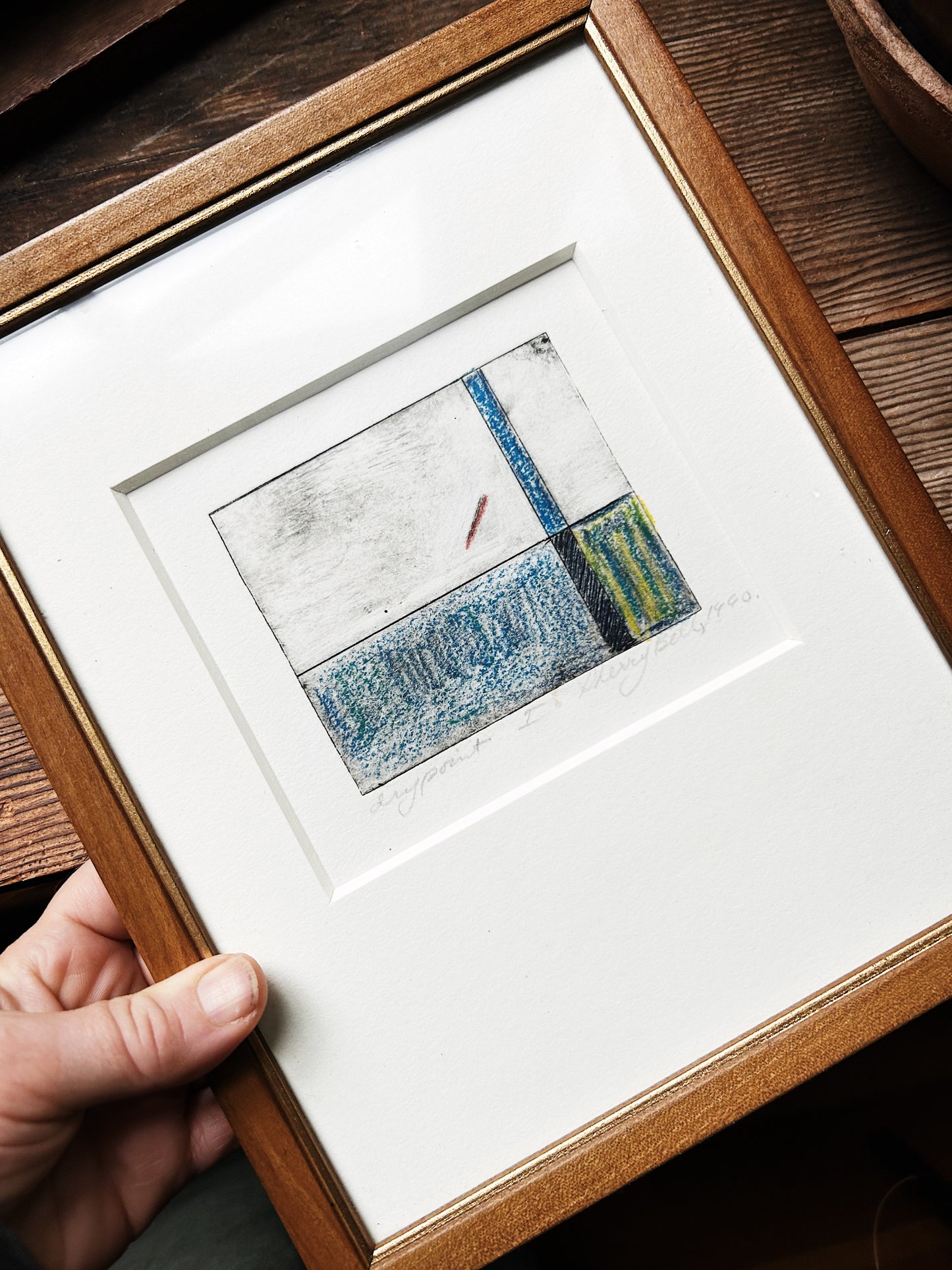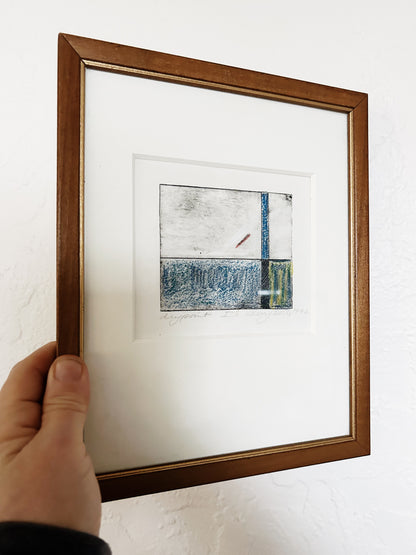 Lovely original mixed media piece by northwest artist Sherry Bell. Etching with oil stick. Framed under glass in simple vintage wood with thin gold leafed fillet. Titled Drypoint 1, dated 1990 and signed by artist.