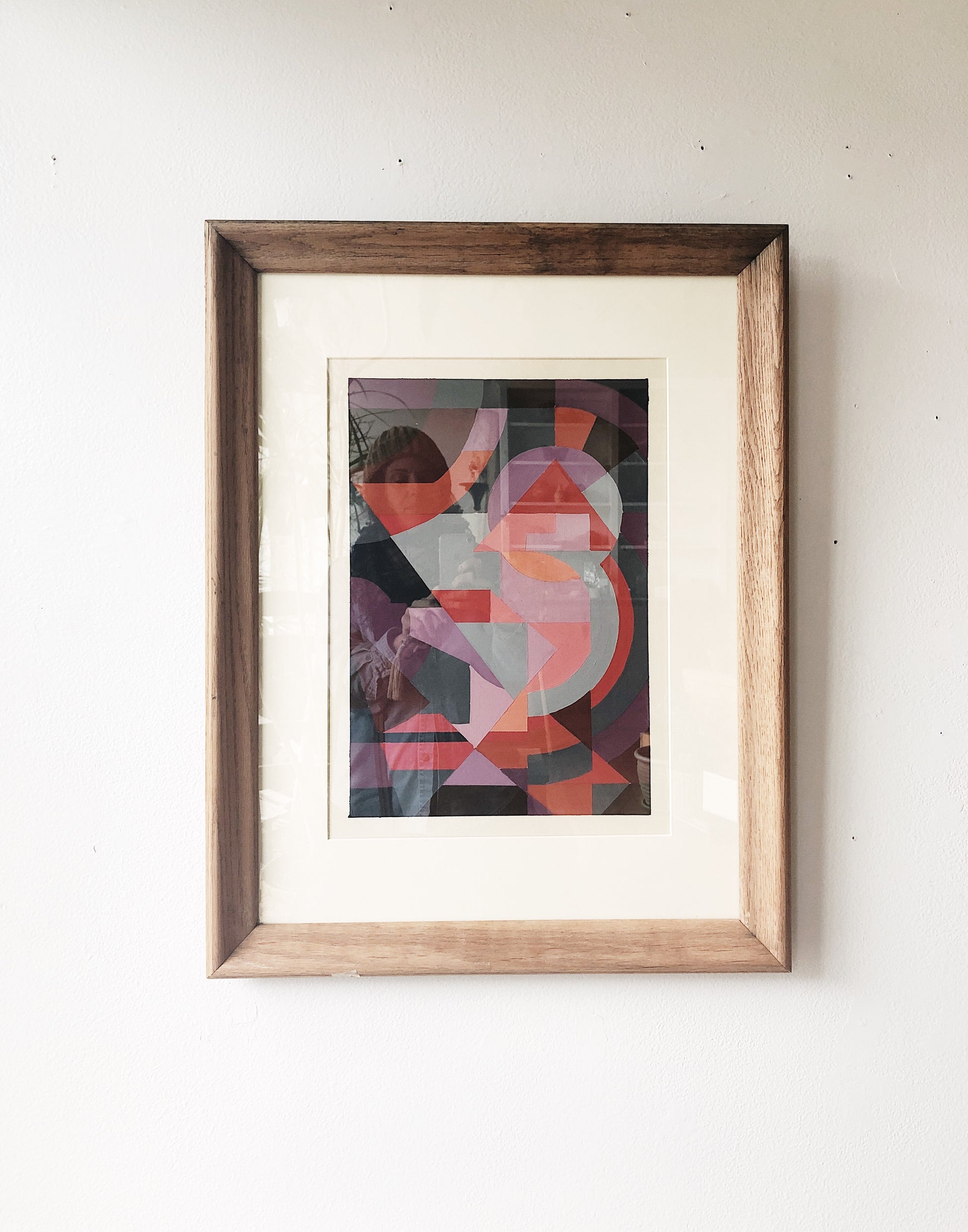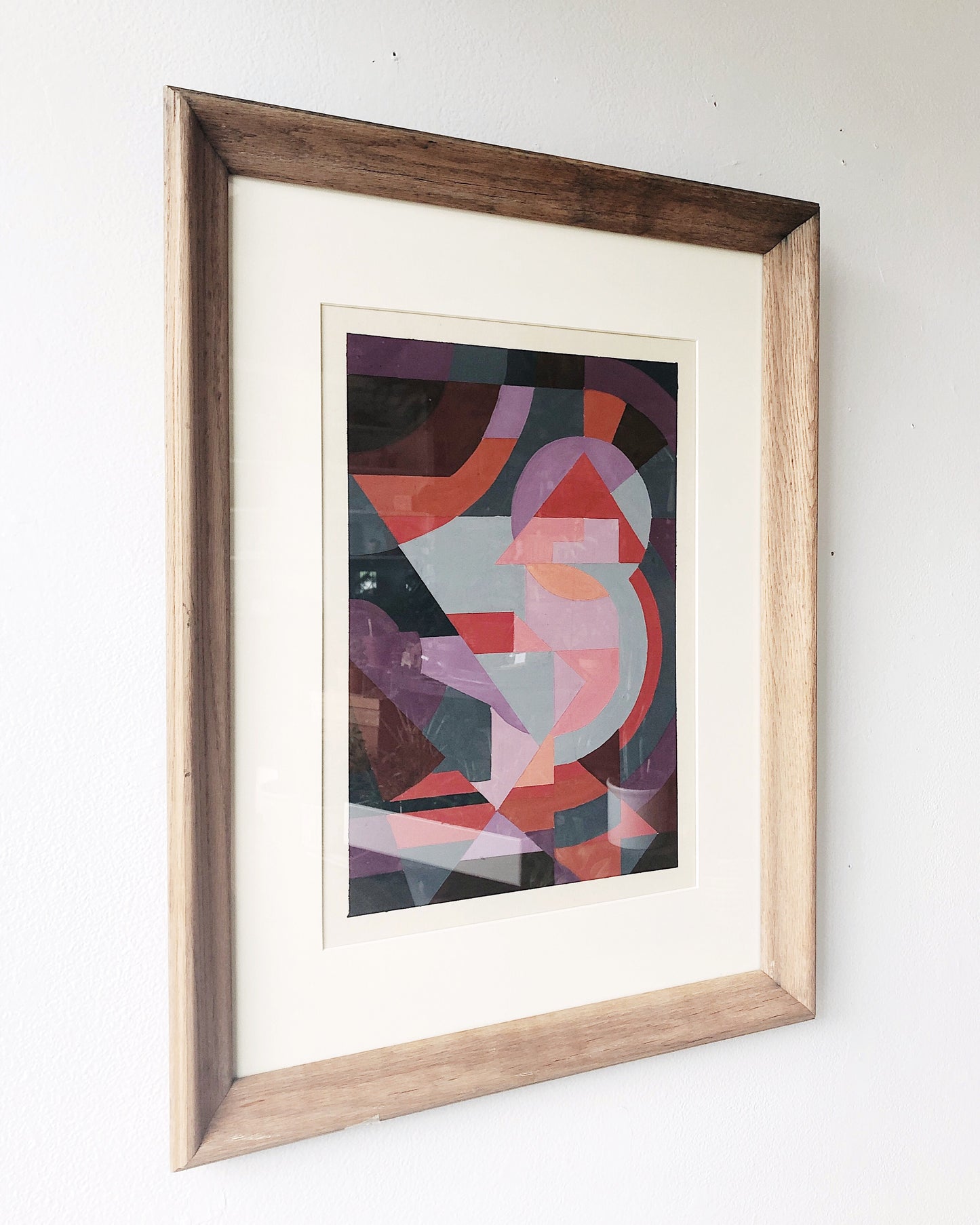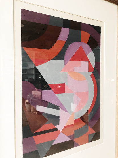 An original 1970s mixed media collage of acrylic paint and cut paper. Framed in old wood and glass. Vivid colors!