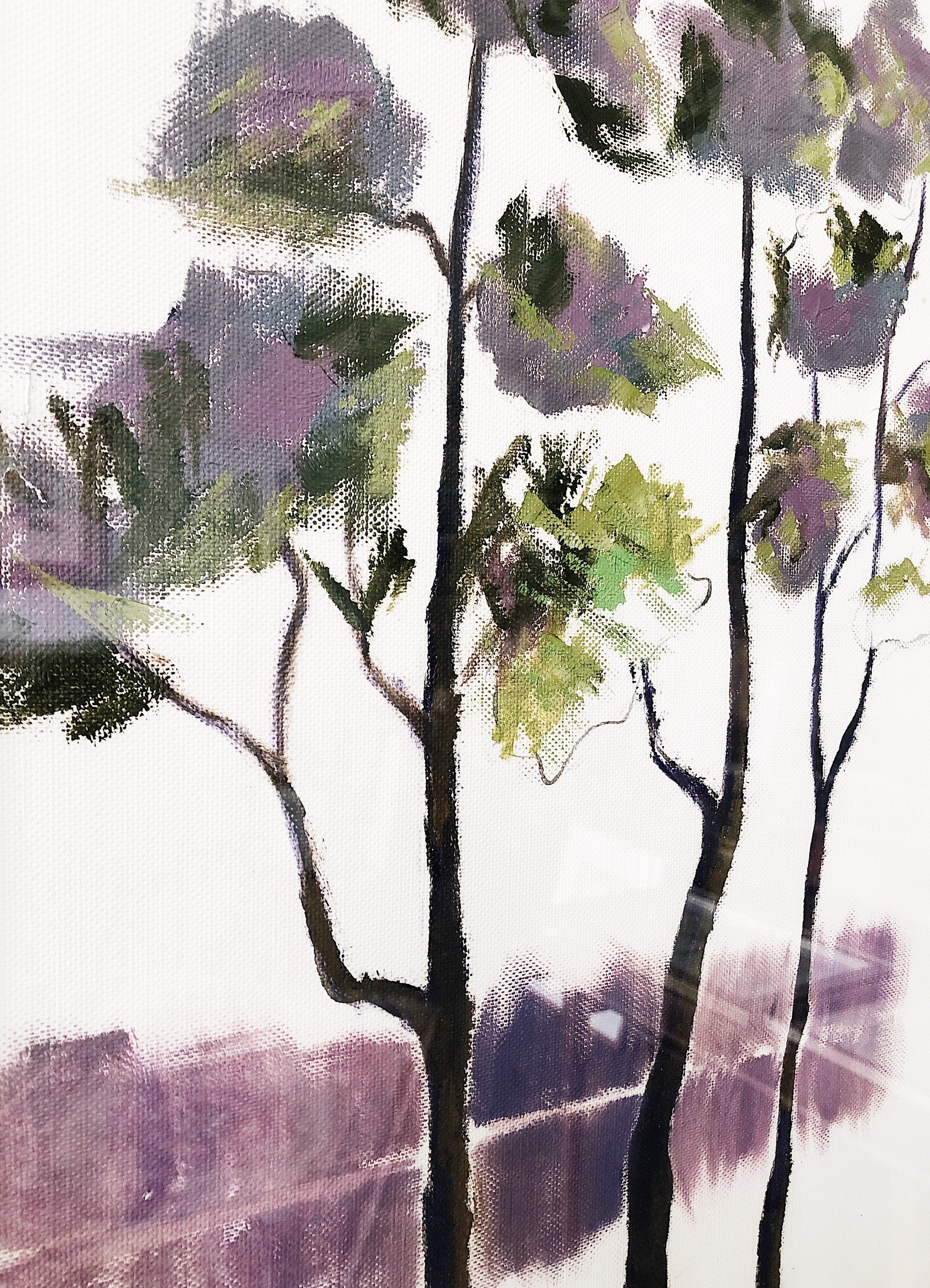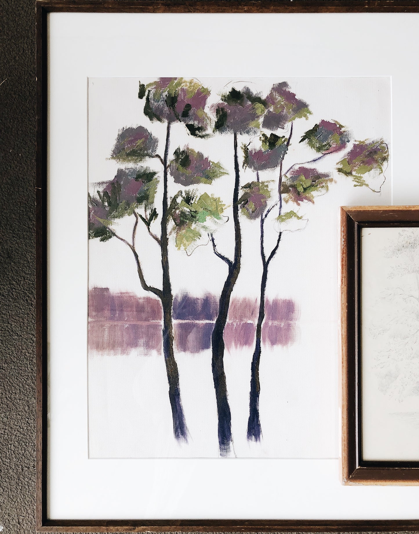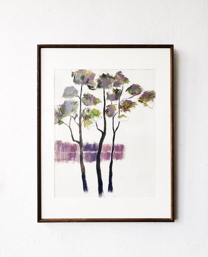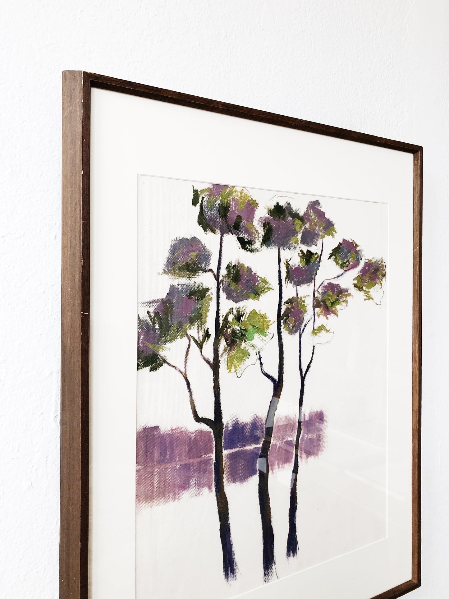 A vintage original painting in a series of trees that we’ve been collecting. Oil on canvas, resembling a watercolor. Large simple modern wood frame. Under glass