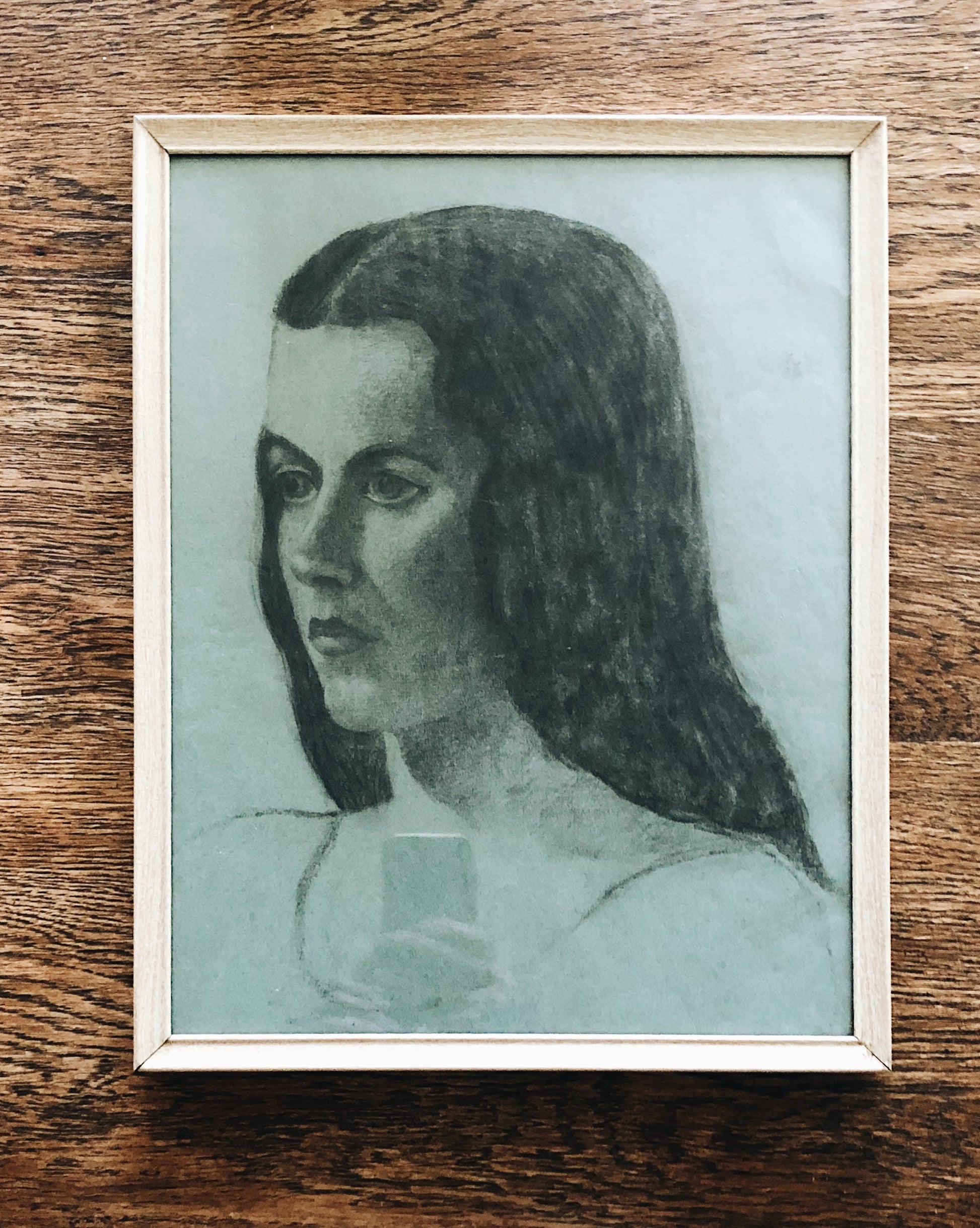 Beautiful portrait drawing framed in metal faux bois under glass. Charcoal on paper. No hanger presently