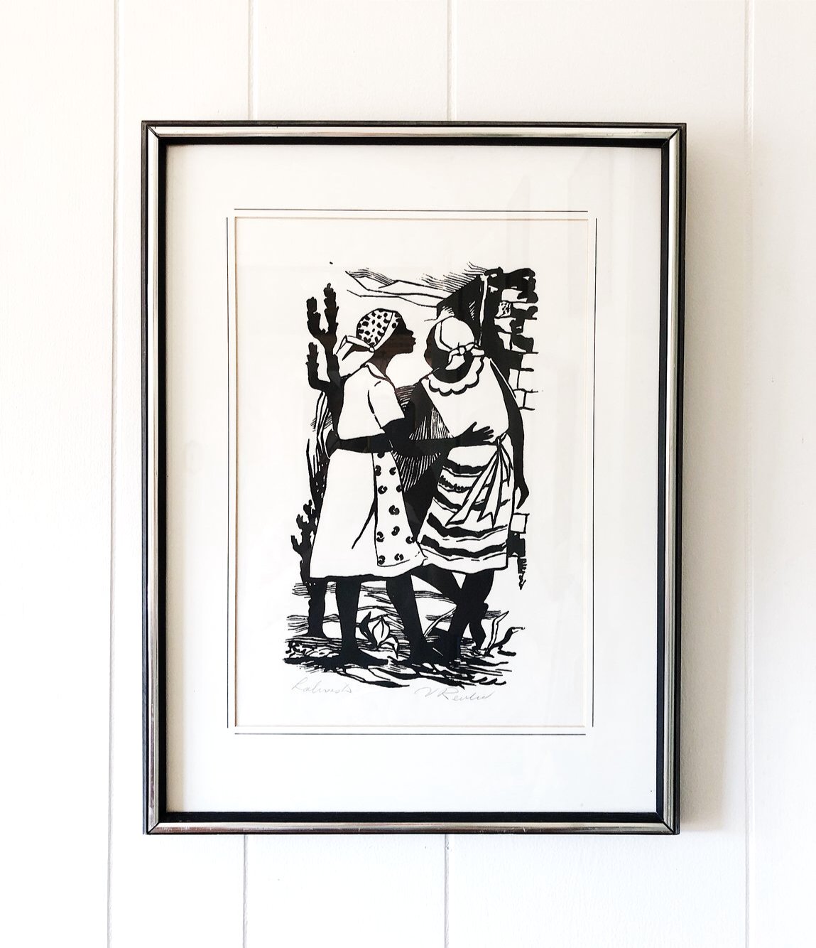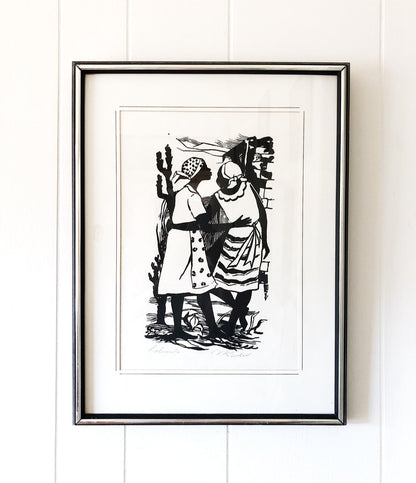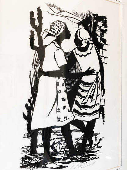 Beautiful signed lithograph. Two girls enjoying each other’s company among the cacti