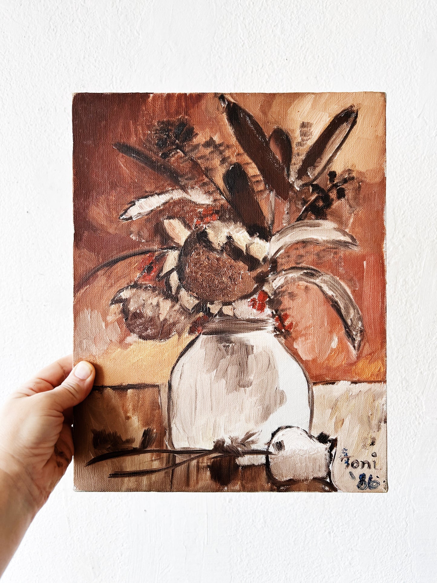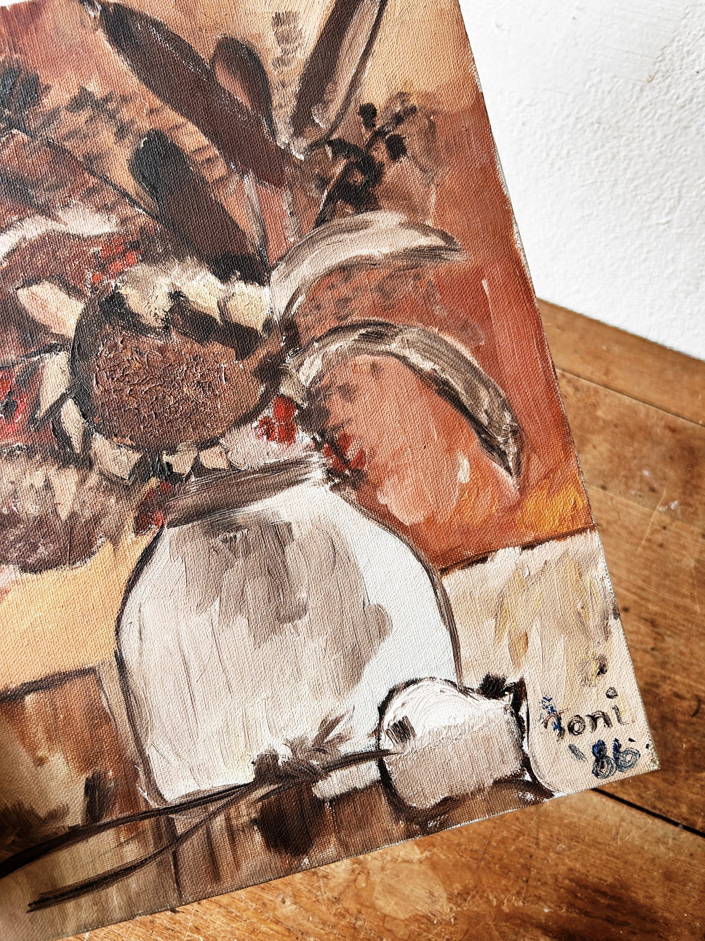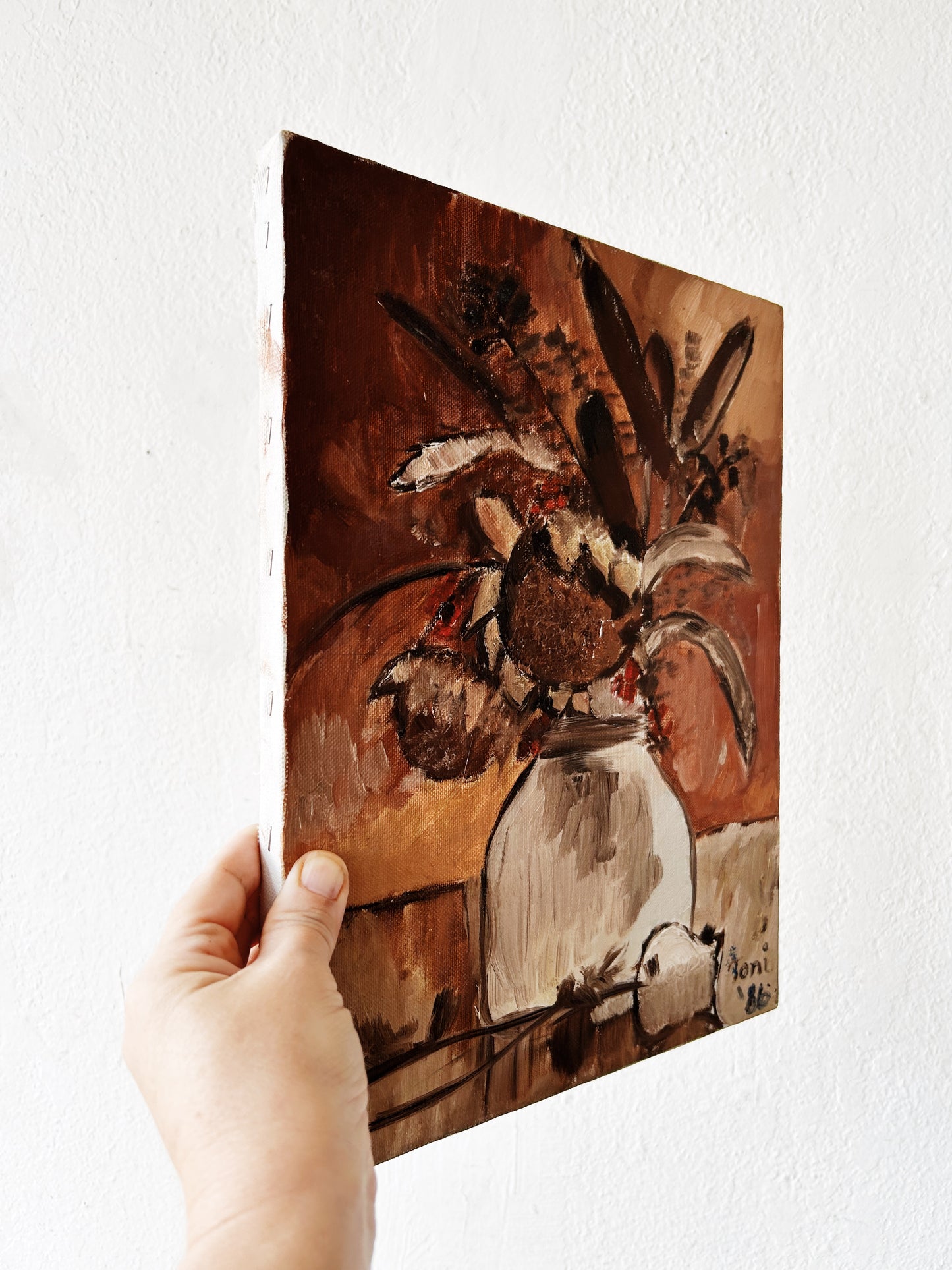 Earthy original still life painting. Acrylic on stretched linen canvas. Signed and dated