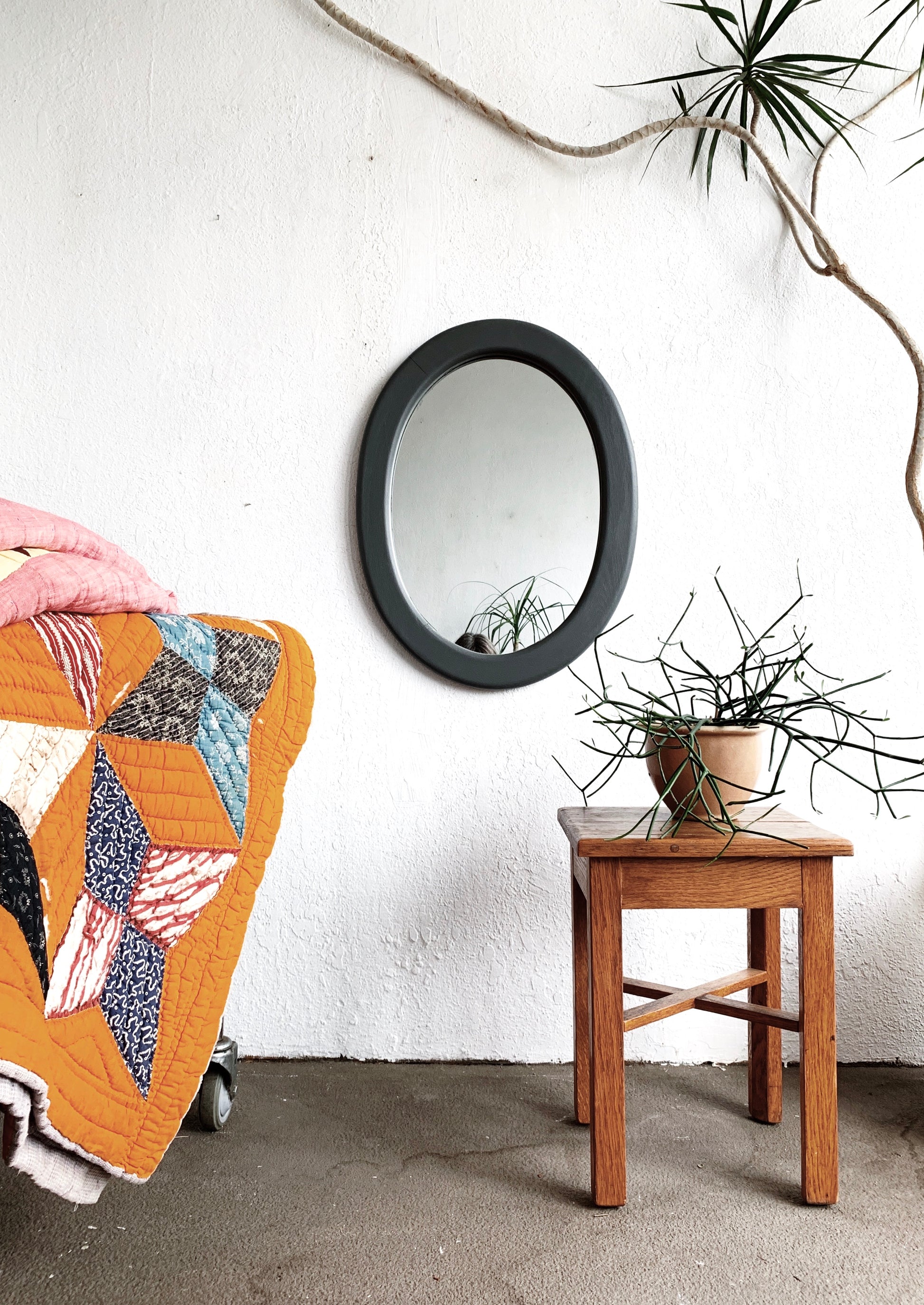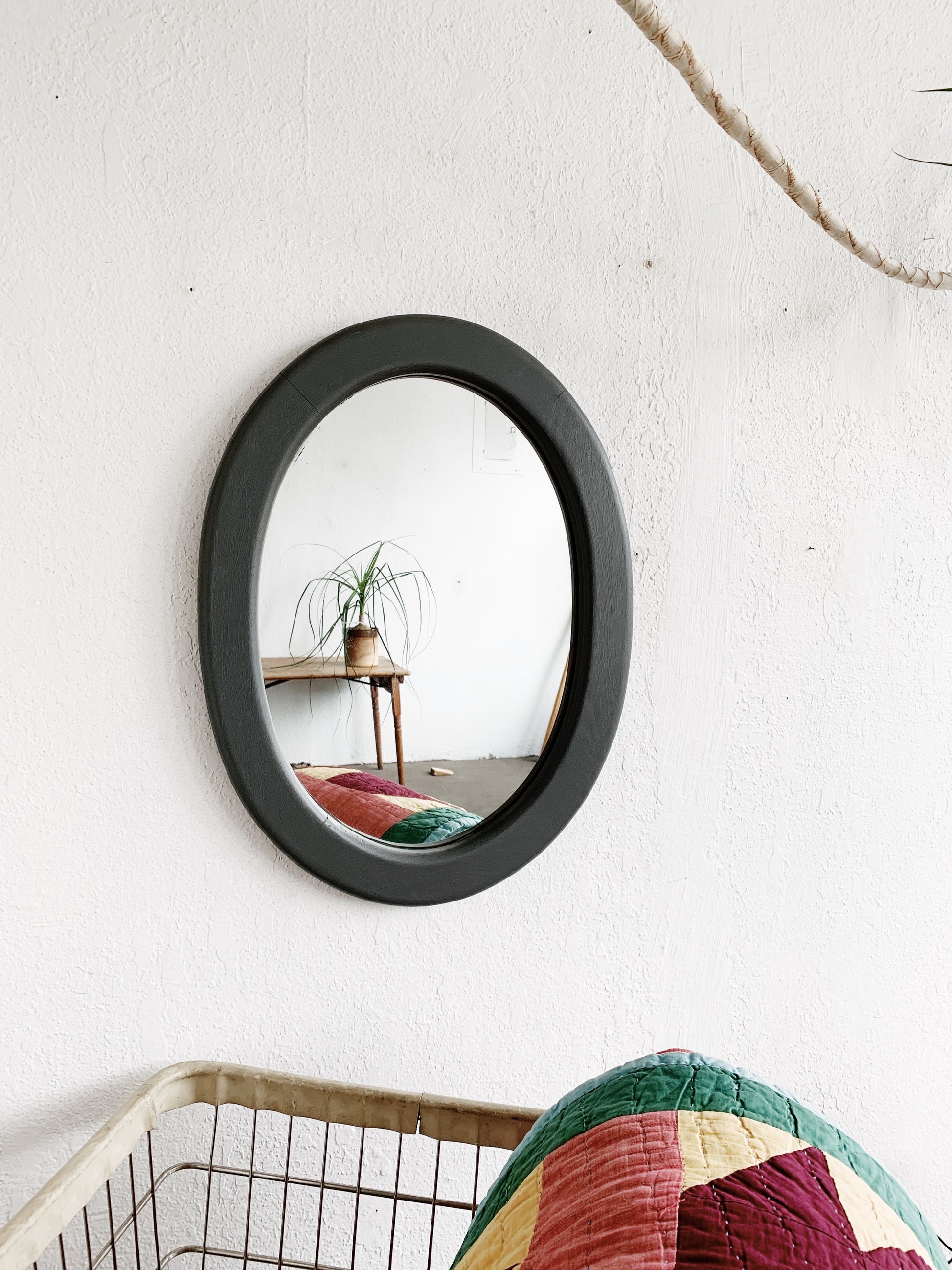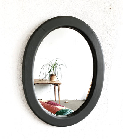 Simple oval oak mirror painted flat grey. Has some weight to it.