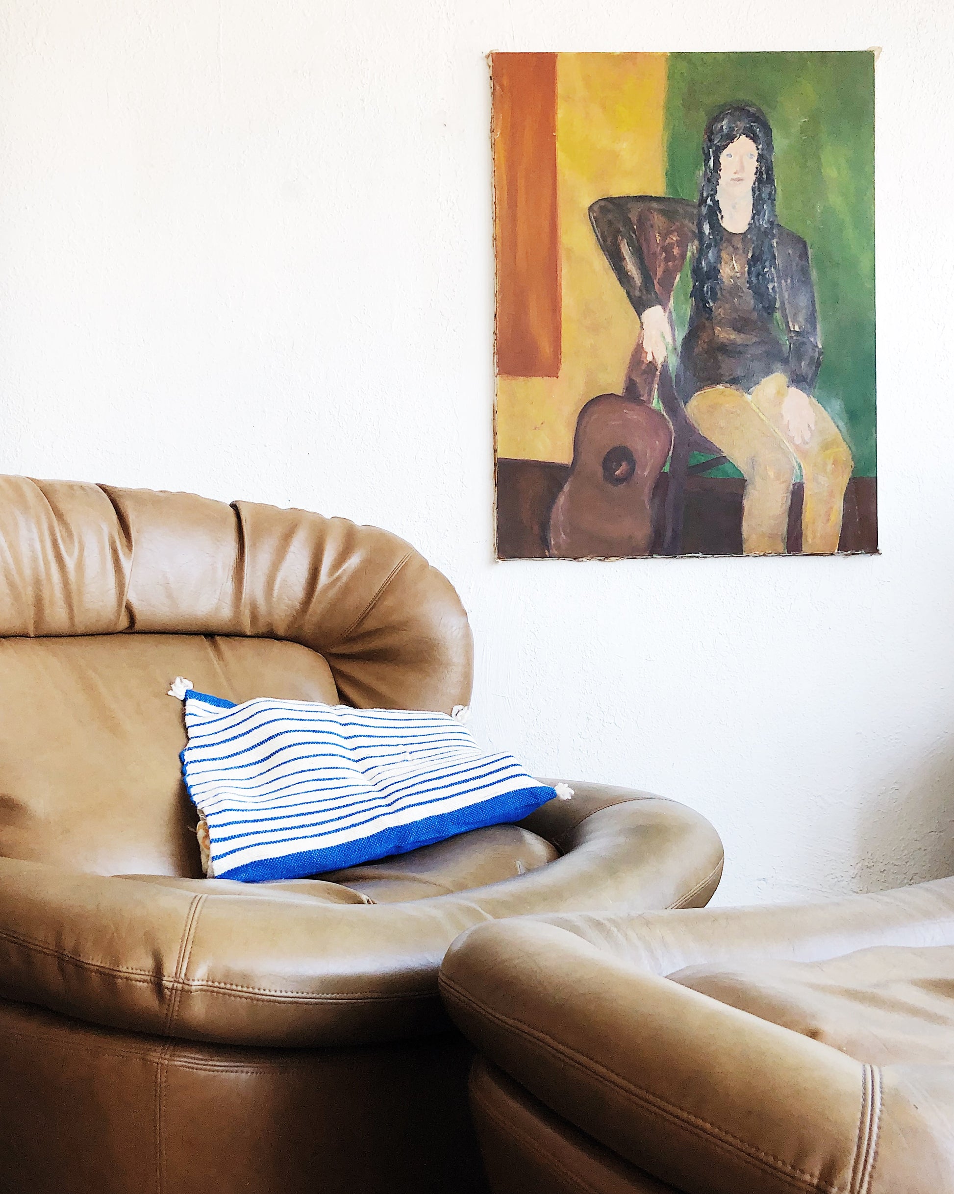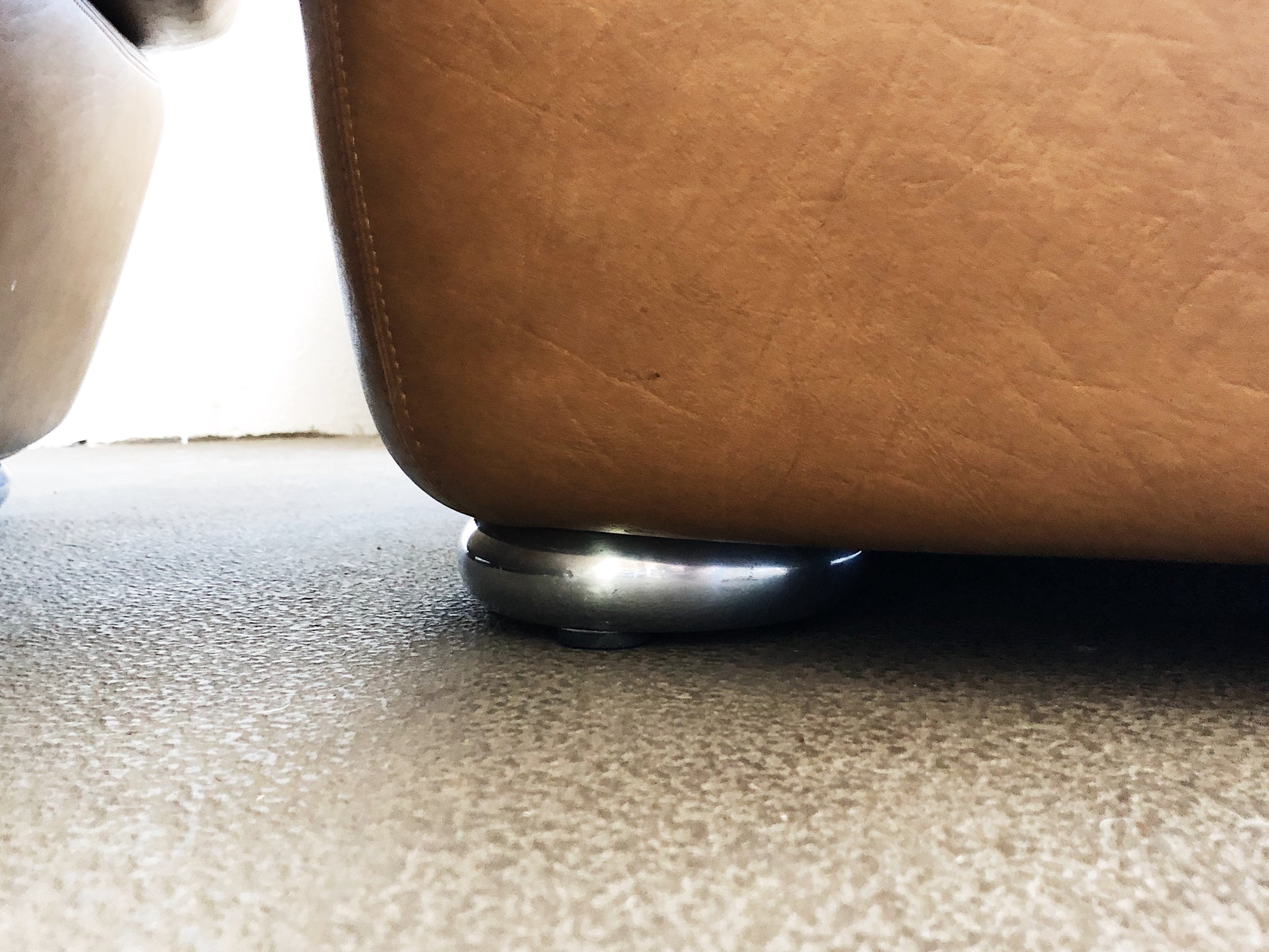 Super cool late seventies / early eighties vibes with this Naugahyde chair and ottoman. Low slung. Chrome bun feet. Yes it’s as comfy as it looks