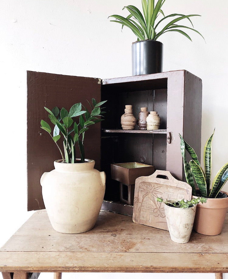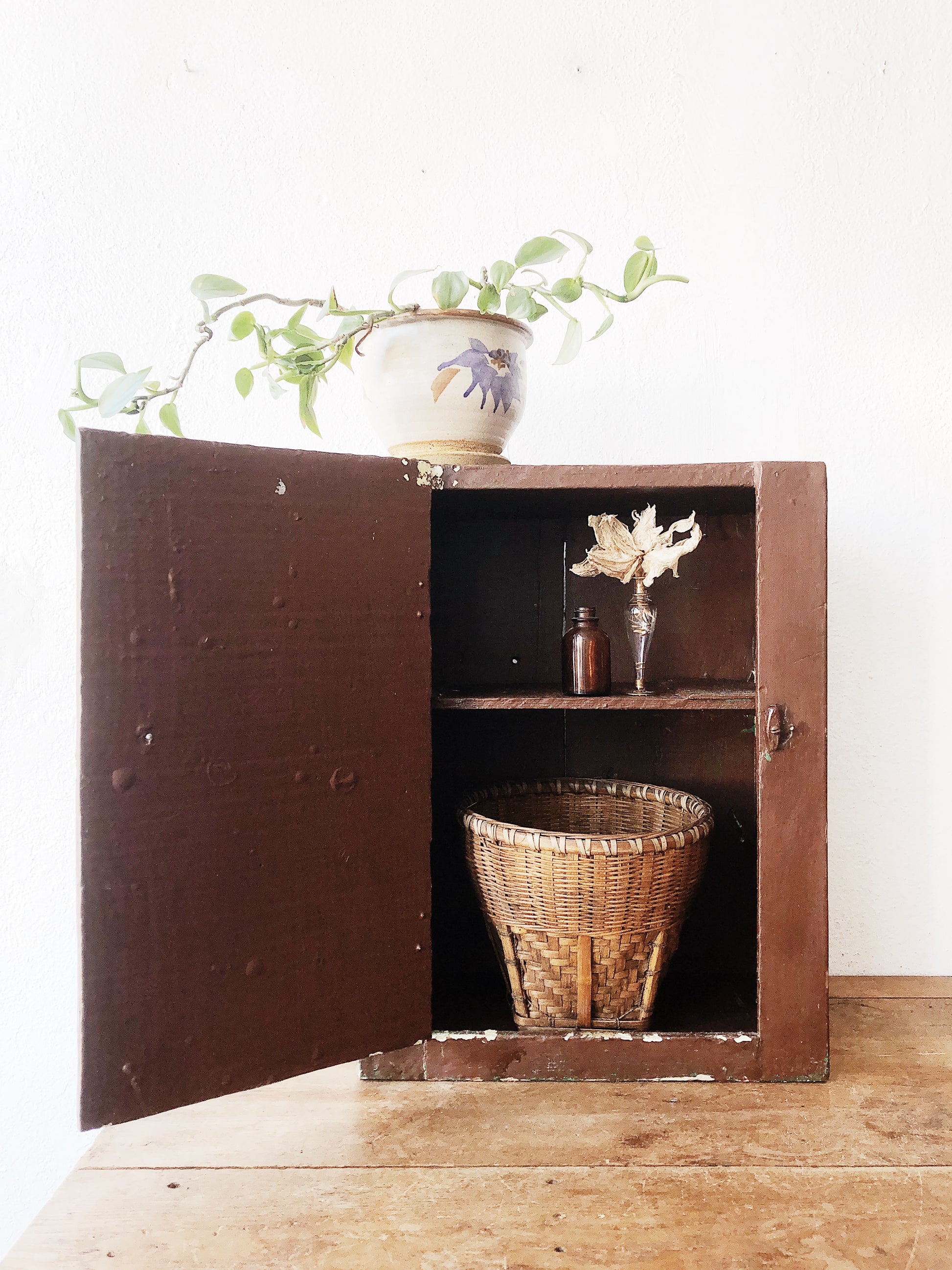 A salvaged painted cabinet that’s perfect for a small potting shed or medicine cabinet. Painted brown with under layers of green. The door front has wear however it could be taken off or displayed open. It doesn’t bother us and adds to the rustic nature