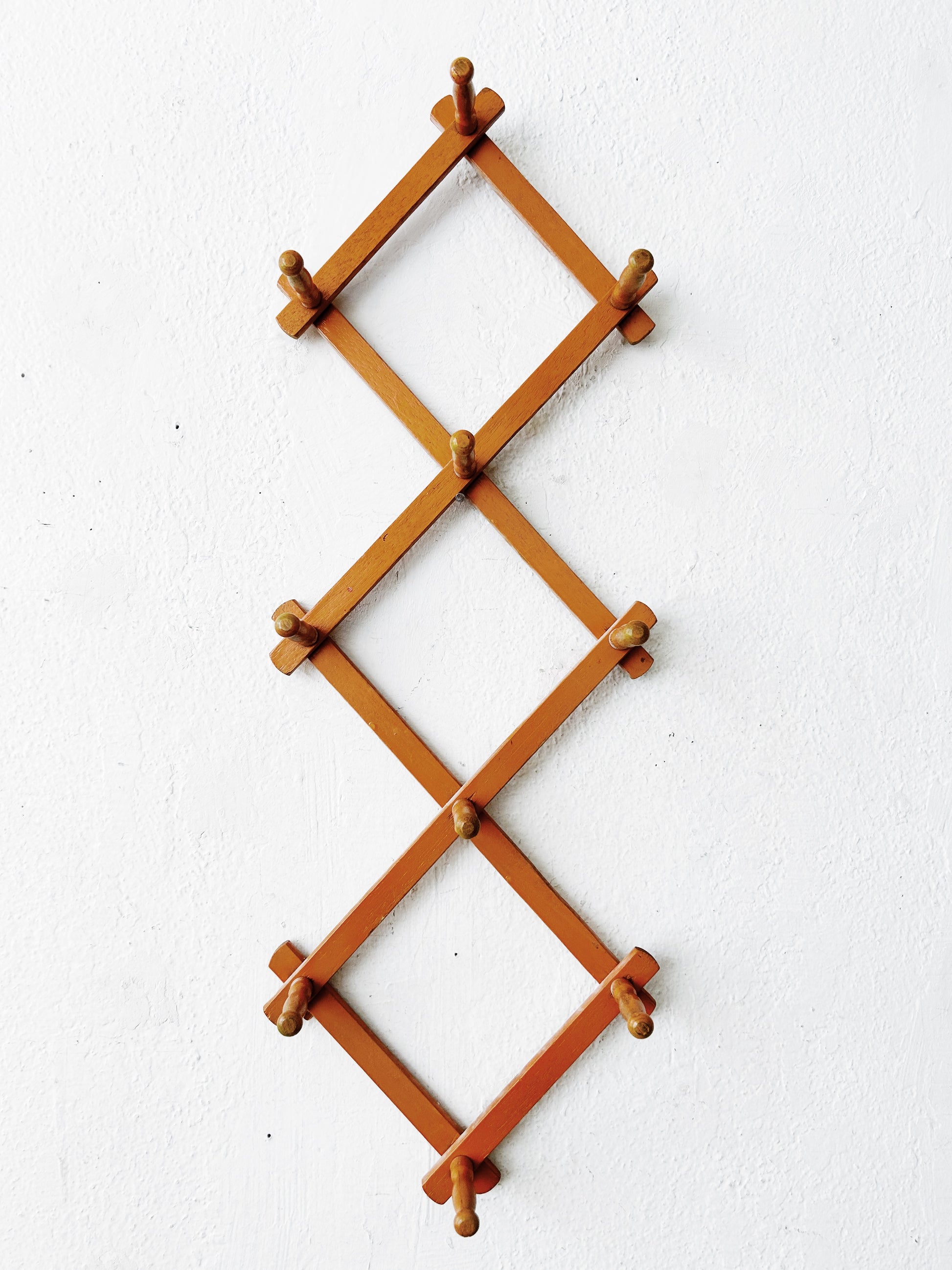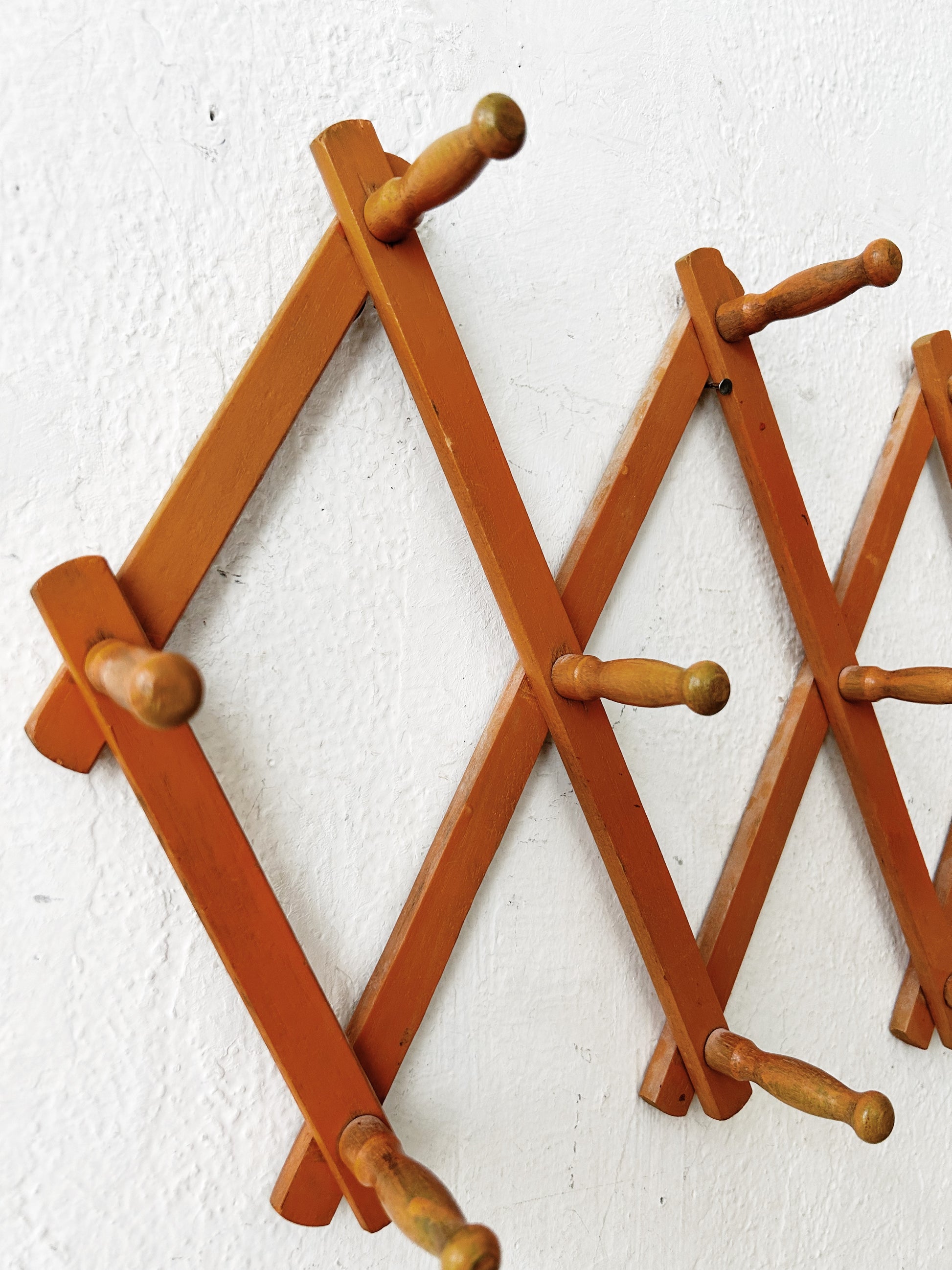 Classic vintage wooden peg rack with metal hangers on back. Made in Hong Kong. Painted a very good shade of orange. Has 10 pegs.