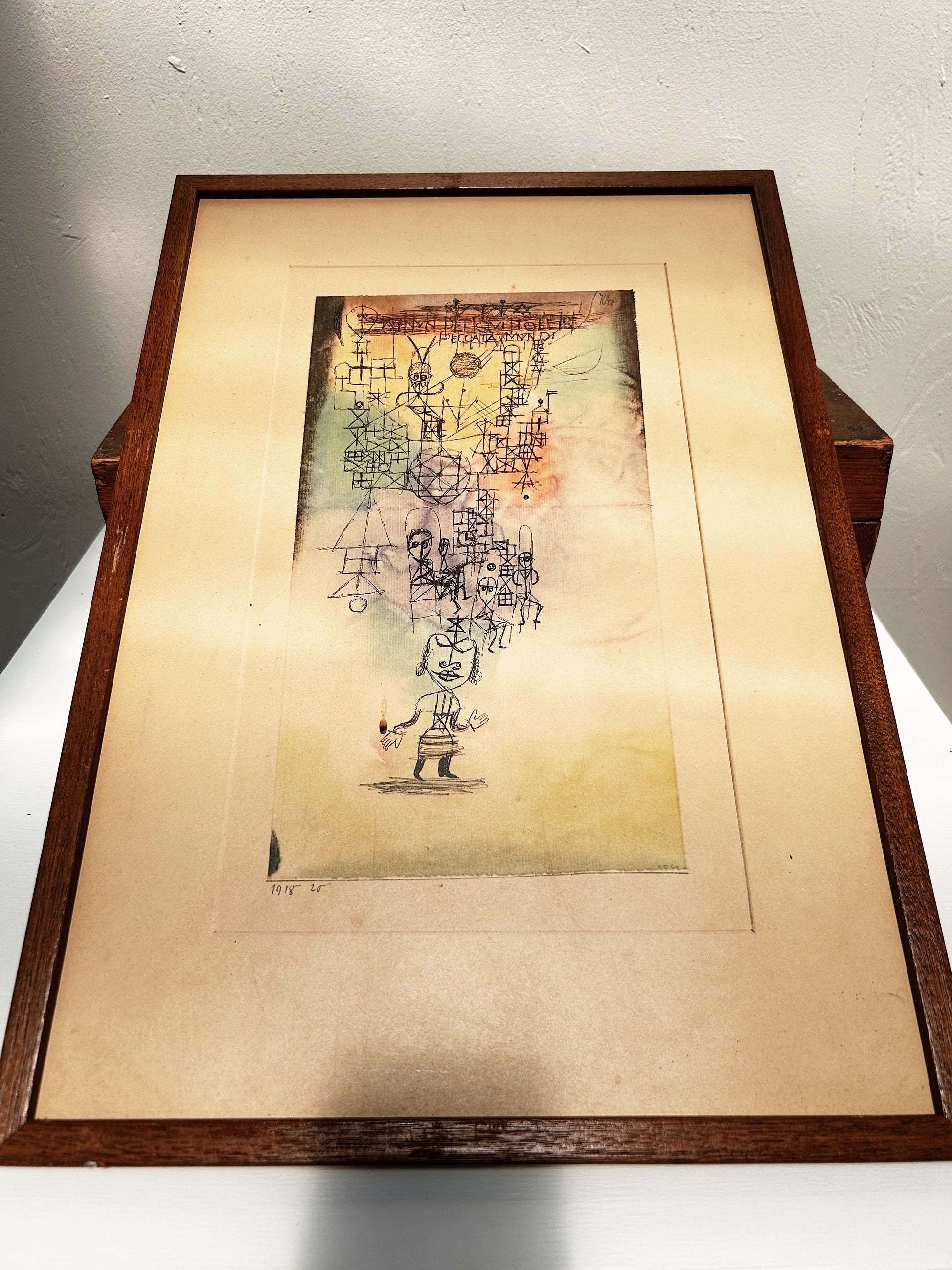 German Lithographic print of the original 1918 Paul Klee work 'Agnus Dei'. Wonderfully cubist rendition with nice coloration. Signed in print. Framed in wood. No glass. Germany