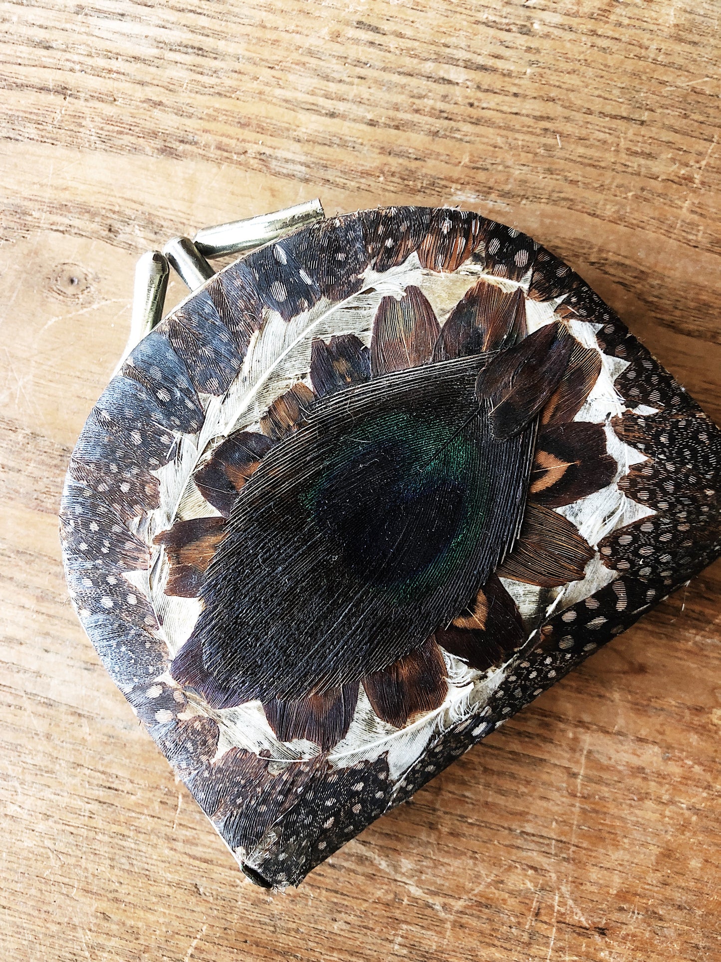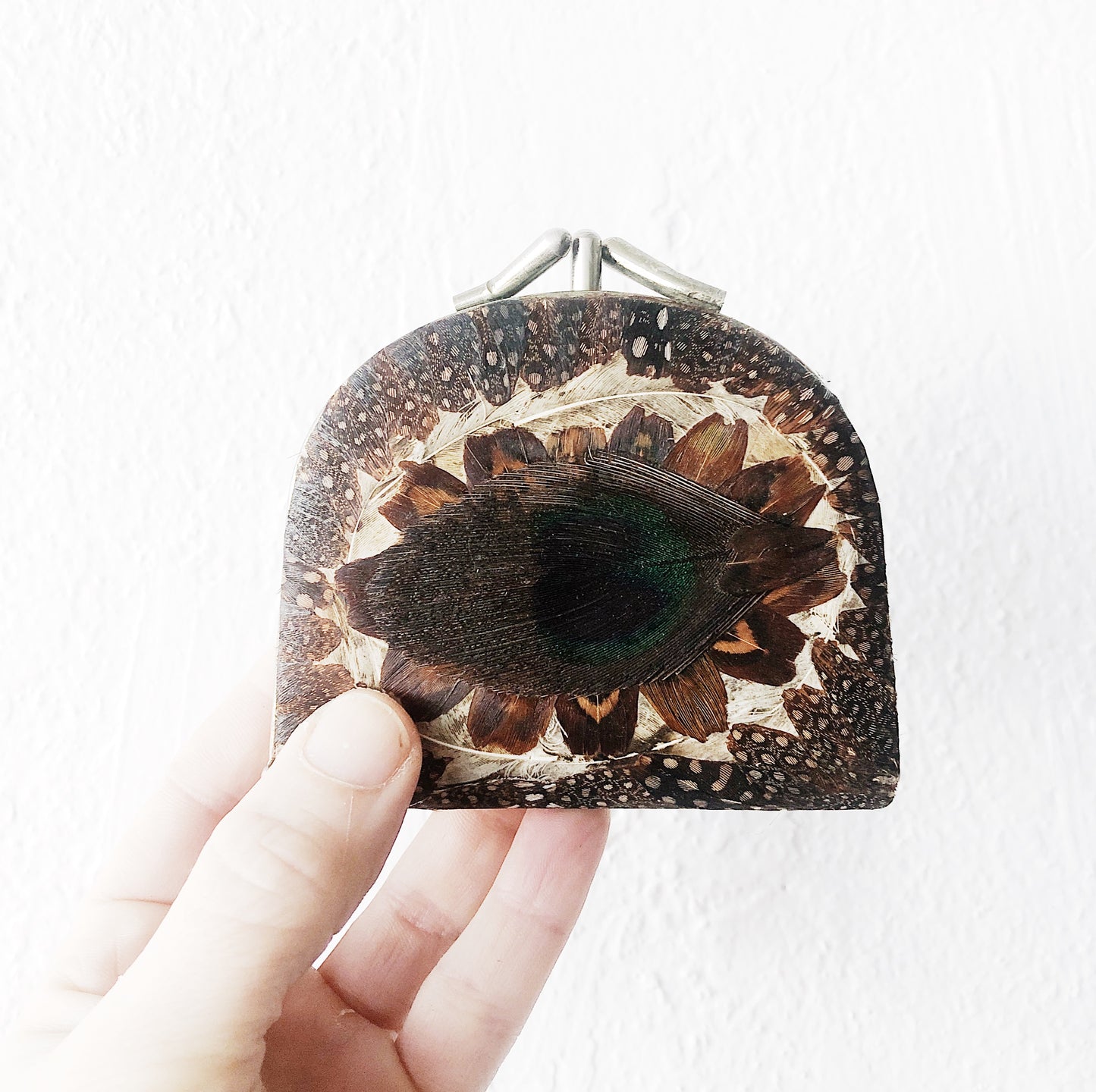 Very old early 1900s change purse. Hand stitched peacock feathers and silk lining