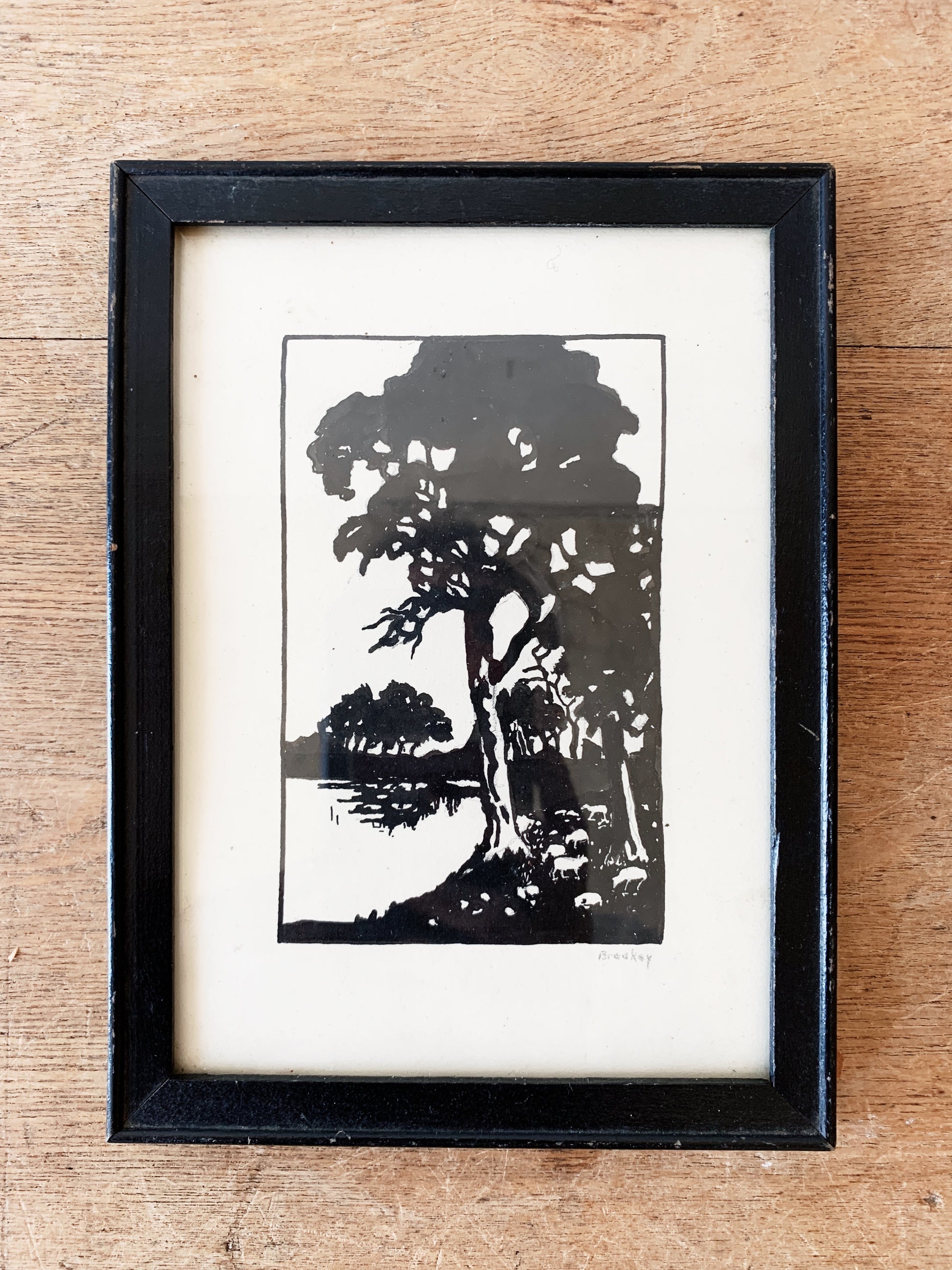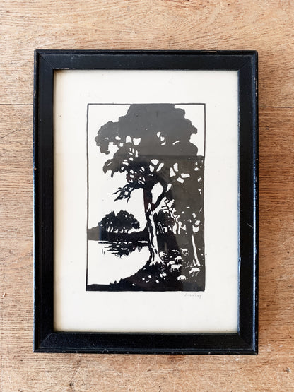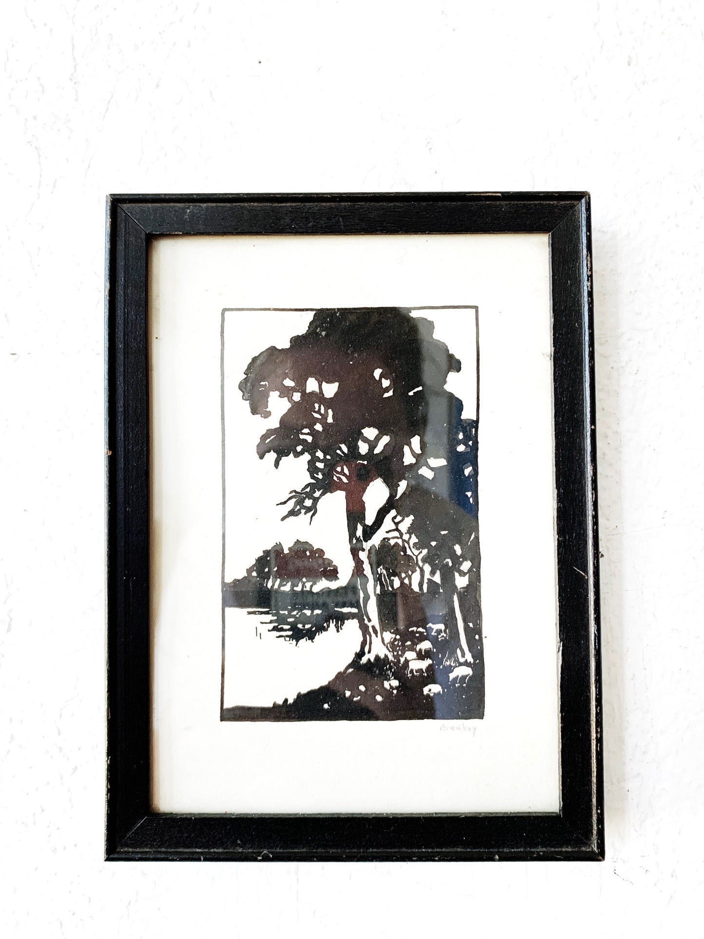 Wonderful signed pen and ink landscape in wood frame under glass. Signed.