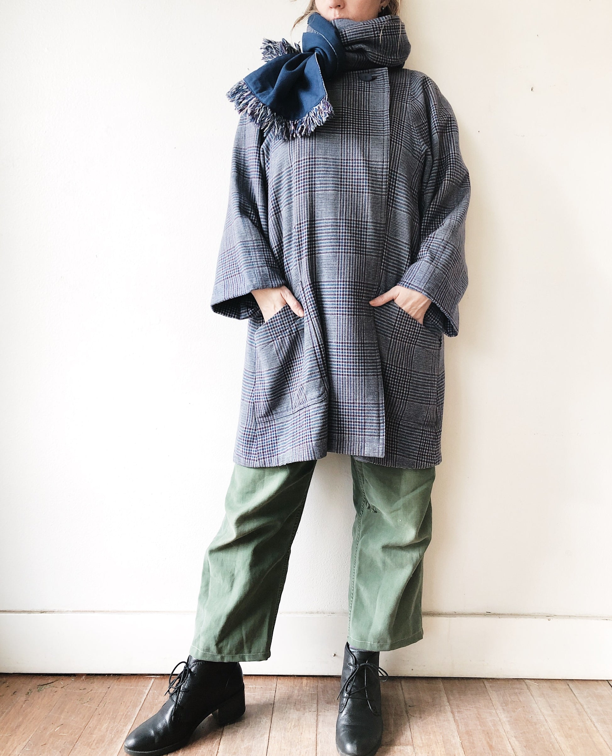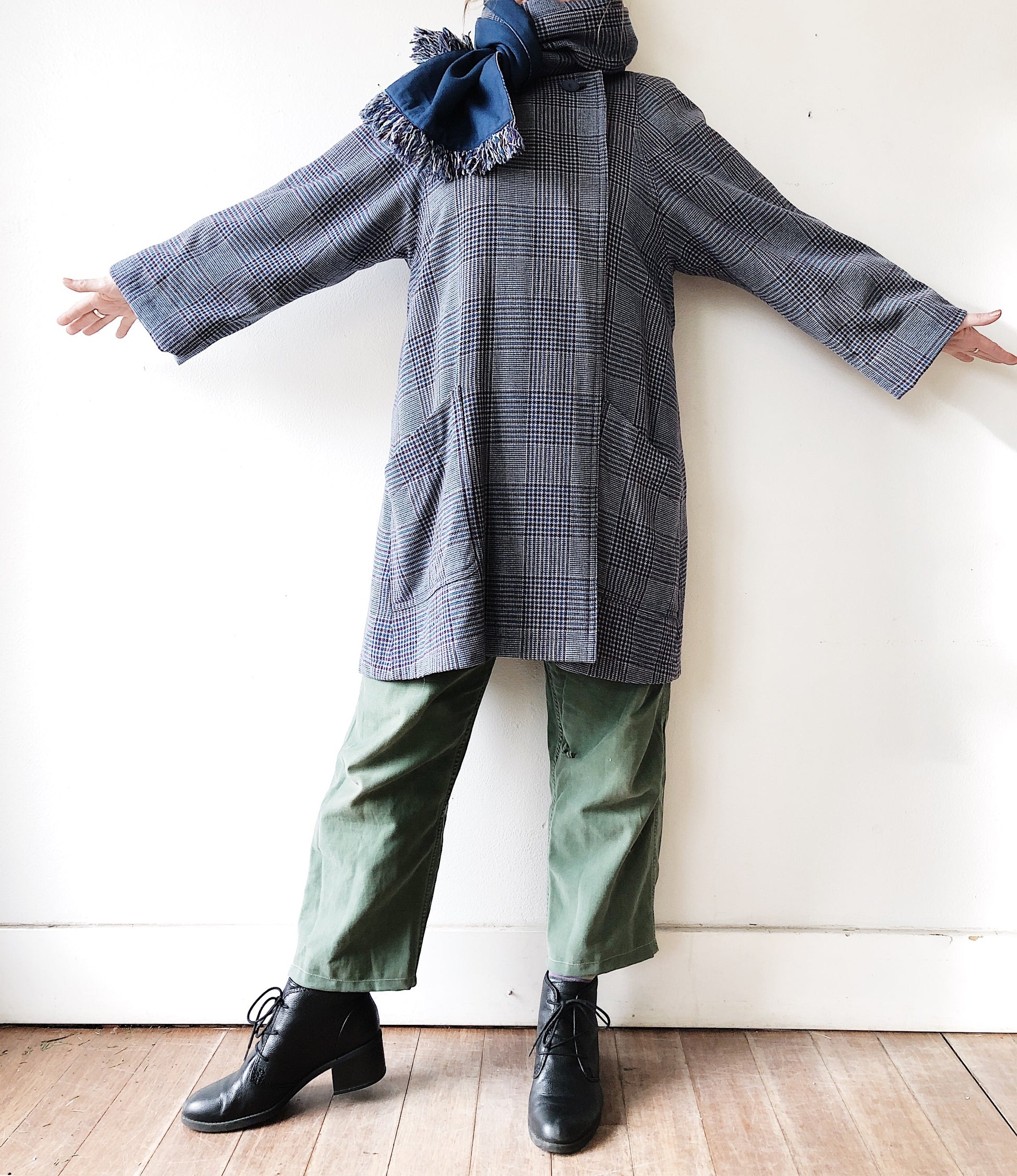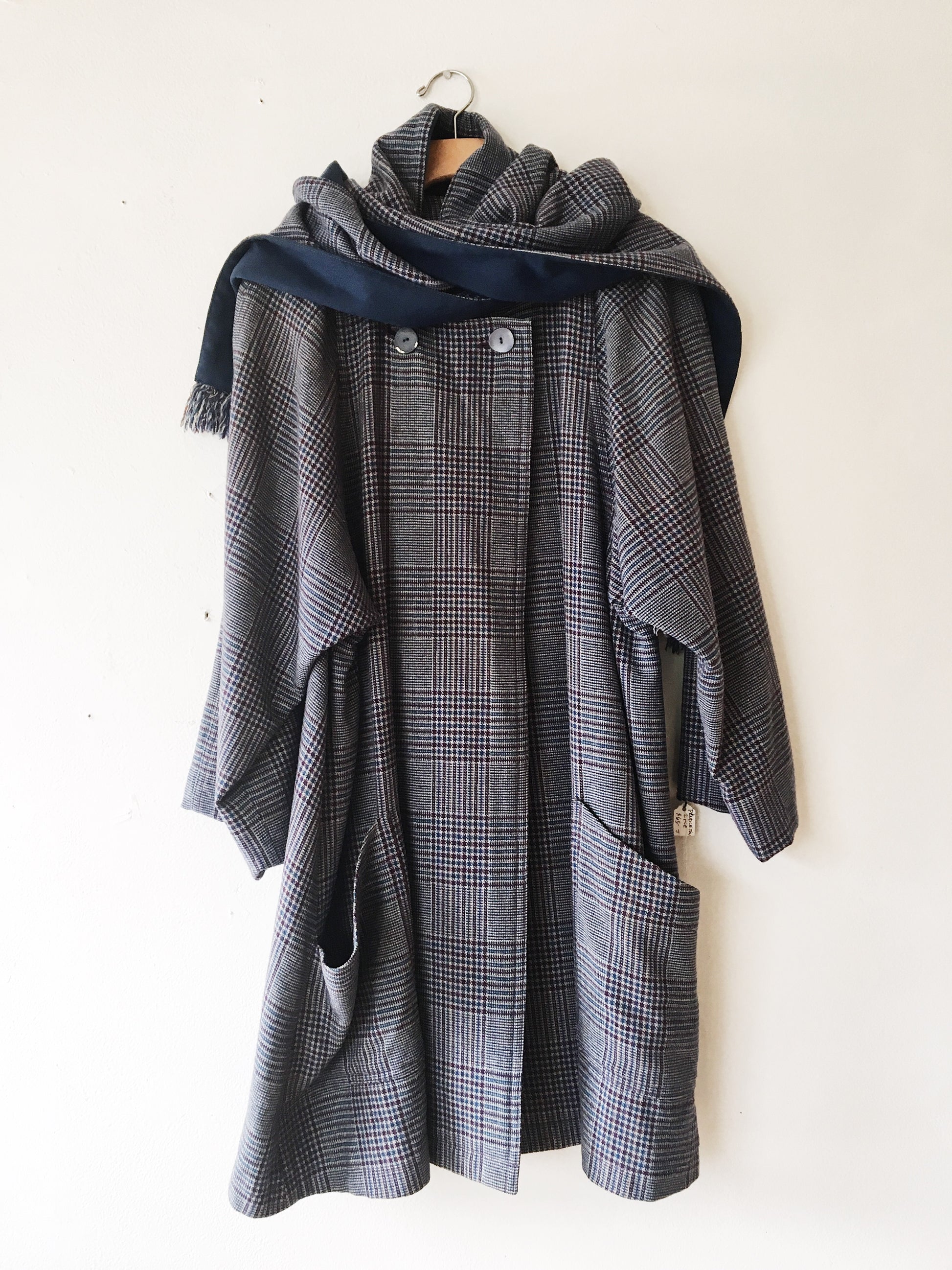 Awesome vintage Pendleton swing coat with matching scarve. The scarf reverses to solid navy. Beautiful eggplant silk lining in excellent condition. The set is In excellent condition overall. One of the buttons has a few chips, easily replaced and fully functional as is.