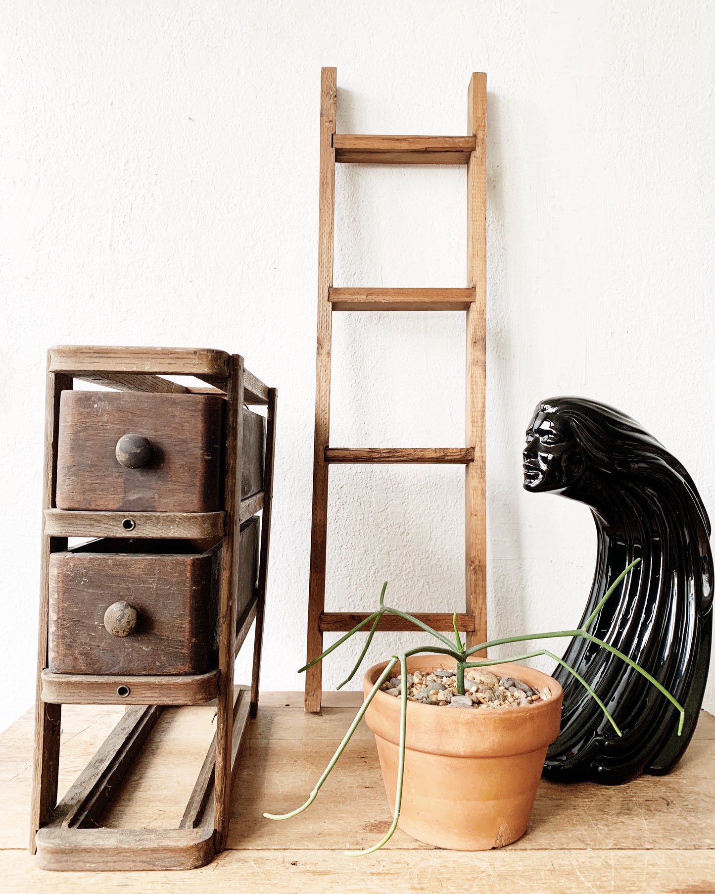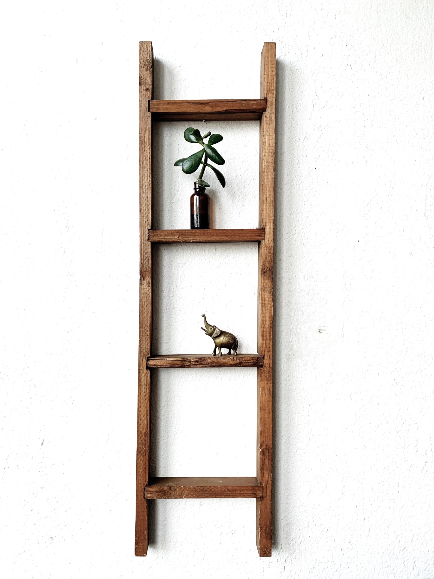 Such a cute little ladder. Works hanging on the wall or resting against the wall atop a dresser or countertop