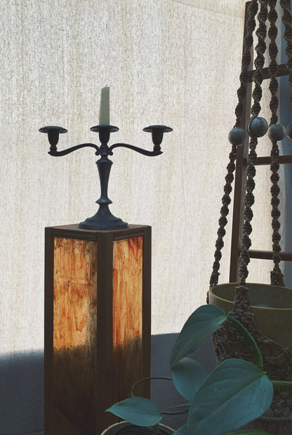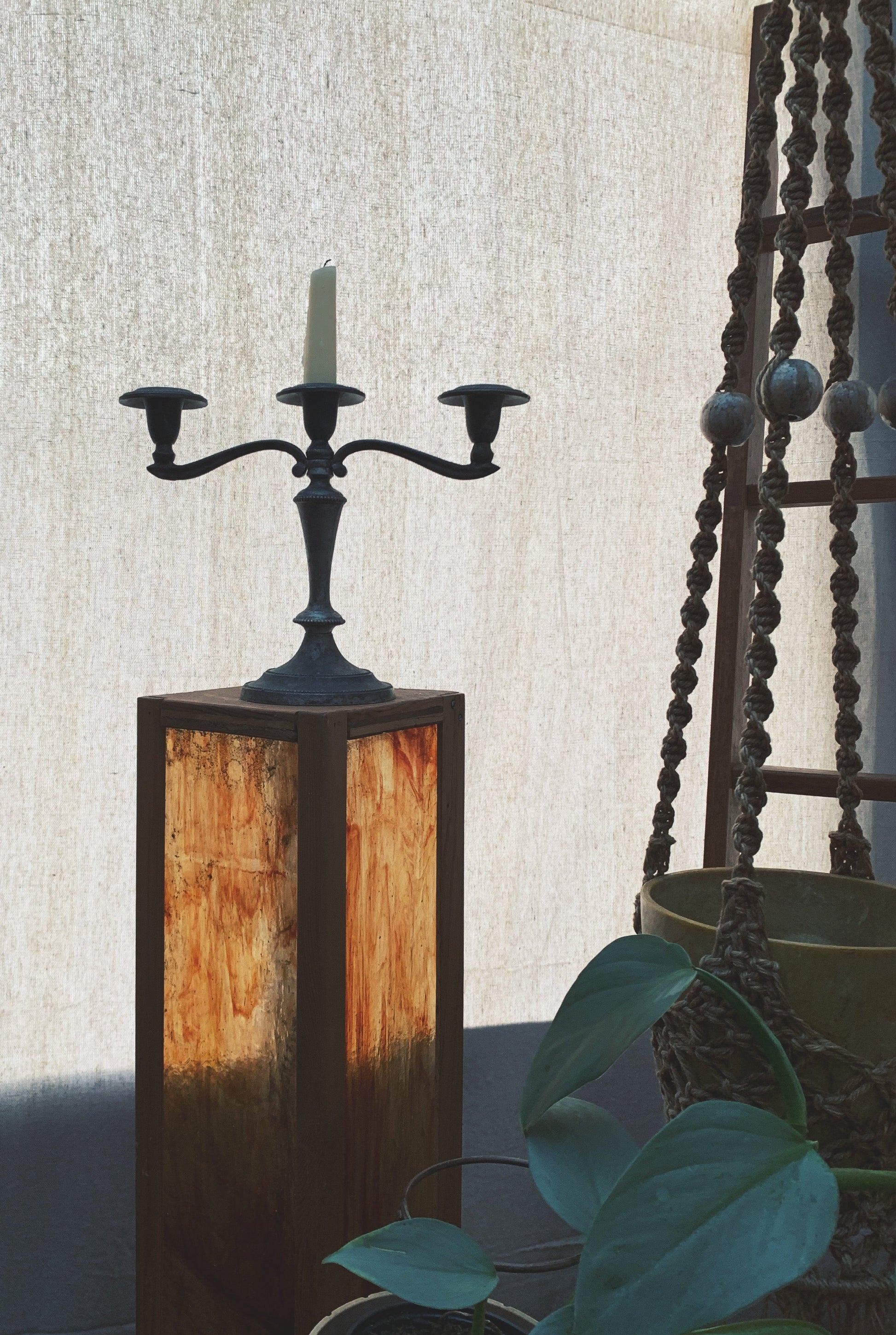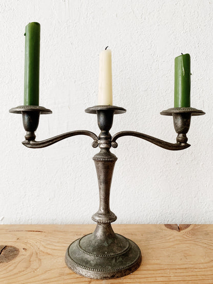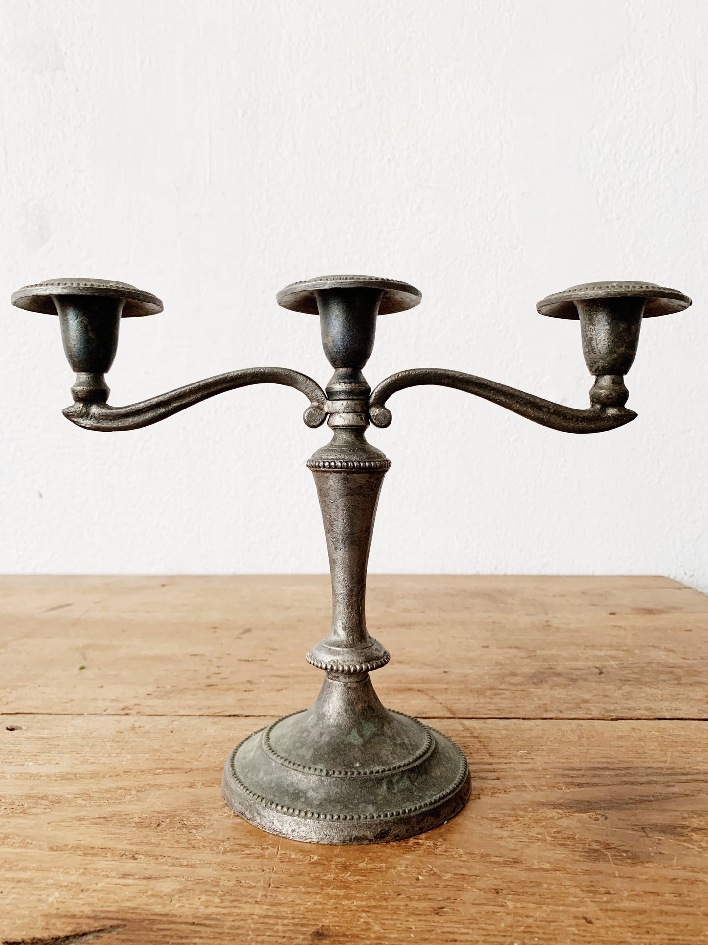 Weighty vintage pewter candelabra that holds three standard tapers.