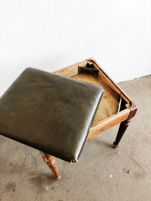 A smaller sized piano bench with lovely patina to the wood. Some wear to the leather seat. Top removes for storage inside. Makes a great side table or plant stand as well