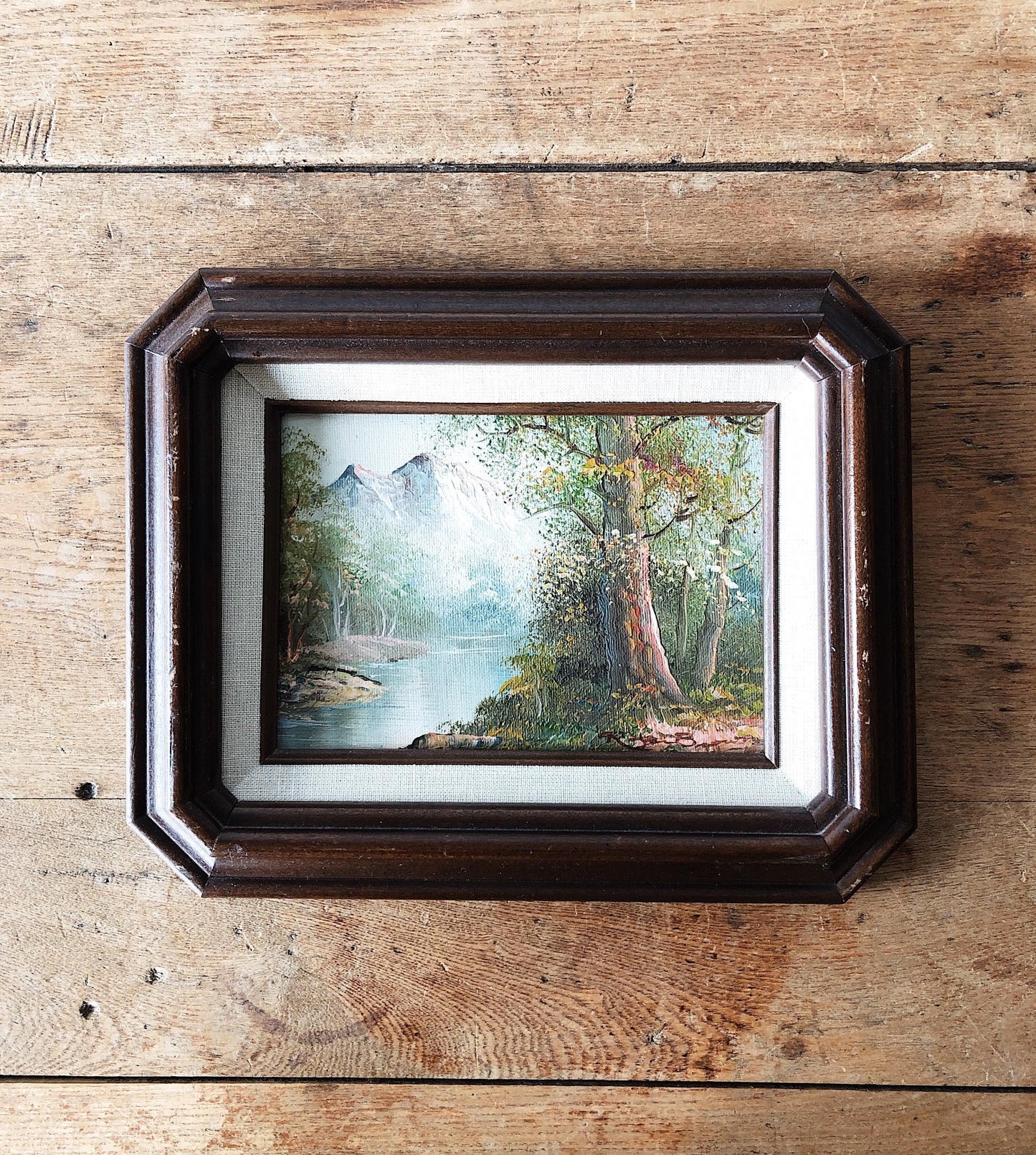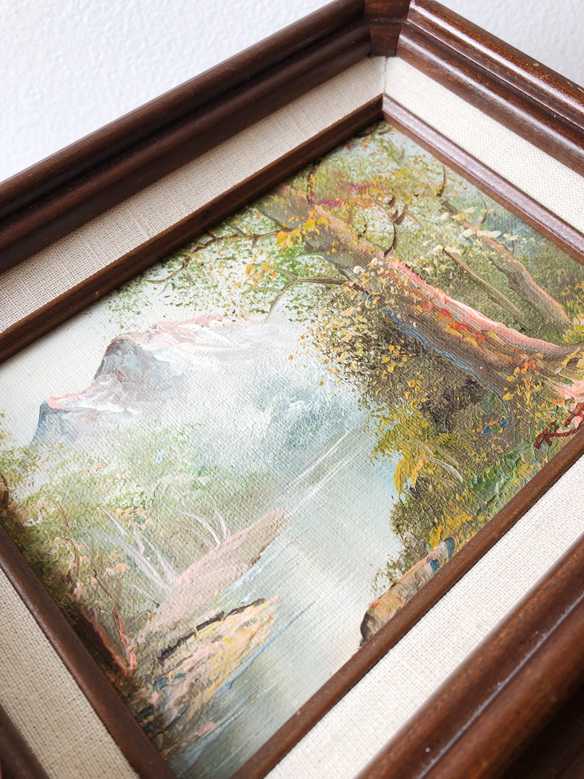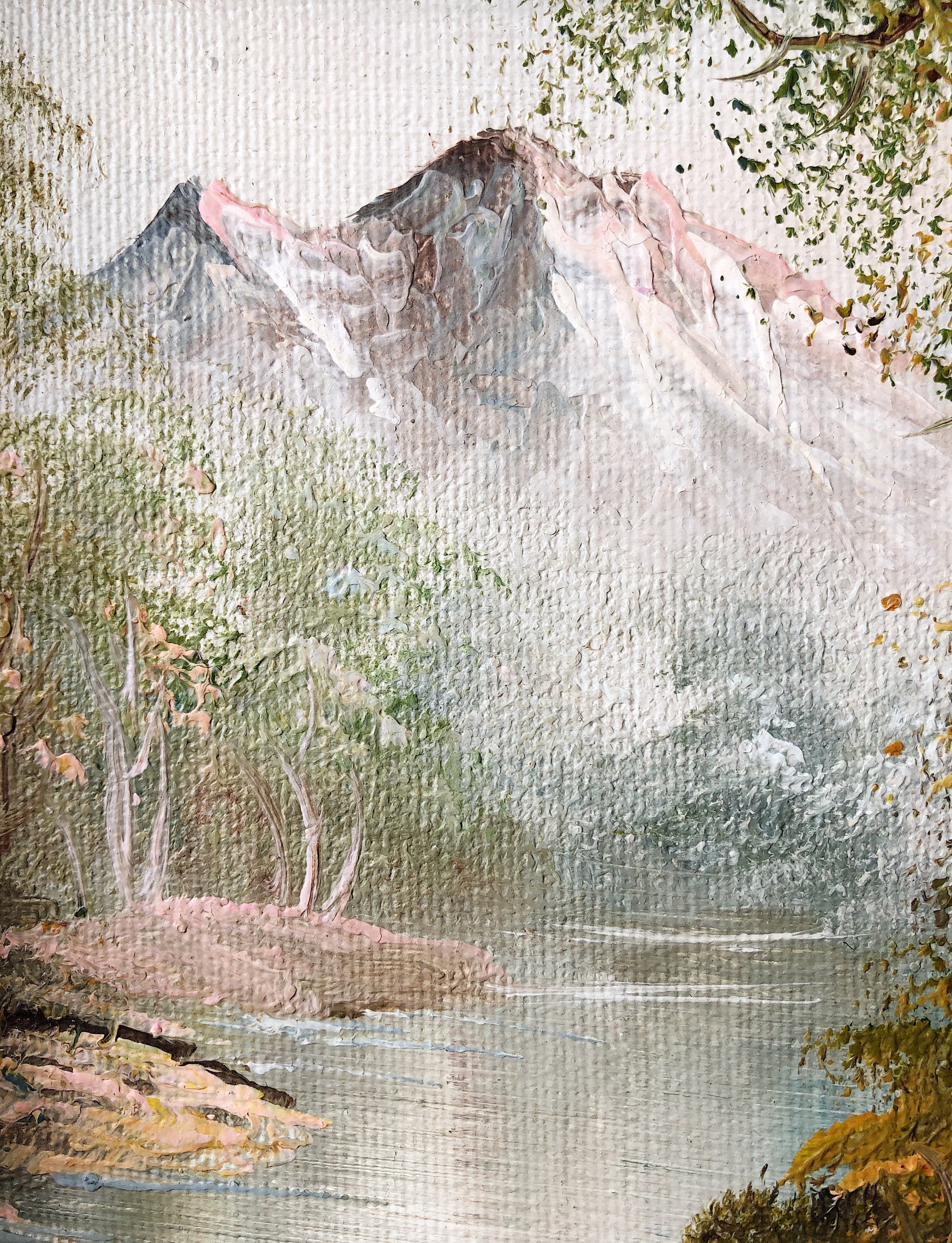 A smaller size to this vintage oil painting. Pink mountain landscape. Delicate fine details in a unique wood and linen frame.