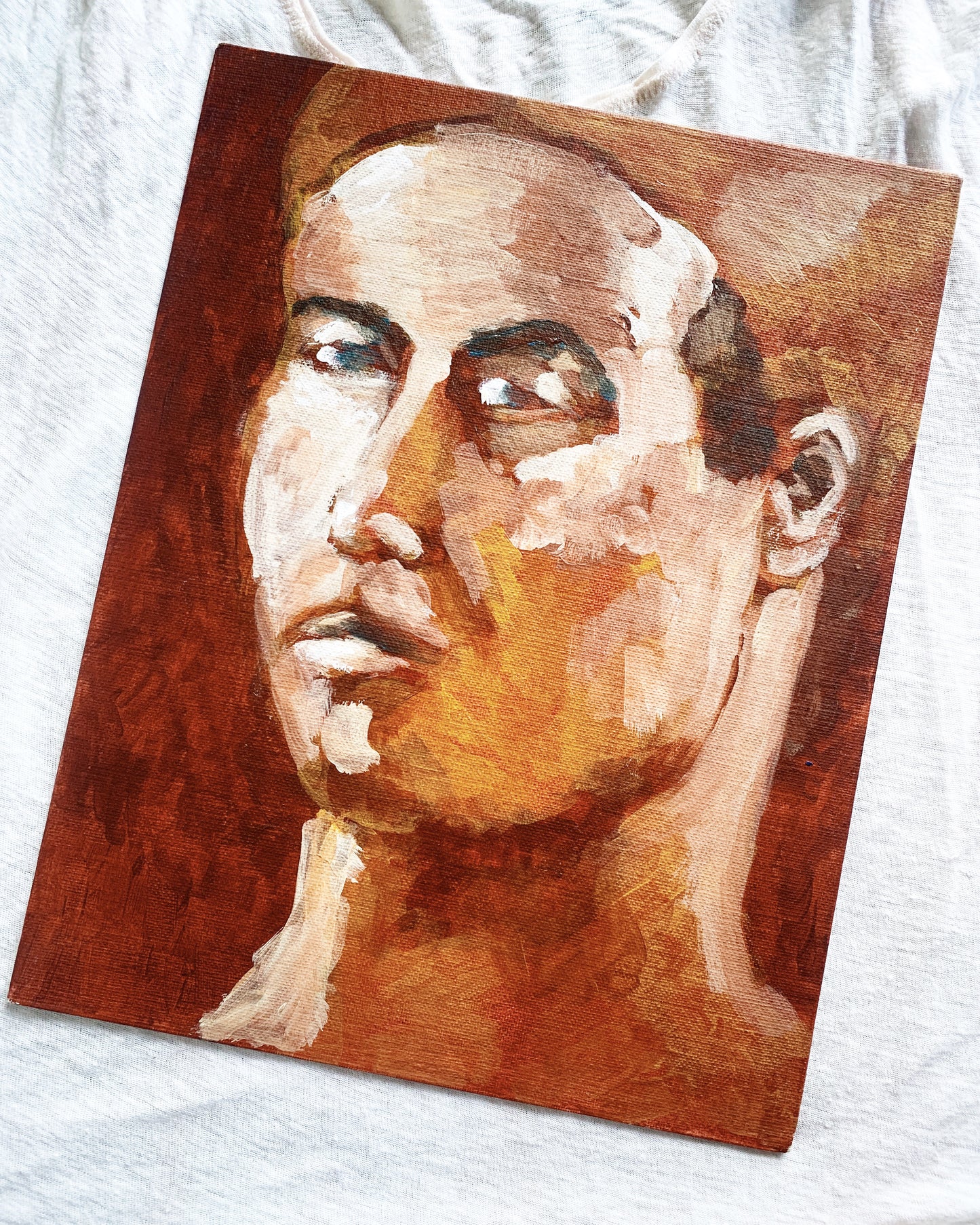 Wonderful vintage portrait on canvas board. Beautifully painted, love the deep red and orange color choices and his expression! So good.