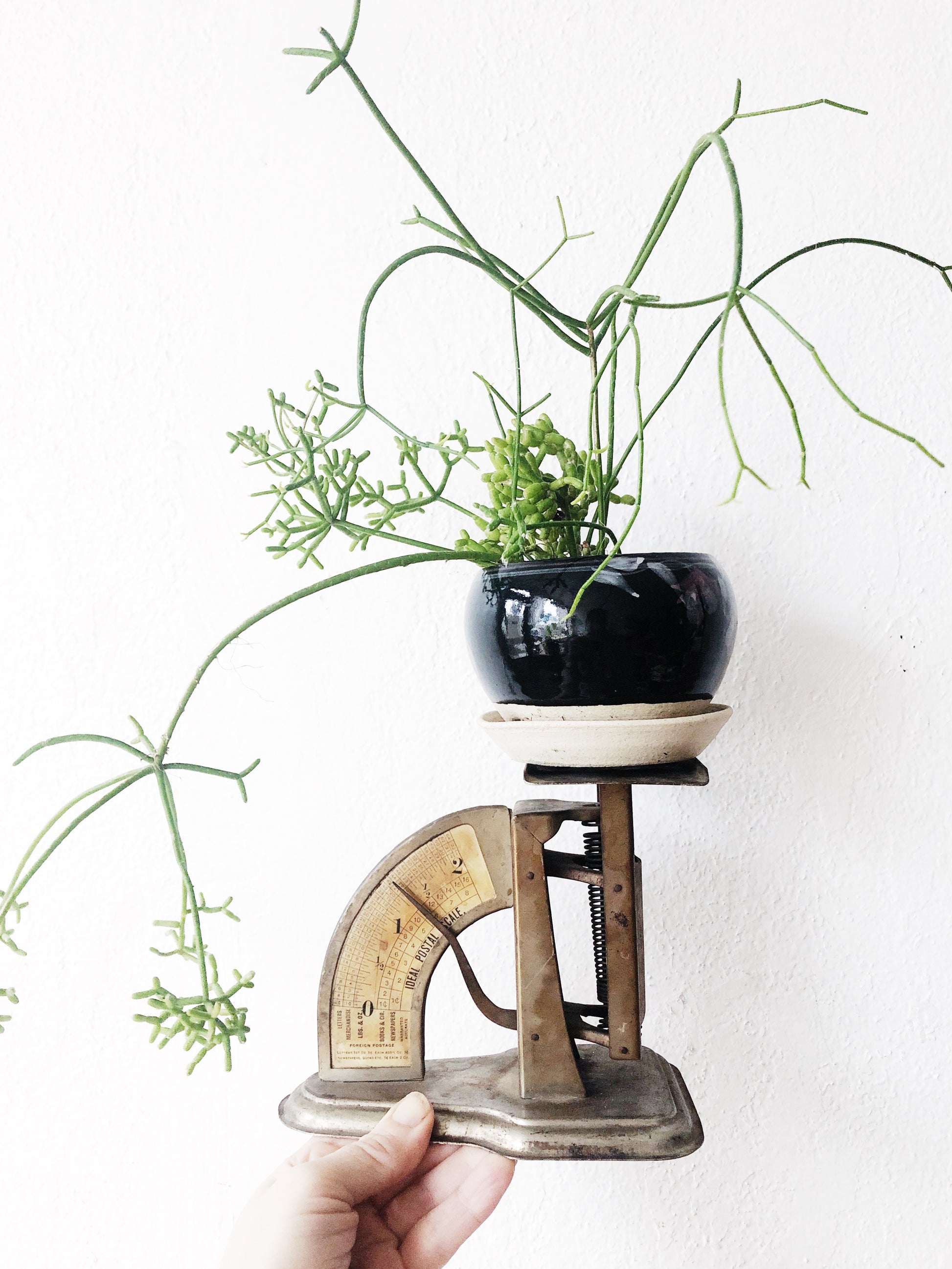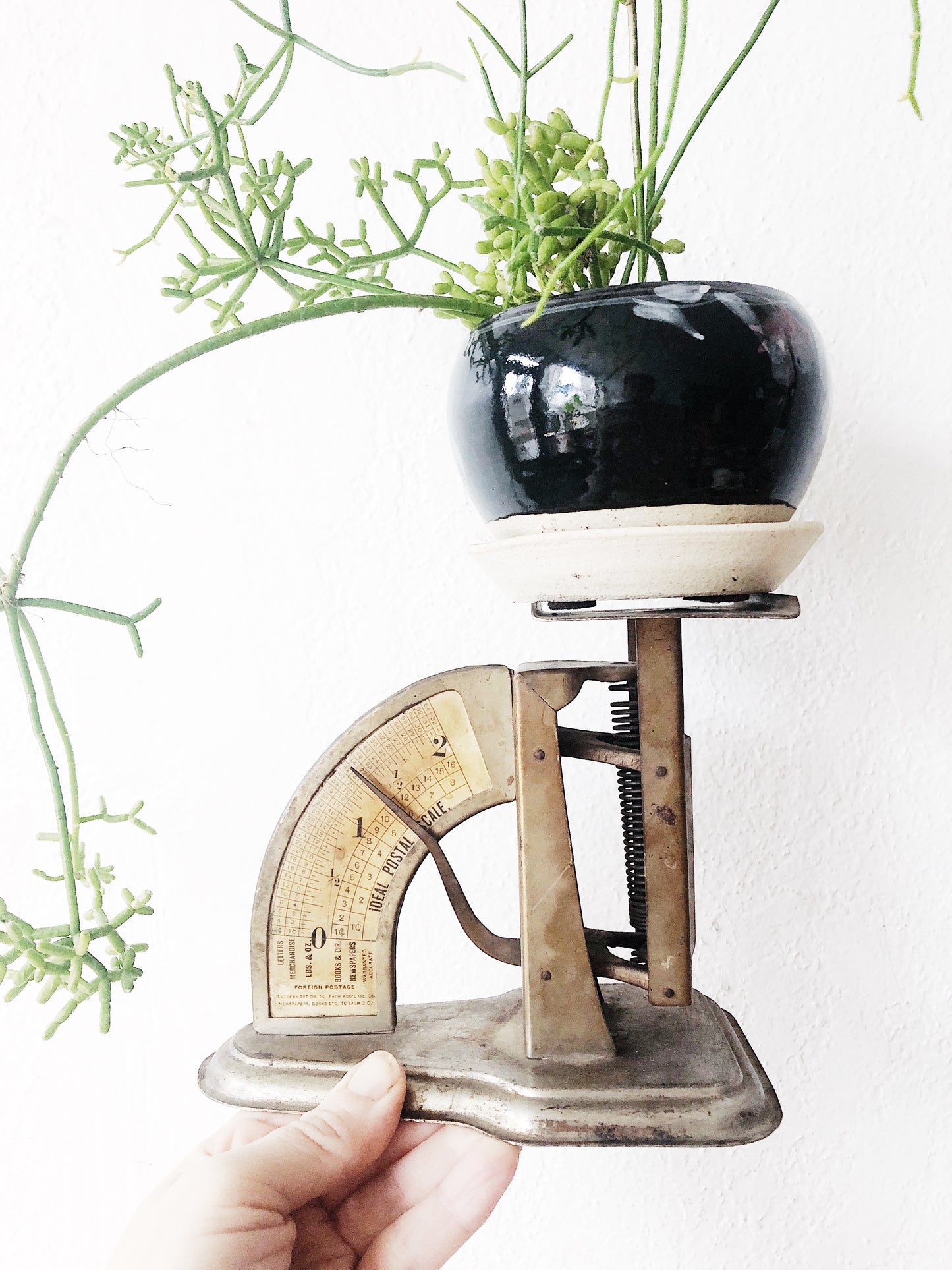 We love these old postal scales for their vintage industrial look. Displaying plants on them is one of our favorite ways to use them