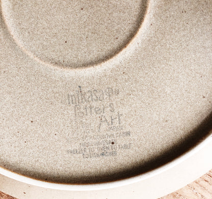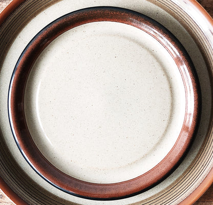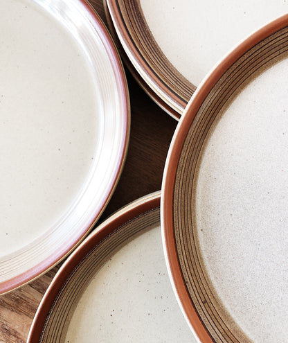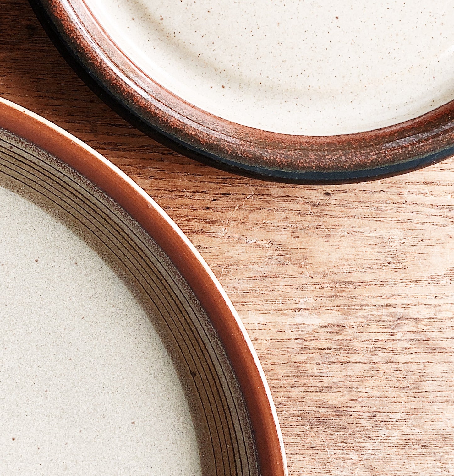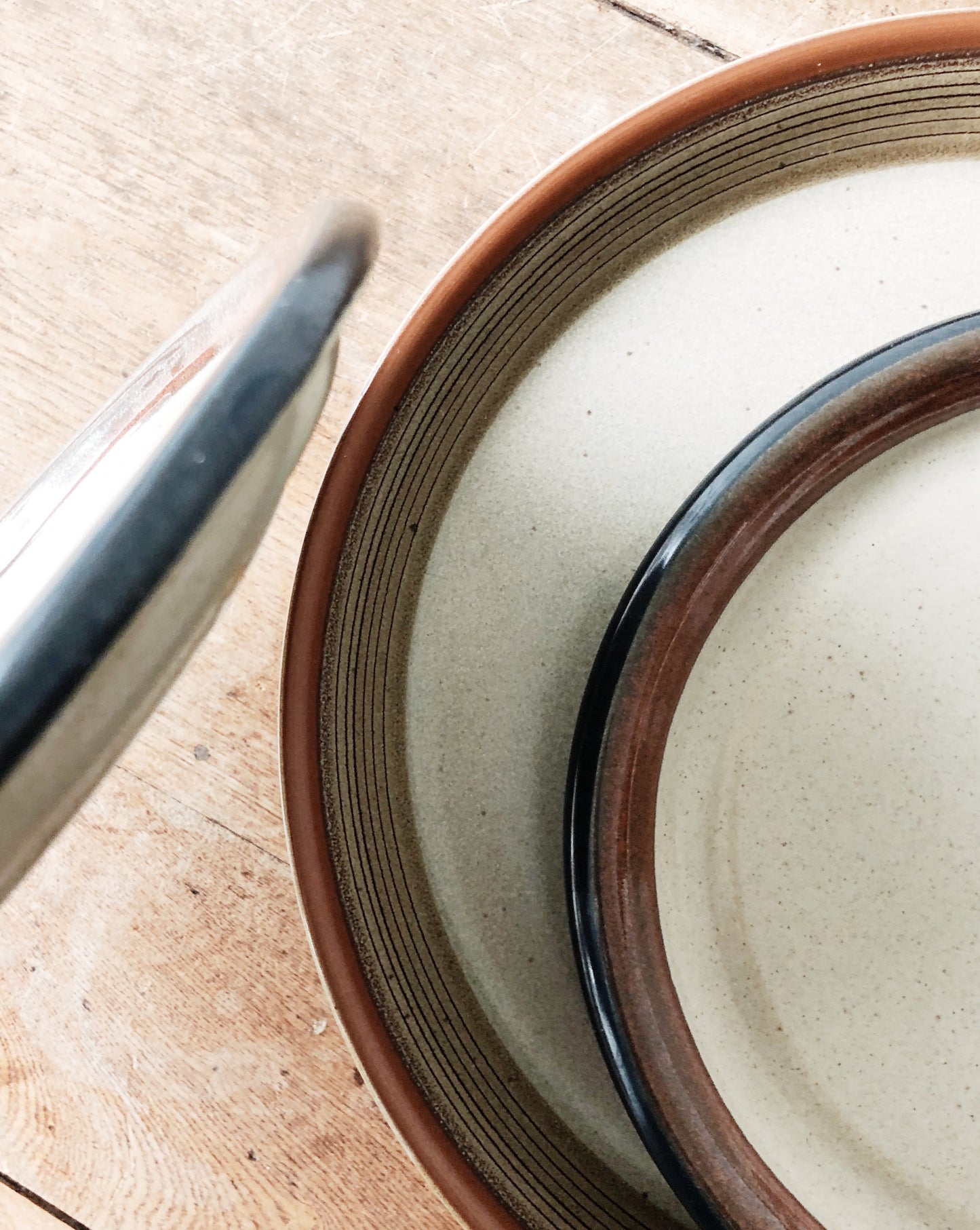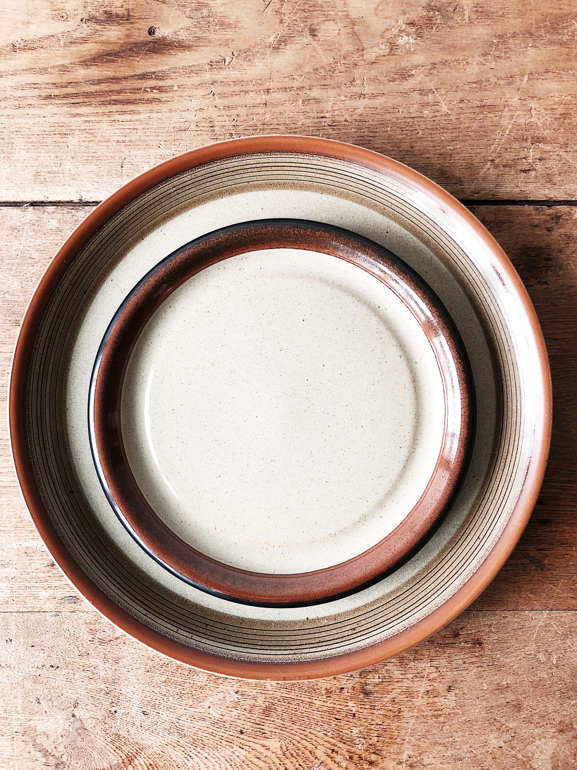 Dinner plates: Potter’s Art pattern by mid century designer Ben Seibel. Terracotta colors on speckled oatmeal ground. They are microwave safe and can go from freezer to oven to table to dishwasher. Hefty and big.