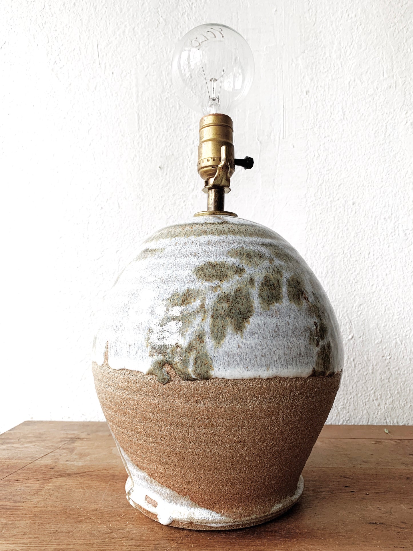 Wonderful glaze and shape on this vintage pottery lamp. Love the irregular glaze pattern. Comes with a brass harp and finial (not pictured) for attaching a shade.