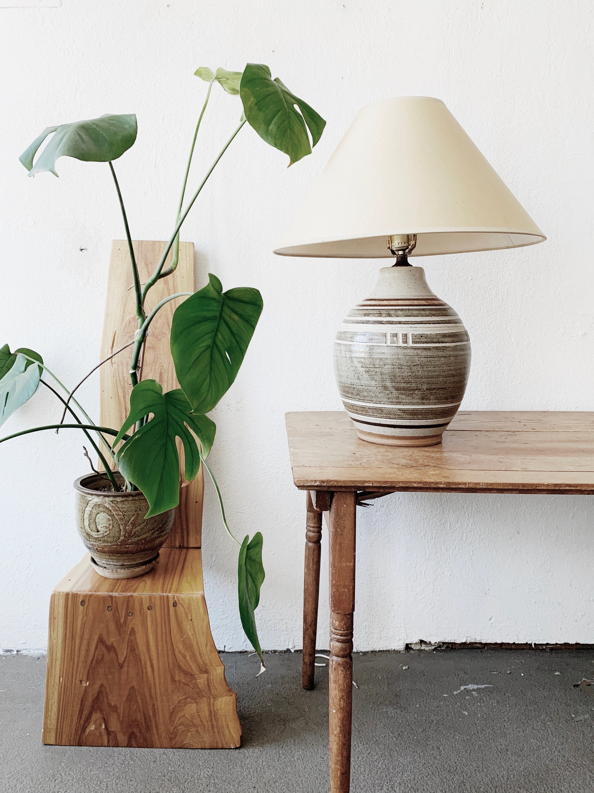 Large vintage pottery lamp with paper shade. In beautiful condition. Neutral tones and modern design, lovely in the living room!