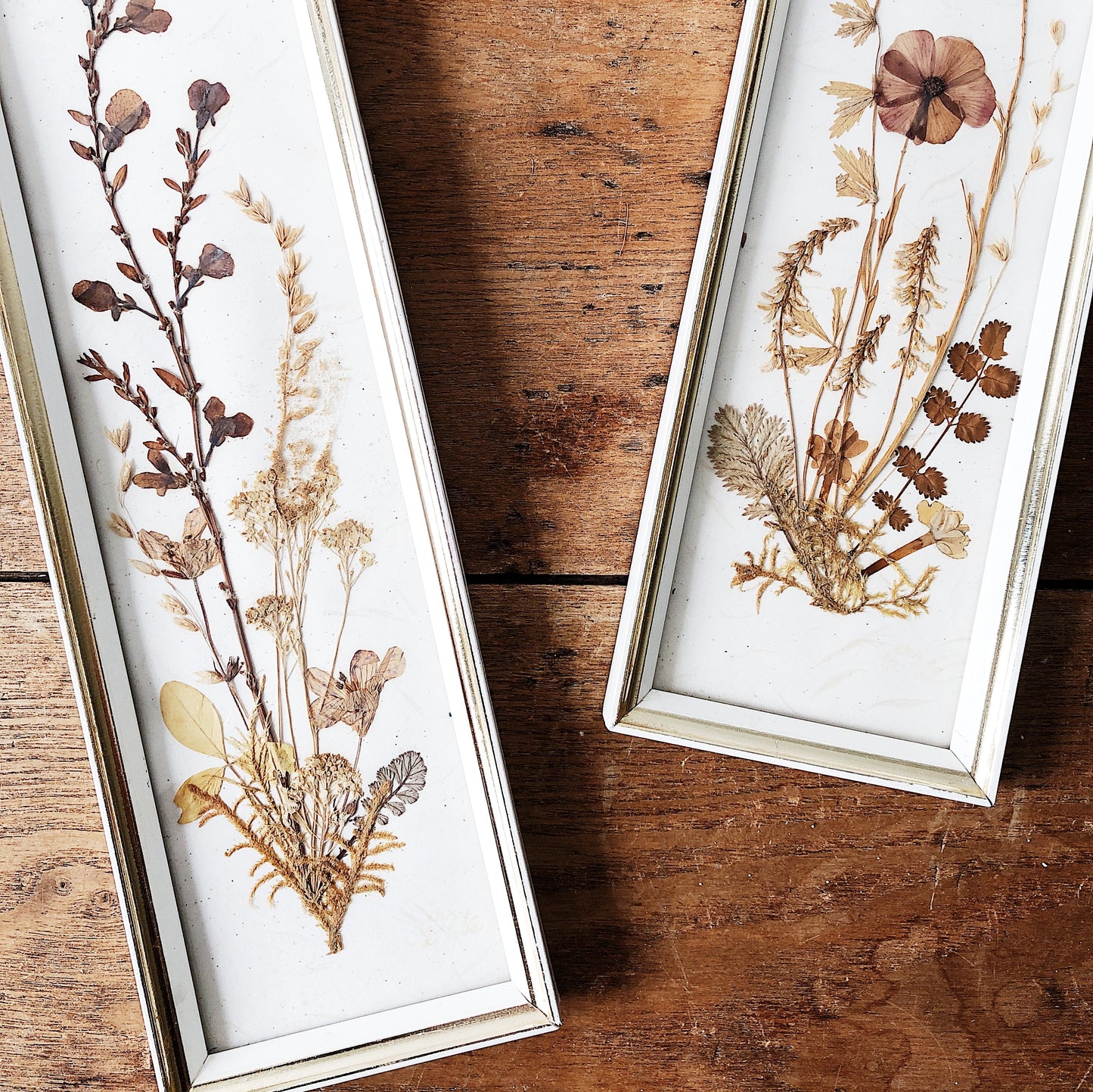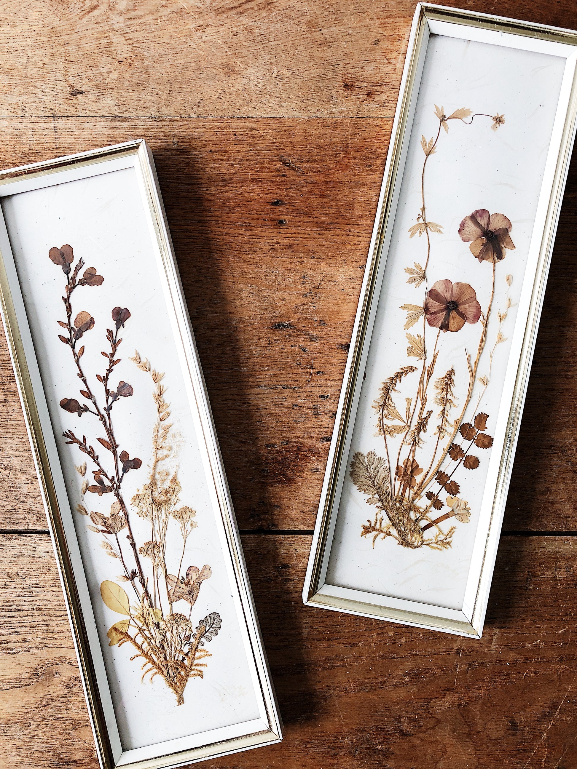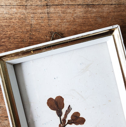 A pair of pressed florals. Sweetly framed under glass. Tiny aged brass hangers...we love those details. Made in Germany