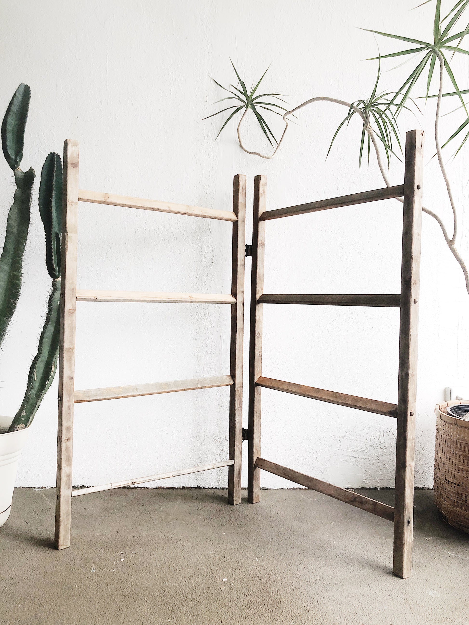 A primitive rack for drying or displaying beloved textiles. Folds in half for easy storage. Really love this as a way to divide a space