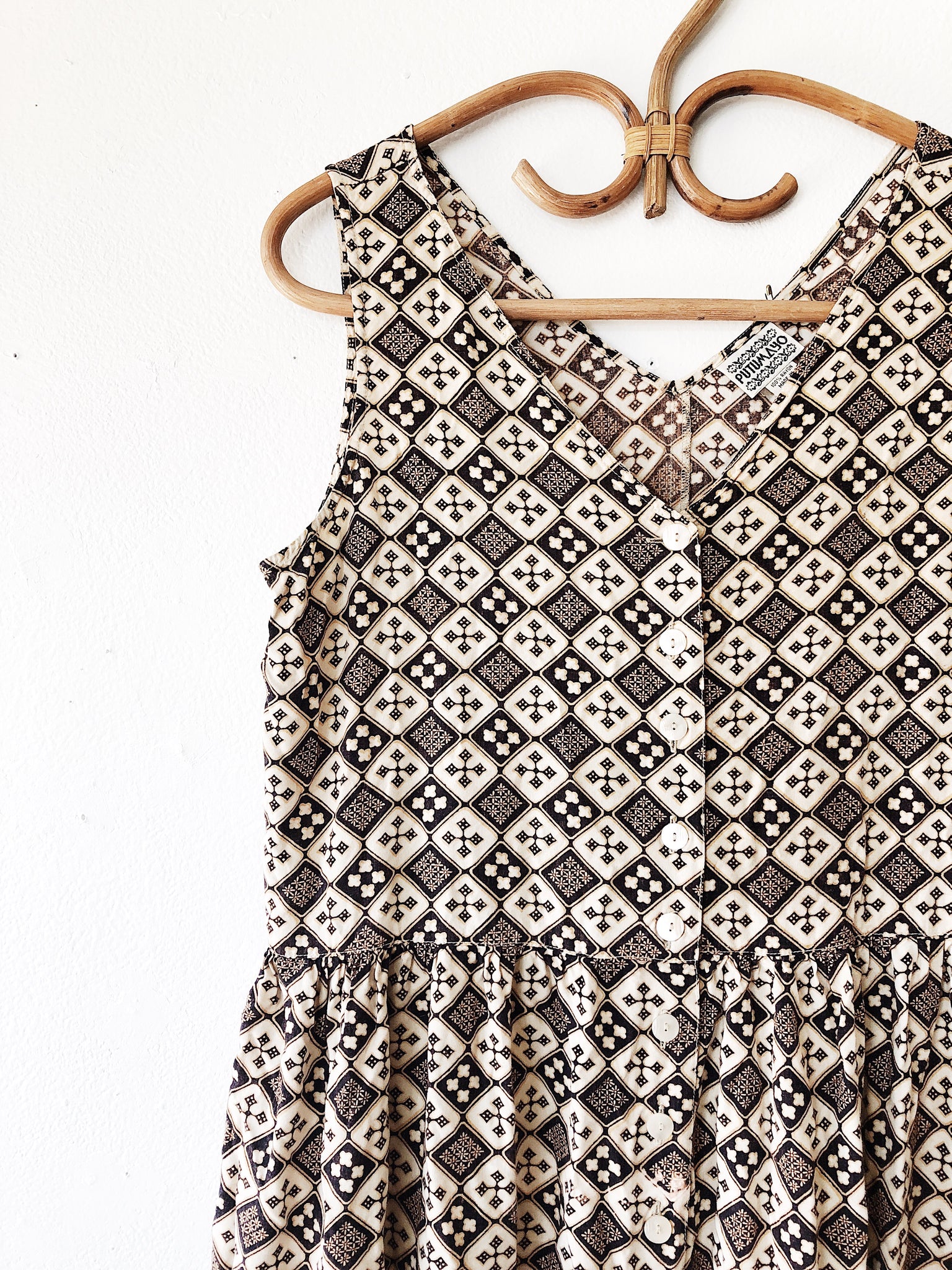 Vintage rayon dress by Putumayo. Nice simple shape and perfect for summer to fall. Marked medium with drop waist