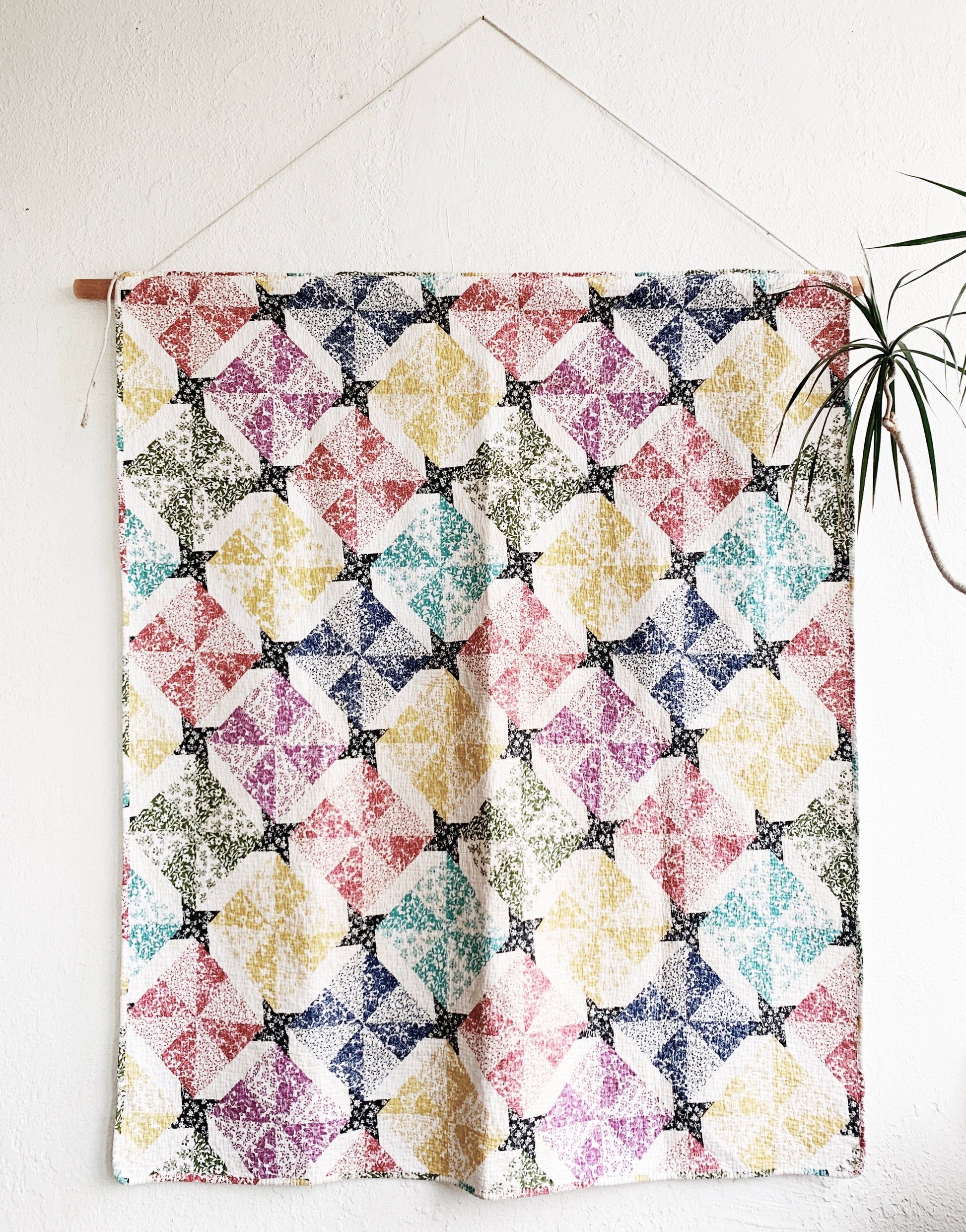 Wonderful vintage Cotton quilt with hand stitched dowel rod pocket for hanging if you desire. Overall in nice condition, a few areas of age discoloration. Solid white reverse. This would be lovely hung as a headboard or as a doorway curtain.