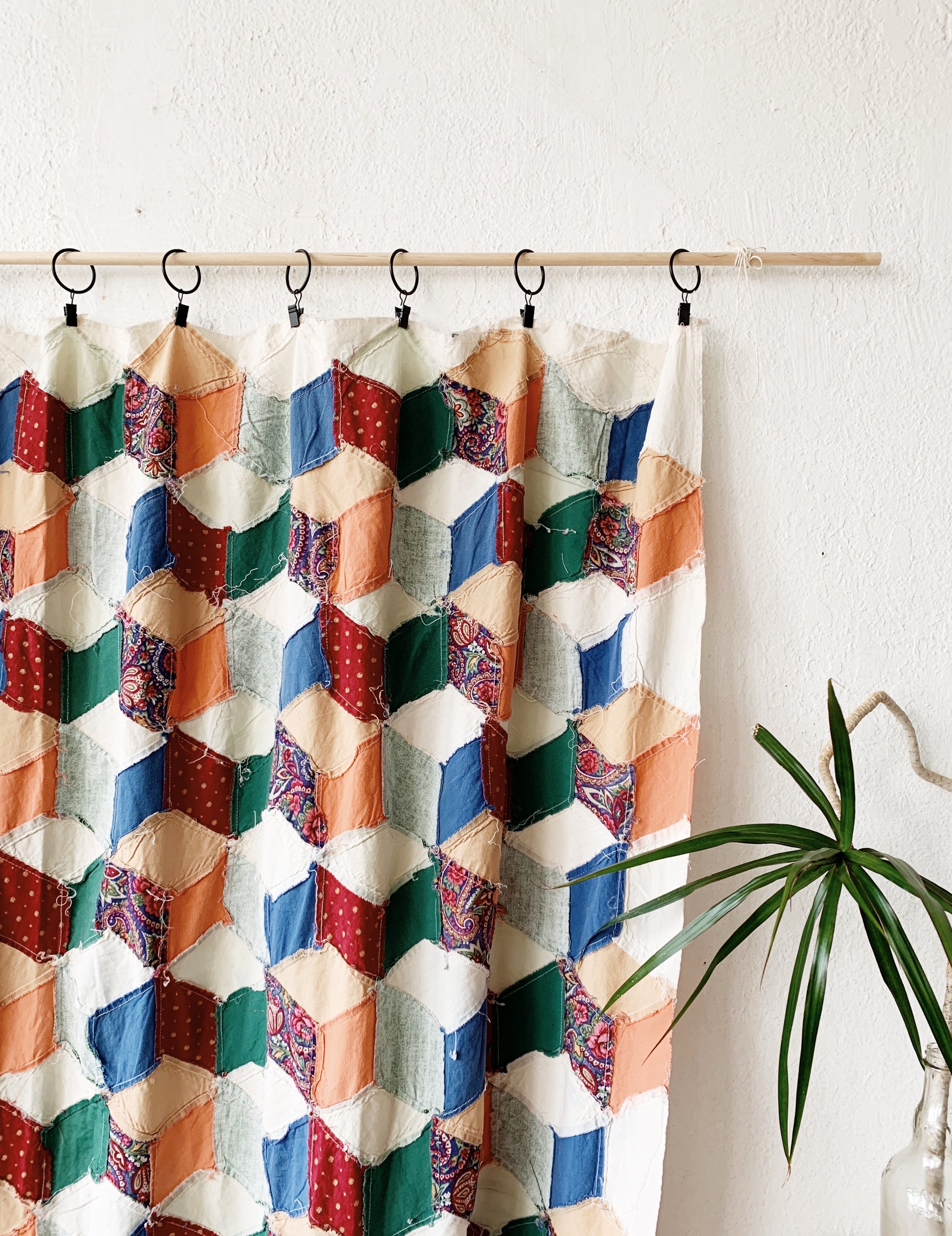 Lovely vintage cotton patchwork quilt top in great condition. We like it hung in a doorway or over a window or finish it and use as a blanket! Can also just be draped over your bed.