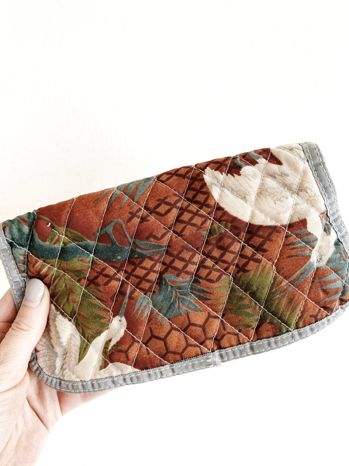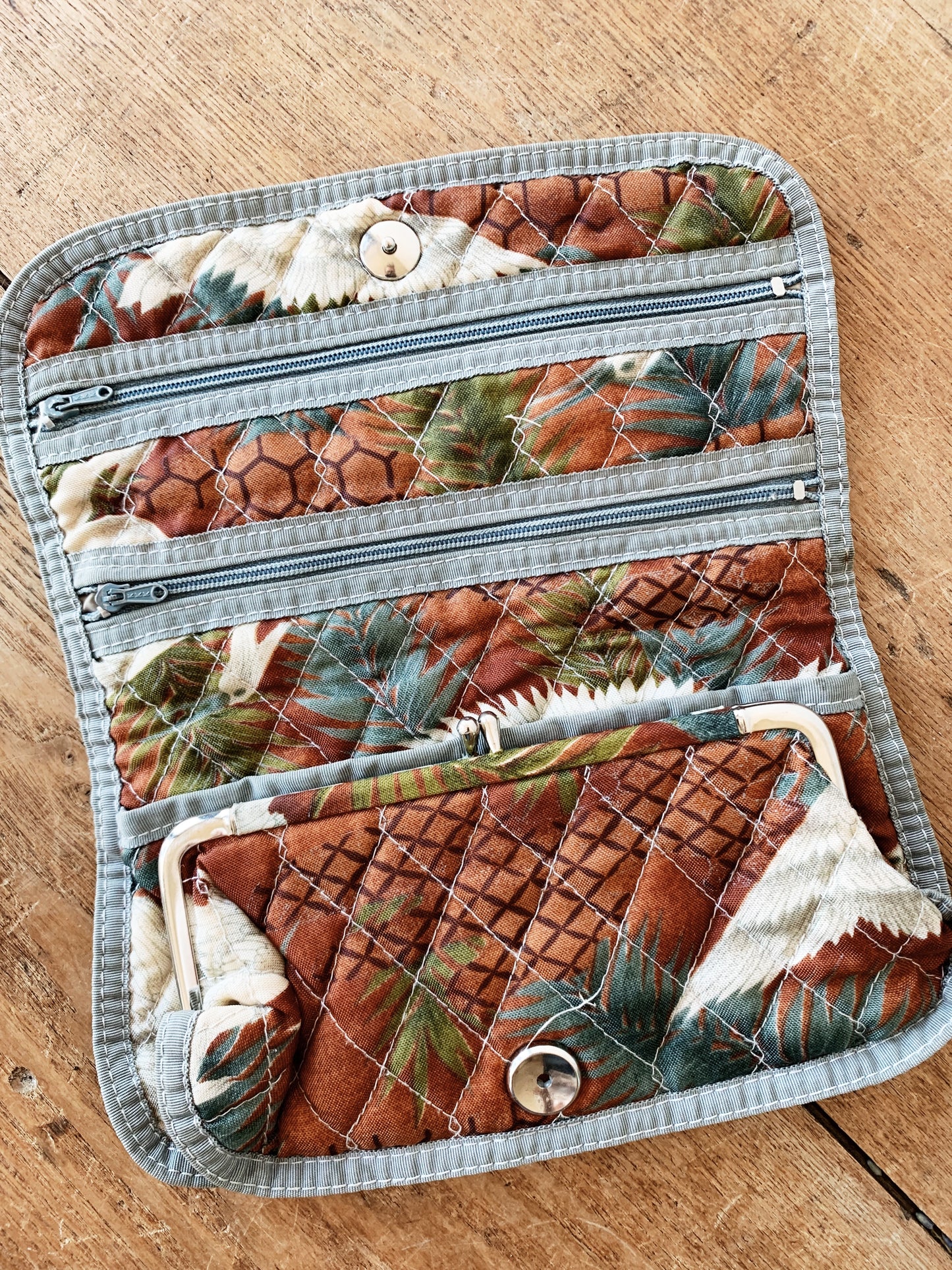 Wonderful vintage quilted wallet with copper background crane print. Snap closure, good sized internal snap coin pouch, two zippered sections and an open pocket. A real winner.