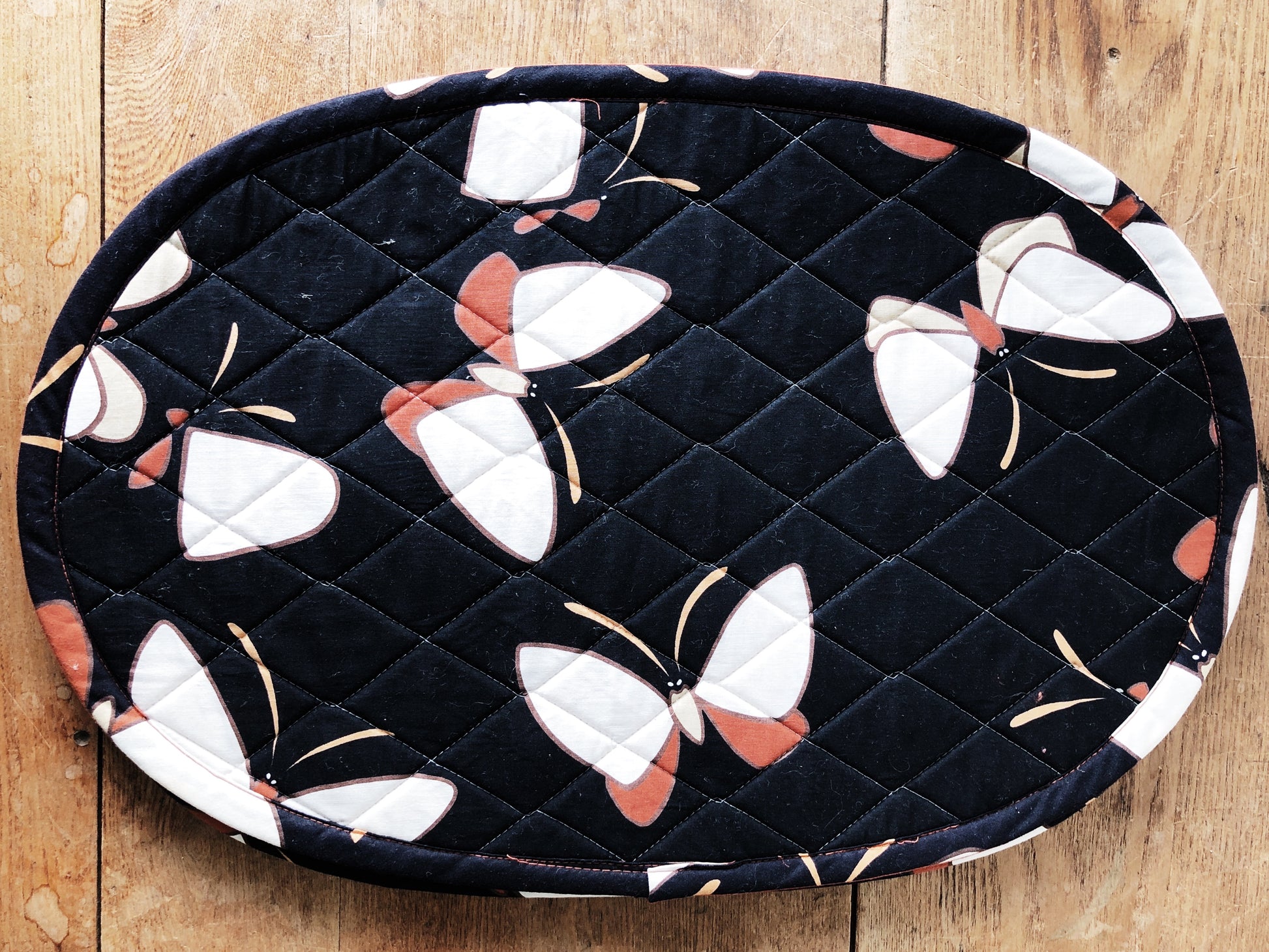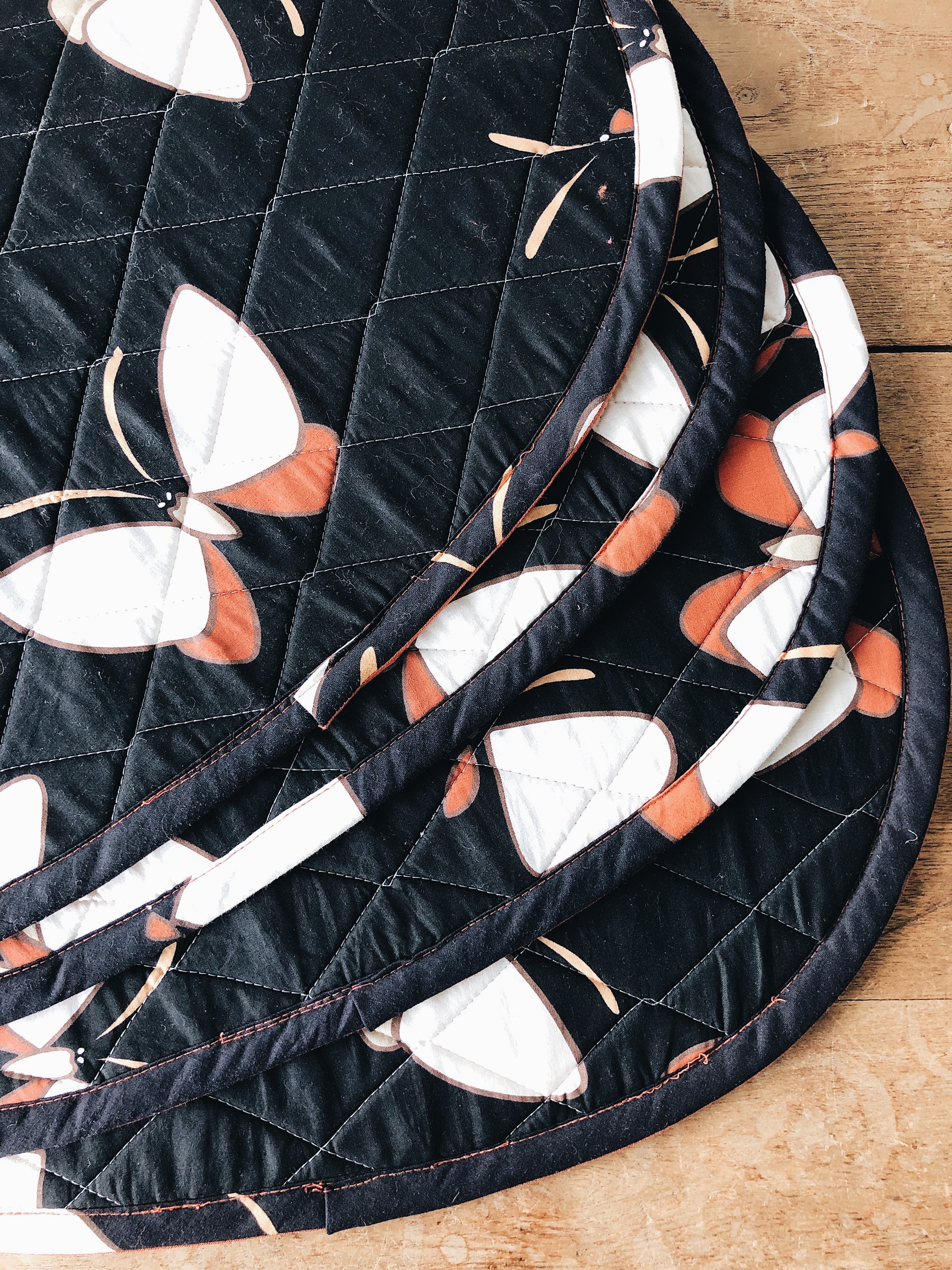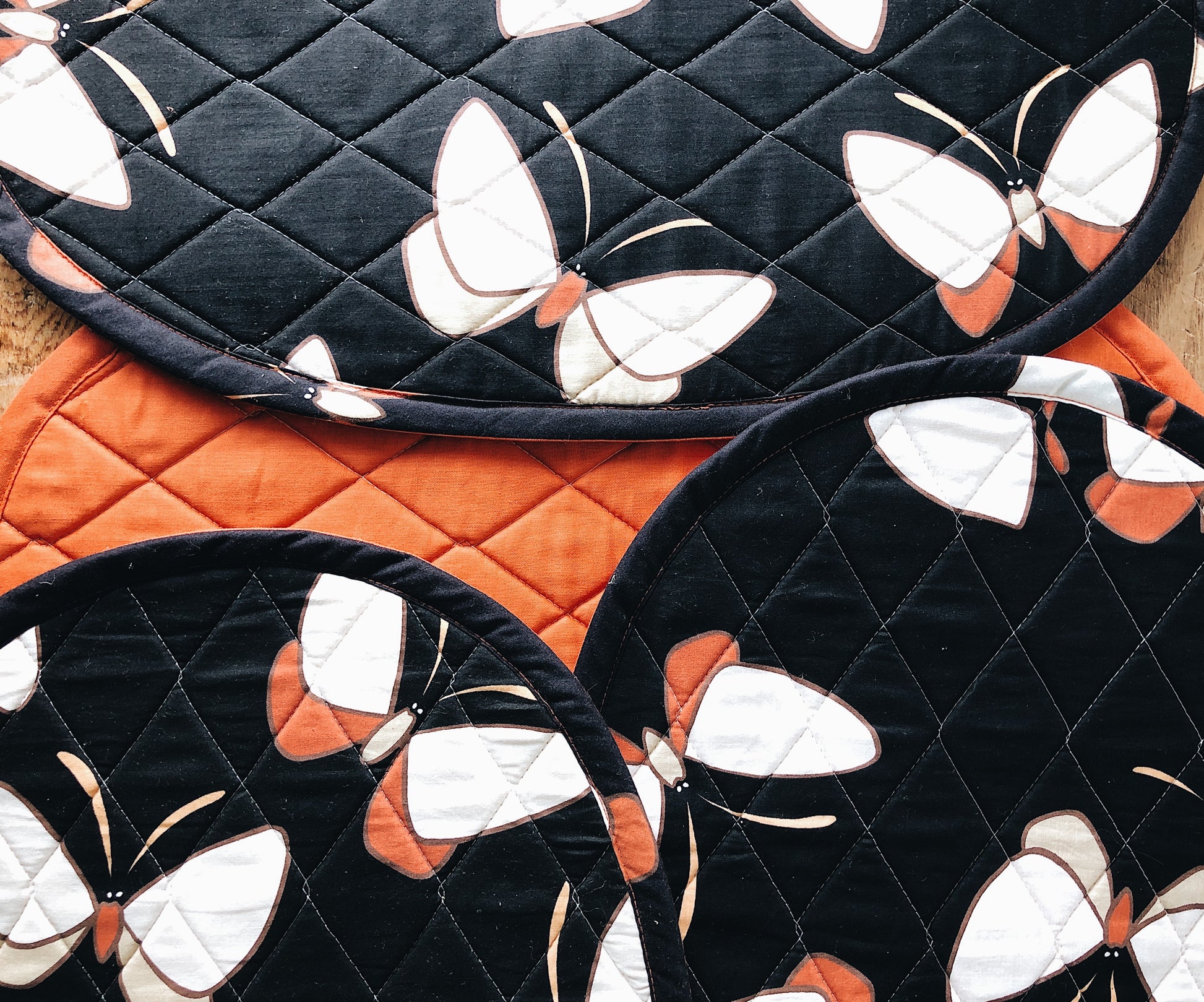 Great lookin set of four quilted placemats. Orange on the reverse. Nice long oval shape