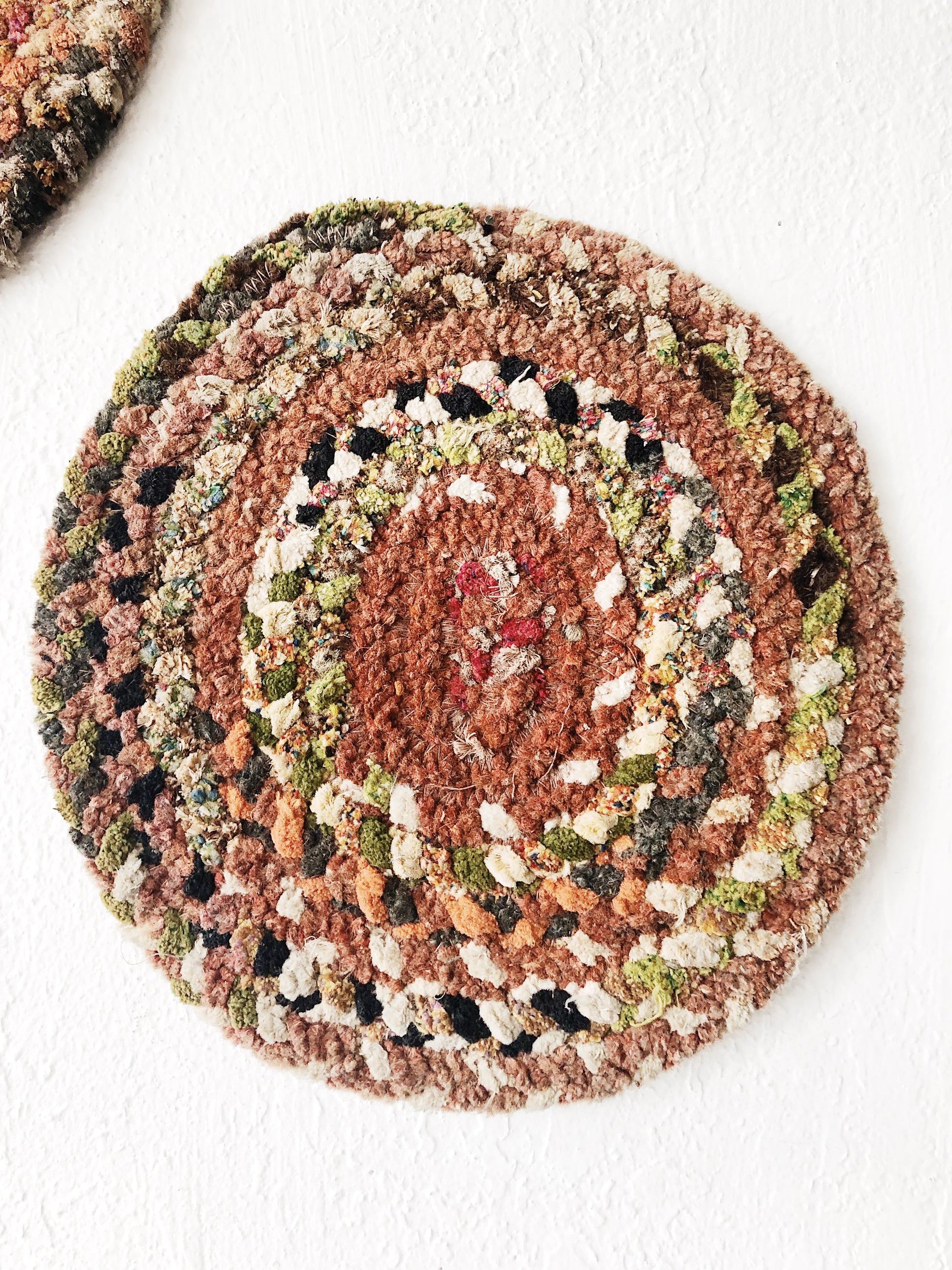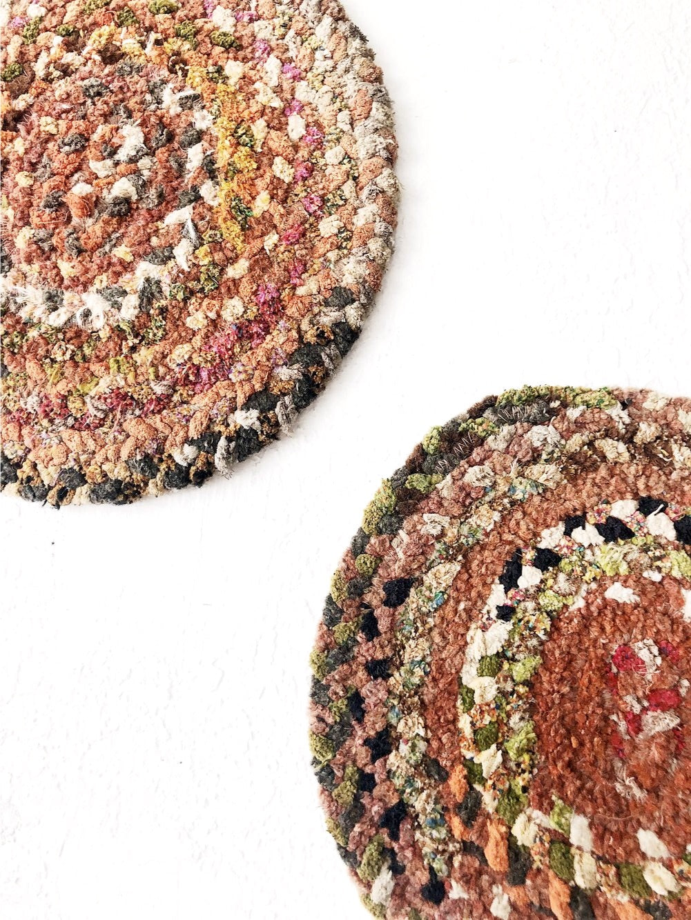 Great old cotton rag mats, seat pads or mini rugs. Love the peachy colors