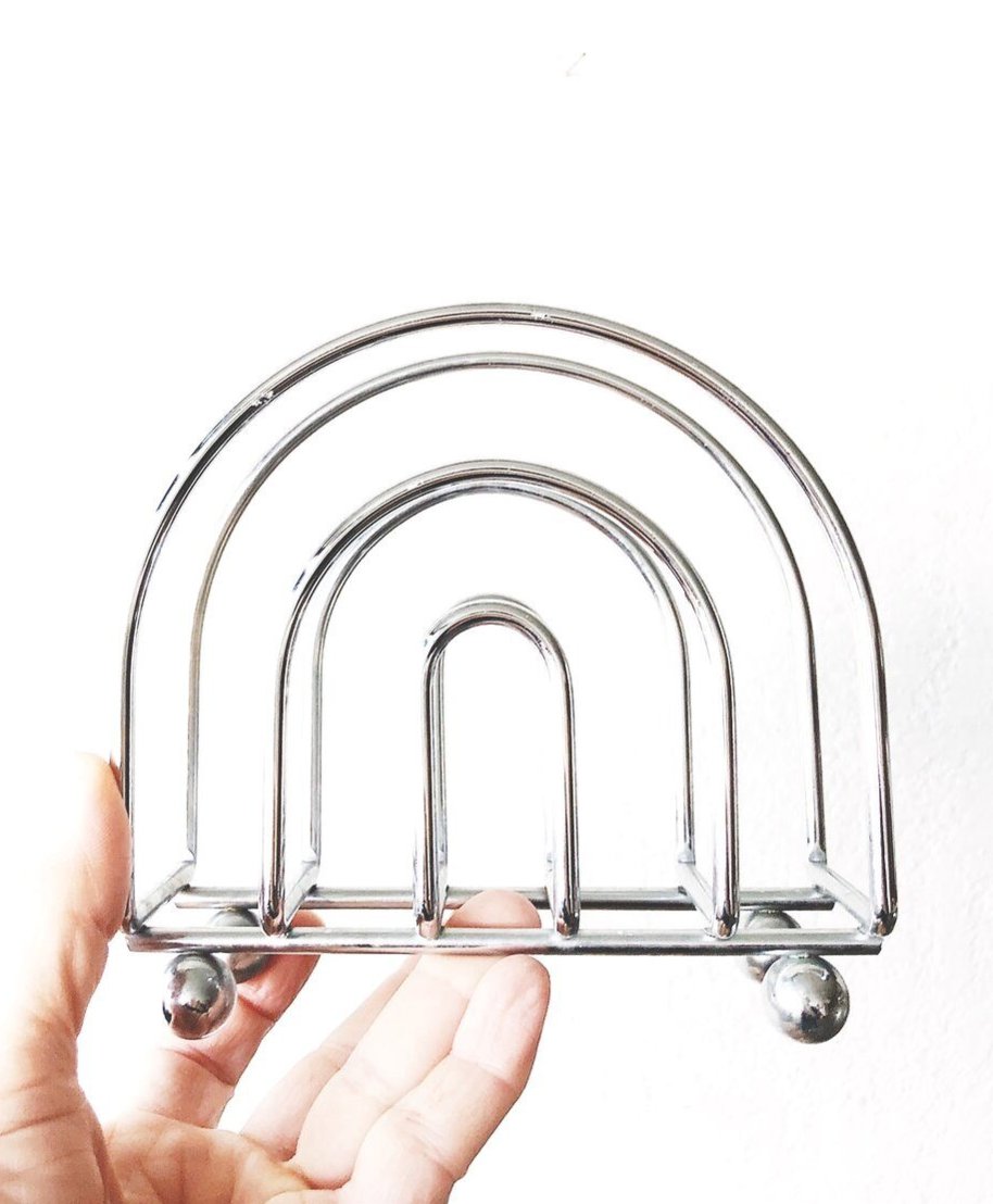 Modernist style stainless steel holder in a double rainbow shape. Little bun feet
