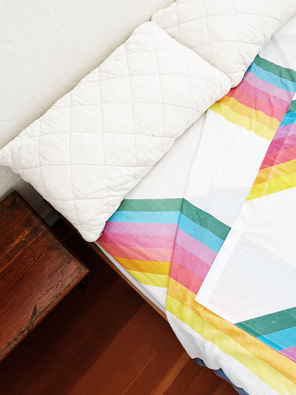 Cheery vintage rainbow sheet set for a full bed. Fitted, flat and one rainbow case. In very nice condition with some very minor fading and pilling. Please note the fitted sheet isn’t appropriate for the extra deep mattresses they make today. Best for a thinner or futon type ( it JUST fits on my average sized mattress )