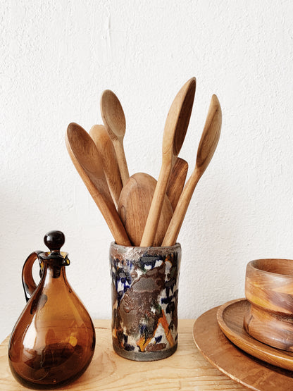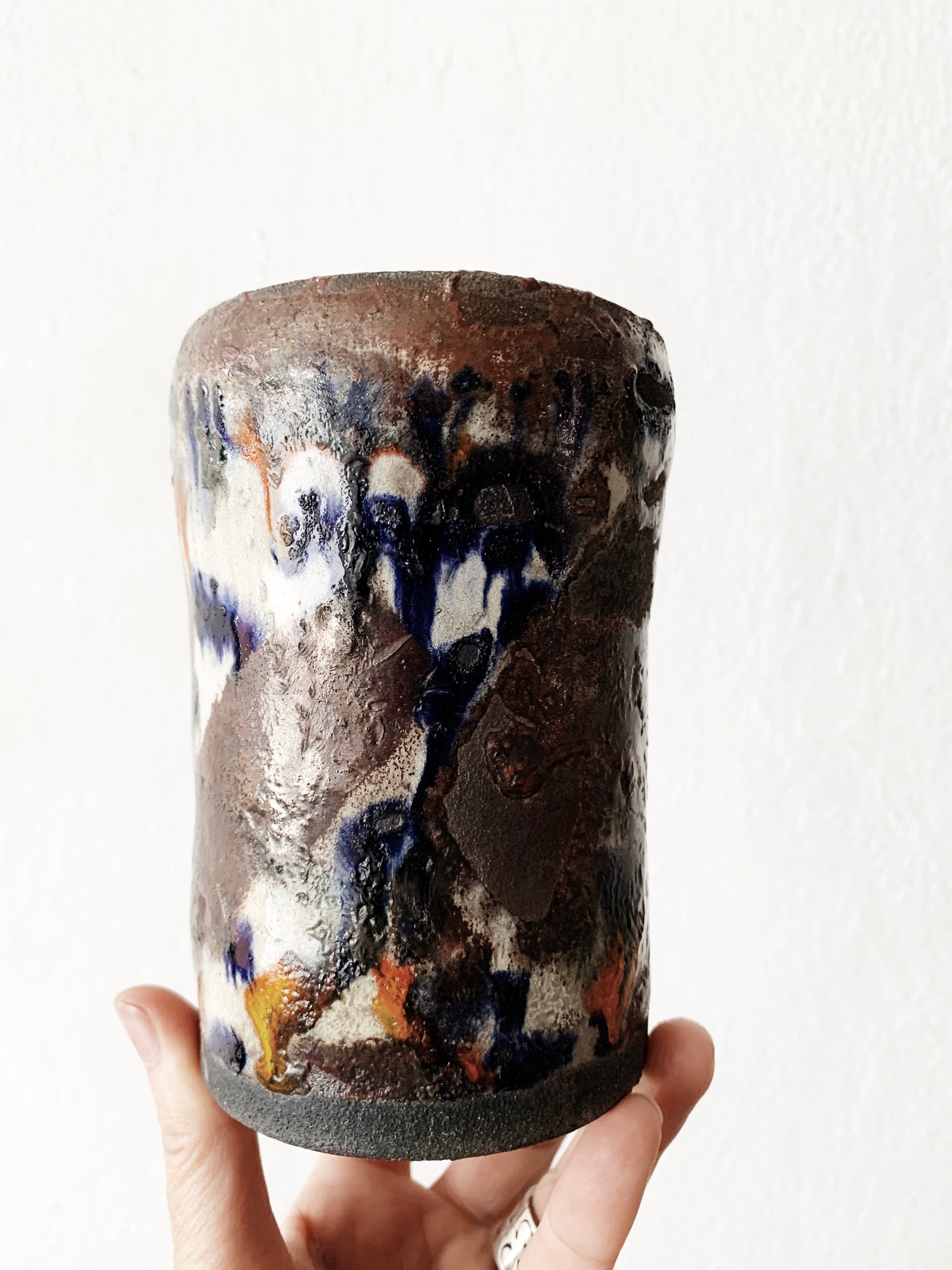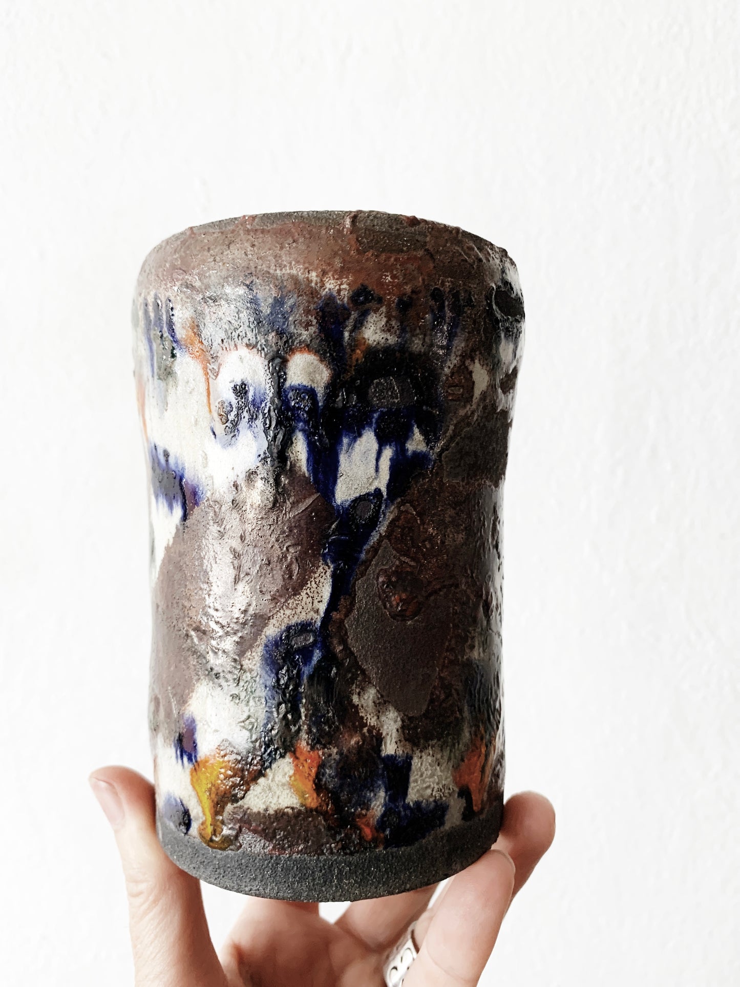 Beautiful, colorful drippy glaze on this raku vessel. Makes a great crock for wooden utensils or pot it with a cactus