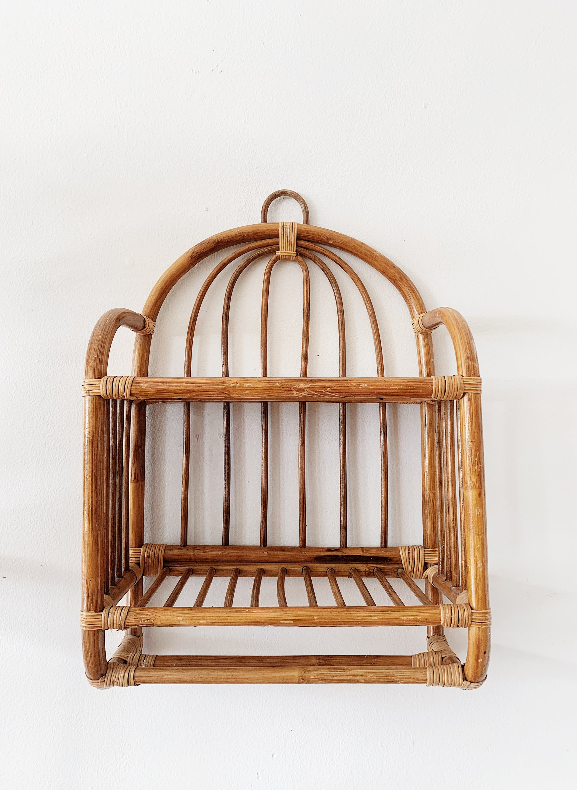 Nice vintage rattan and wicker wall shelf for your bathroom. Has two shelves and a double hanging bar.