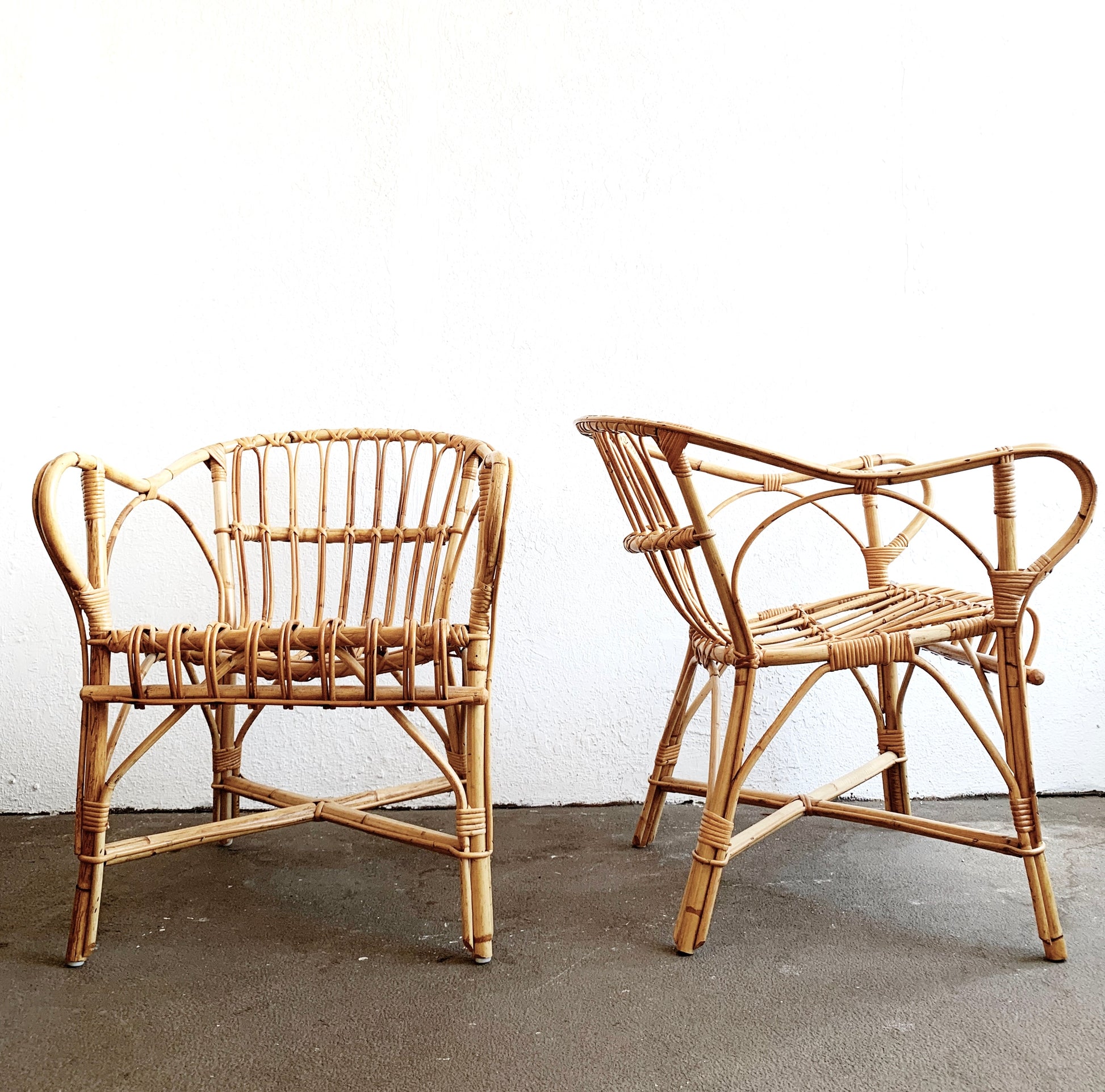 Gorgeous vintage modern Albini esque rattan chairs in beautiful condition. Low back and loungey for a comfortable sit. Vintage pink corduroy cushions included. Available individually or as a pair. Select at checkout
