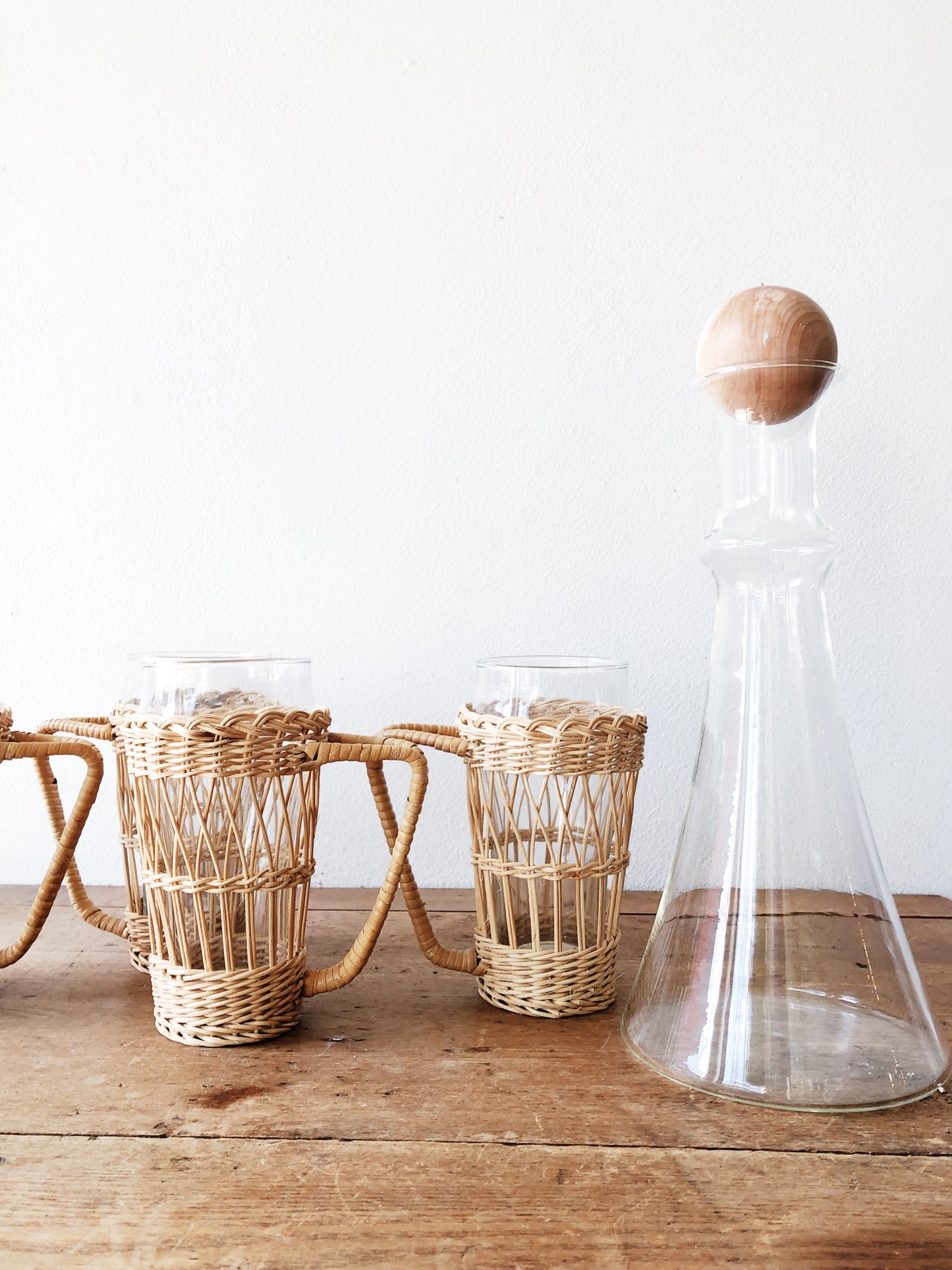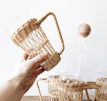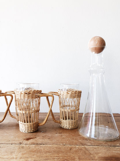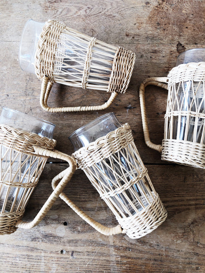 A set of four vintage rattan wrapped Pilsner glasses. Great for your summer ale, iced tea or cucumber water. Carafe sold separately