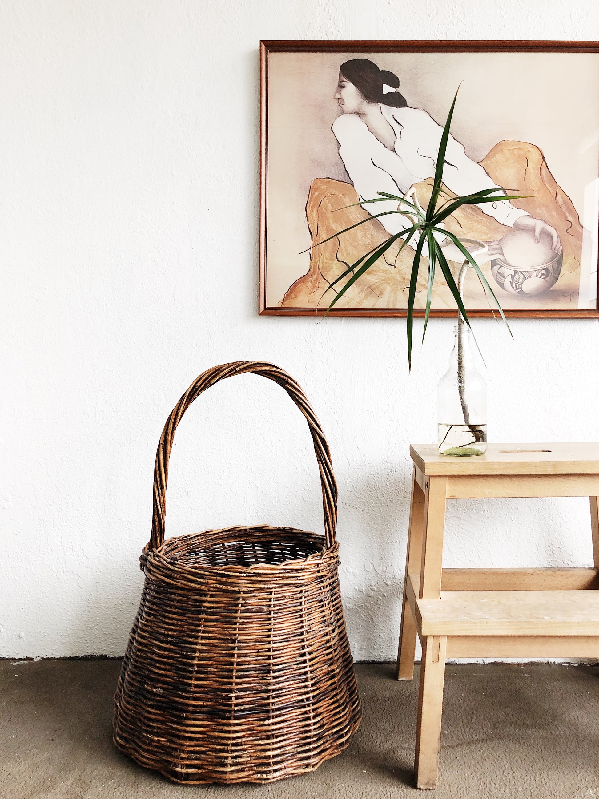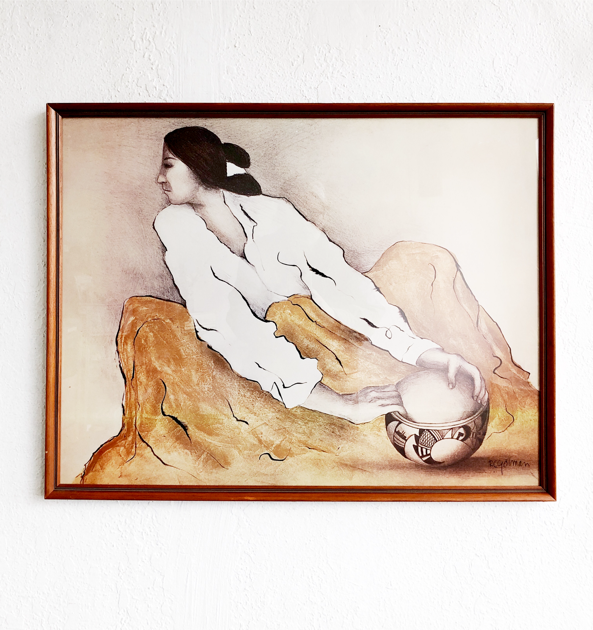 Beautiful colors and tones to this RC Gorman lithograph titled the Pottery keeper. Framed under glass in vintage wood.
