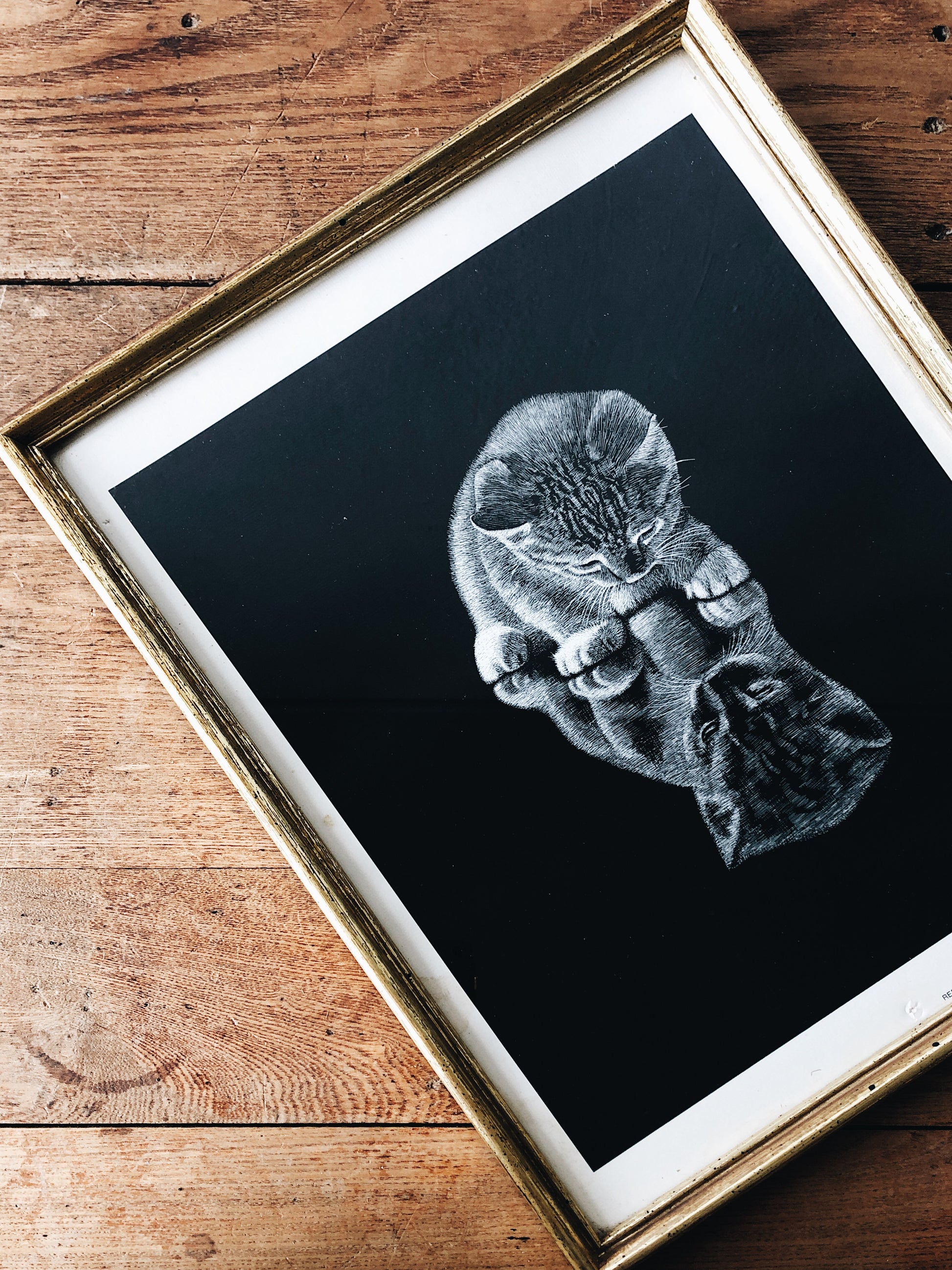 Vintage litho circa 1975 titled Reflections. Super cute kitten art piece by Droguett. Framed in gold leafed wood under glass