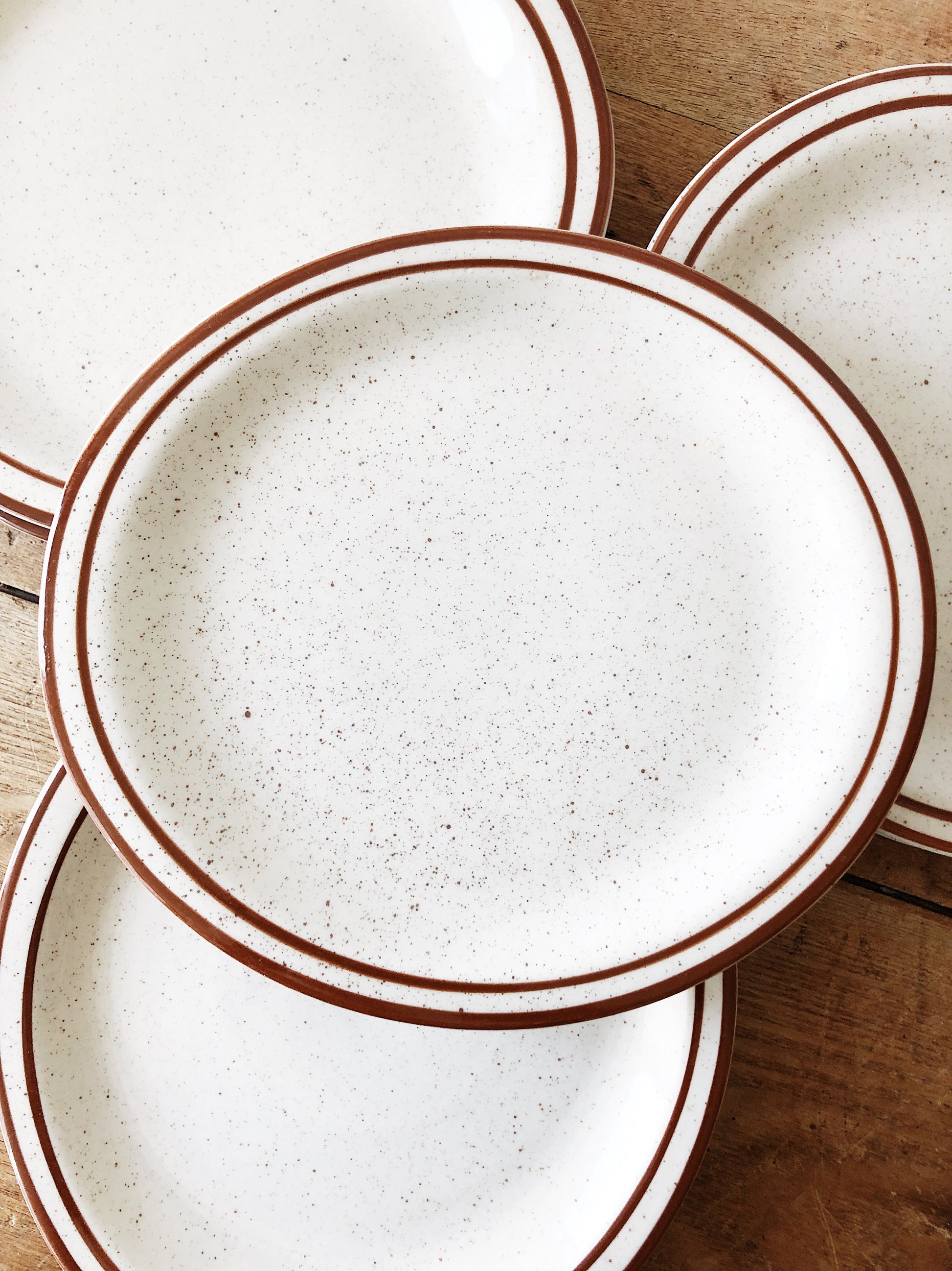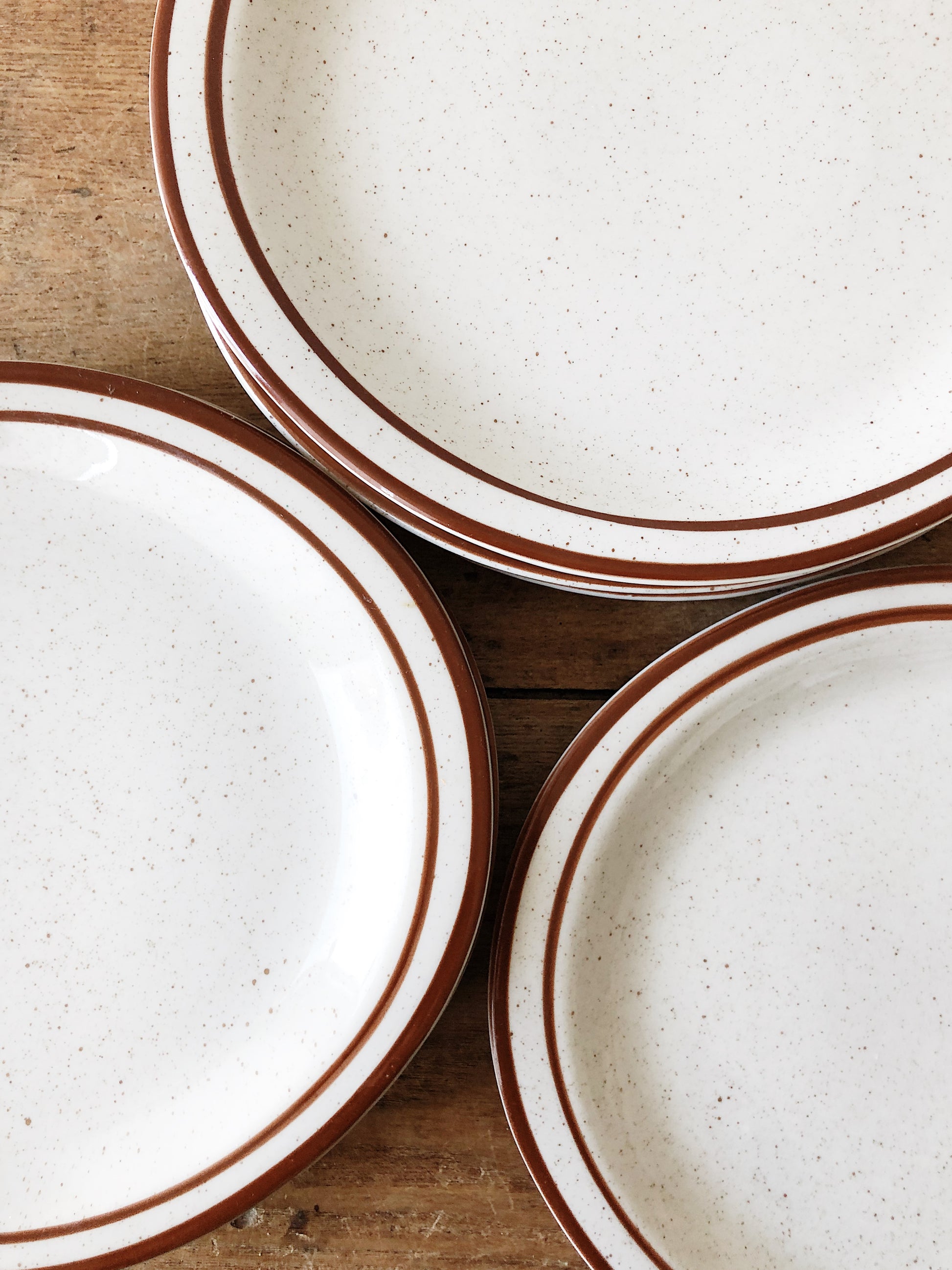 Seven oval shaped dinner plates in a specked stoneware with brown rim. Hearty Rego Diner ware can go from oven to table.
