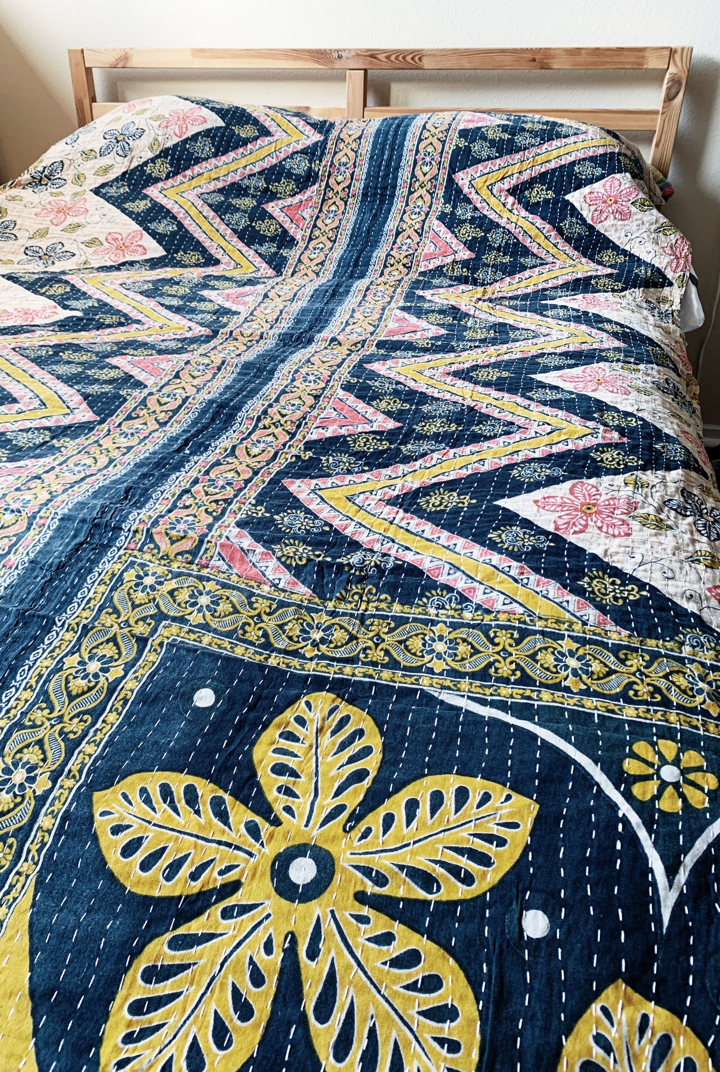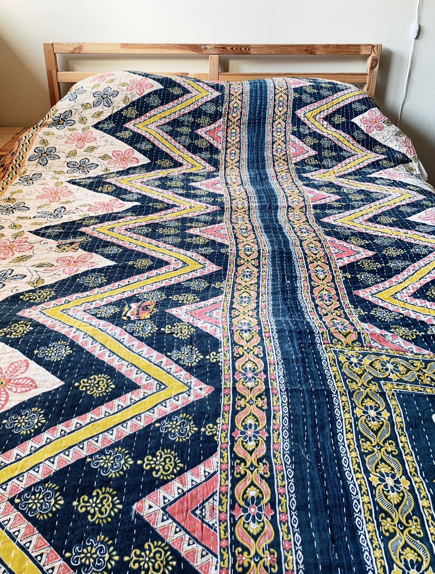 Another beautiful vintage cotton kantha quilt! This one is so fun. Two quilts in one, excellent condition. Photographed on a full size bed.