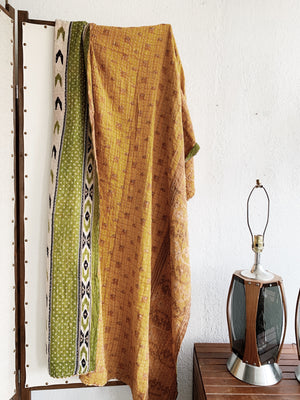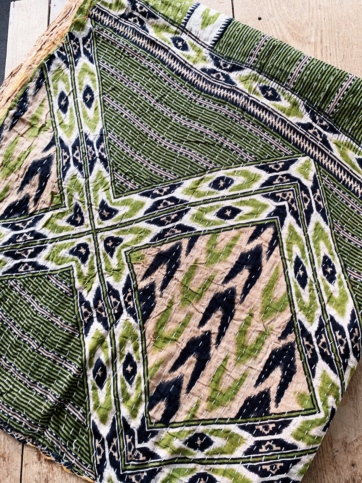 Such a beautiful piece of textile art. Reversible vintage kantha quilt with really pretty colors and patterning. Olive, indigo and salmon on one side, reverses to mustard. Excellent condition.