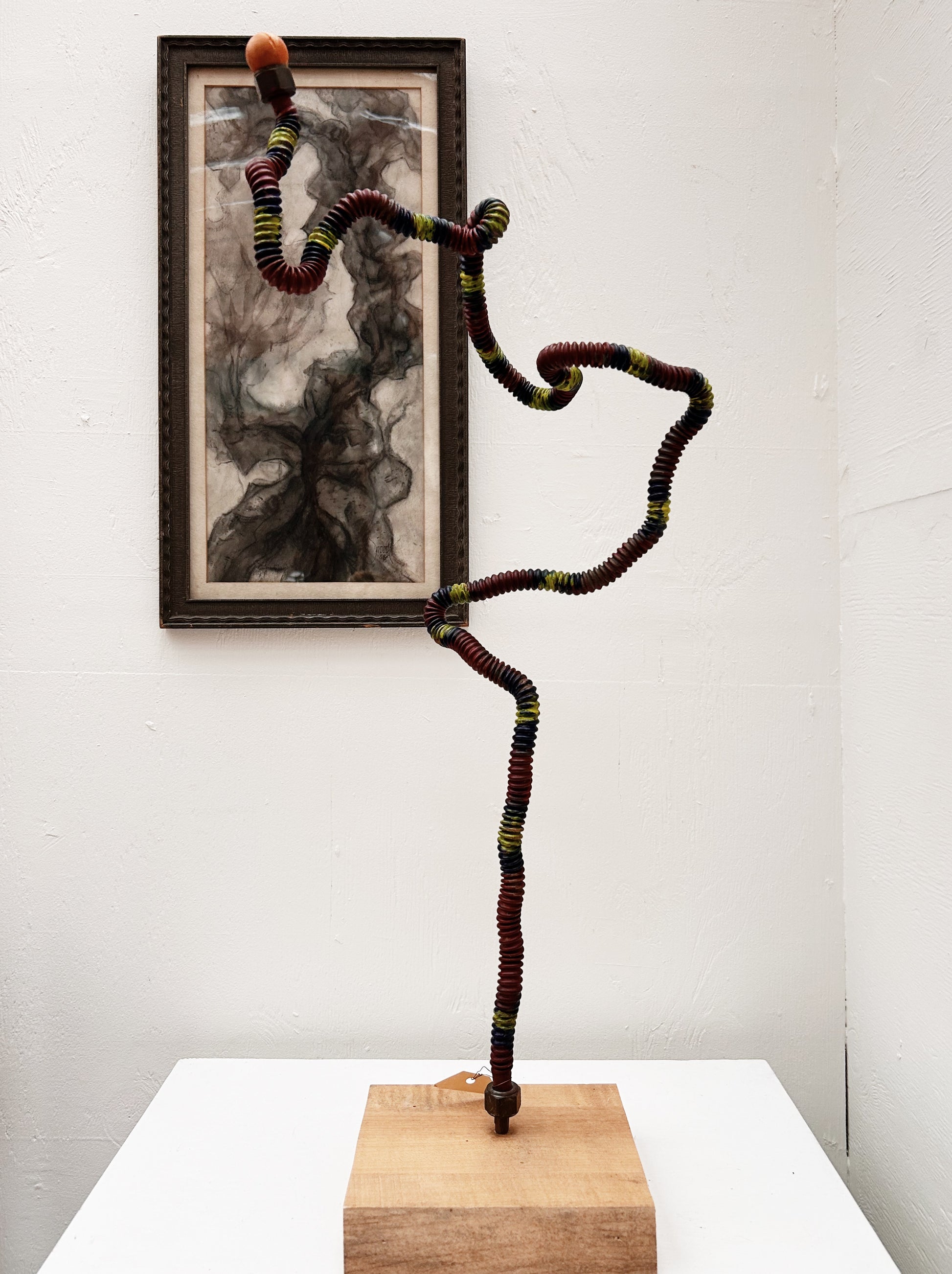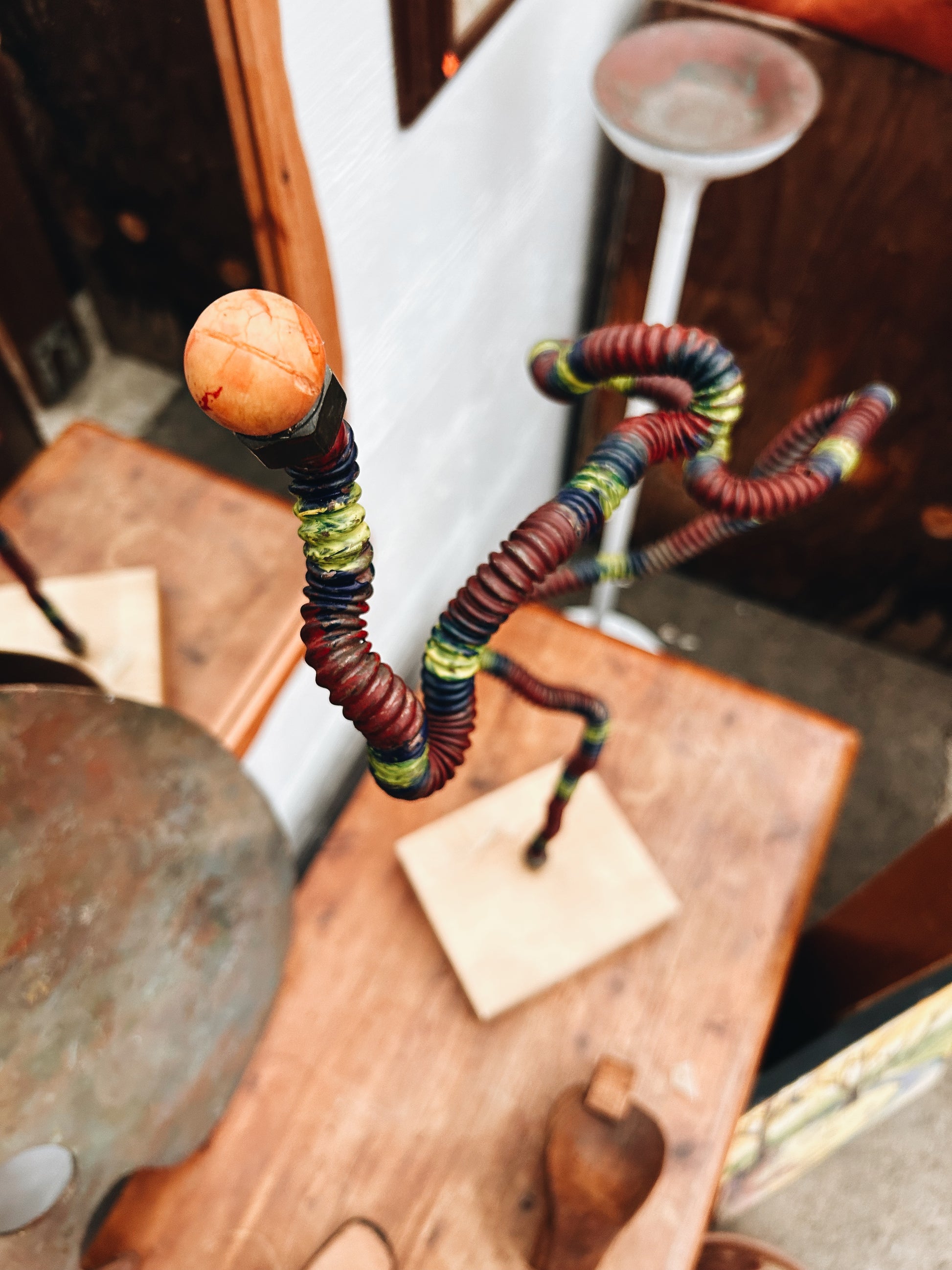 Sculpture by Robert McWilliams, Oregon based woodcarver and sculptor who makes a variety of creations including "visionary spoons", wood and metal constructions, signs and lighting. This titled 'bendable ethics' is made from bendable steel, rubber, wood and paint.