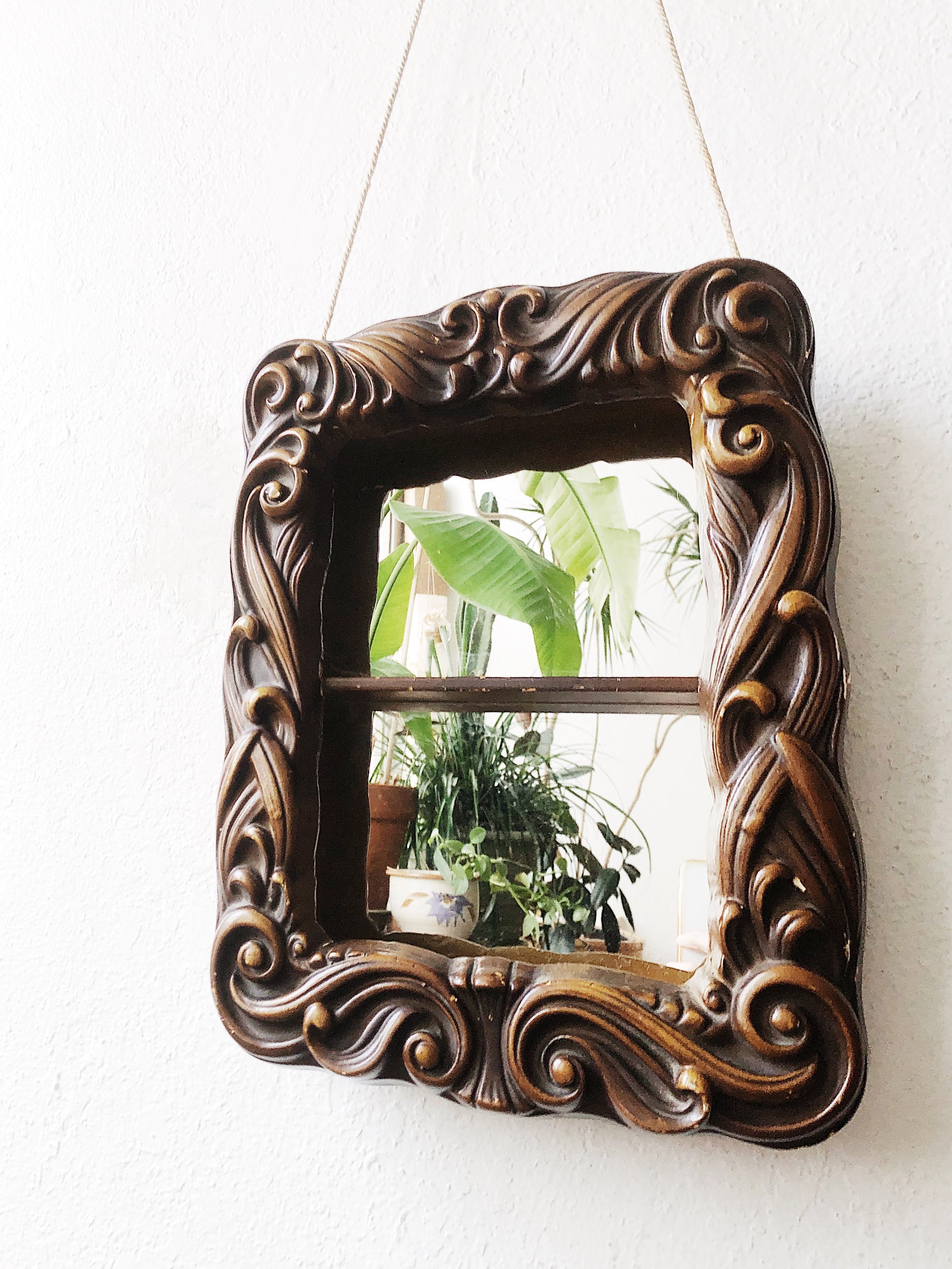 Shadowbox style mirror with a small shelf inside and in the bottom. We think plant starts would be lovely living here. Deeply incised design. Gesso wood. Hangs from cording