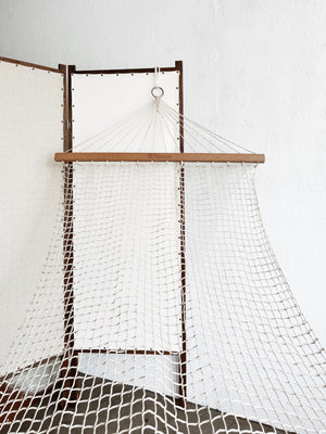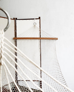 Nylon rope and resin frame make this a weather resistant place to hang. Try it in a bedroom or family room too. All nylon netted rope. Zinc loops for hanging. Best for a single napper. Made in USA